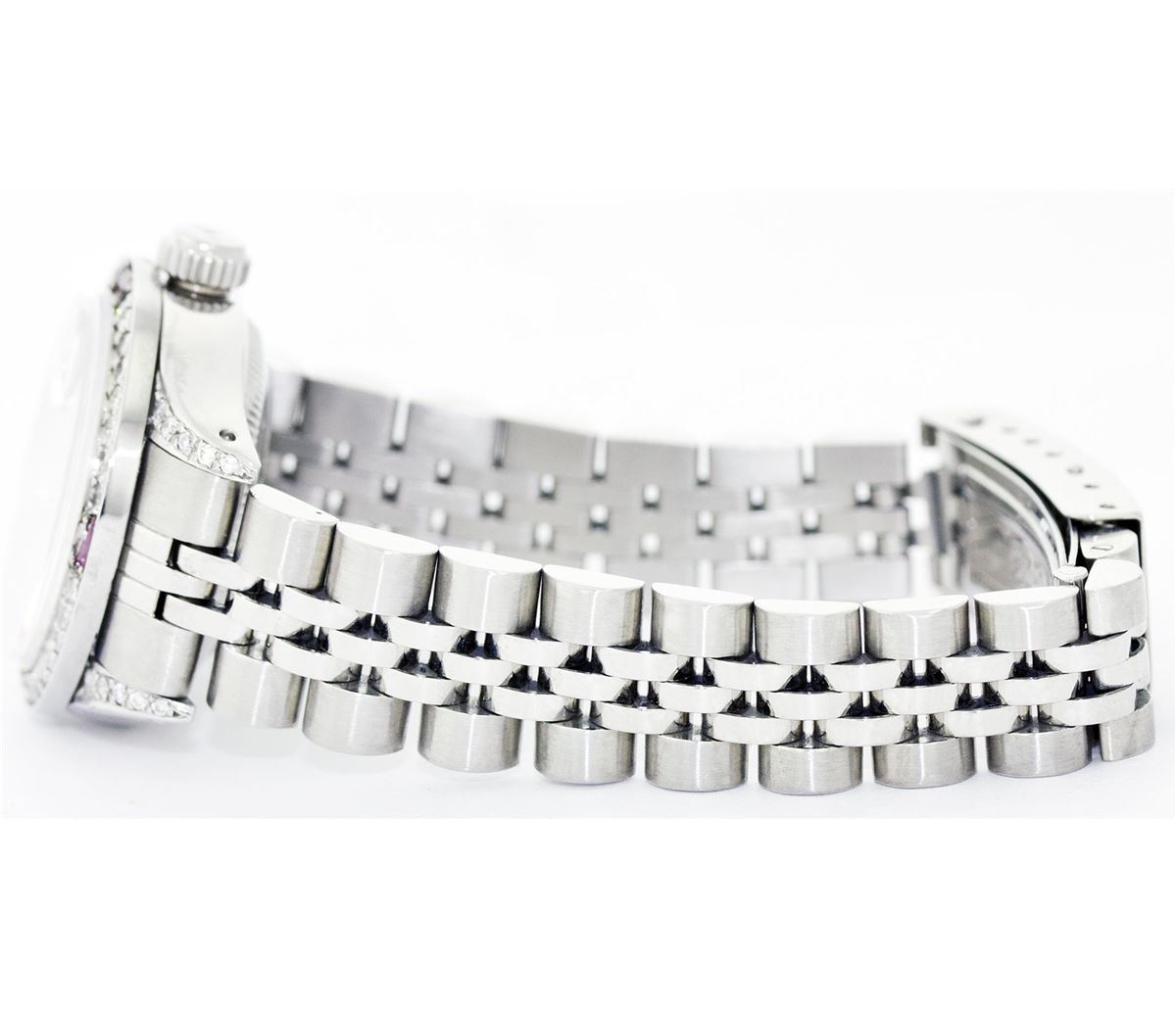 One Ladies Rolex Datejust Polished Bright with Satin Finish, Serviced & Electronically Tested, Stainless Steel Case With Diamond Lugs, Clarity: SI-VS, Color: G to H Case Size:26mm, Stainless Steel Crown, Custom Bezel: 18K White Gold Ruby Beadset Diamond Bezel, Diamond Count: 28 Diamonds + 4 Rubies Total Weight .70 Carat, Clarity: SI-VS, Color: G to H. Custom Crystal: Synthetic Sapphire Cyclops Lens. Movement: Automatic Winding Movement Caliber 2030. Custom Dial: Refinished light Pink Mother Of Pearl With Diamond Hour Markers, Diamond Count: 10 Diamonds, Clarity: SI-VS, to H. Date Window: 3 O'Clock Position Date Display, Non Quickset, Model: 6917 Condition: G-6 Extra Fine. Bracelet: Stainless Steel Jubilee. Bright Polish & Satin Finish. 5.5 Inch Length, Adjustable. Standard Clasp, With Rolex Logo.