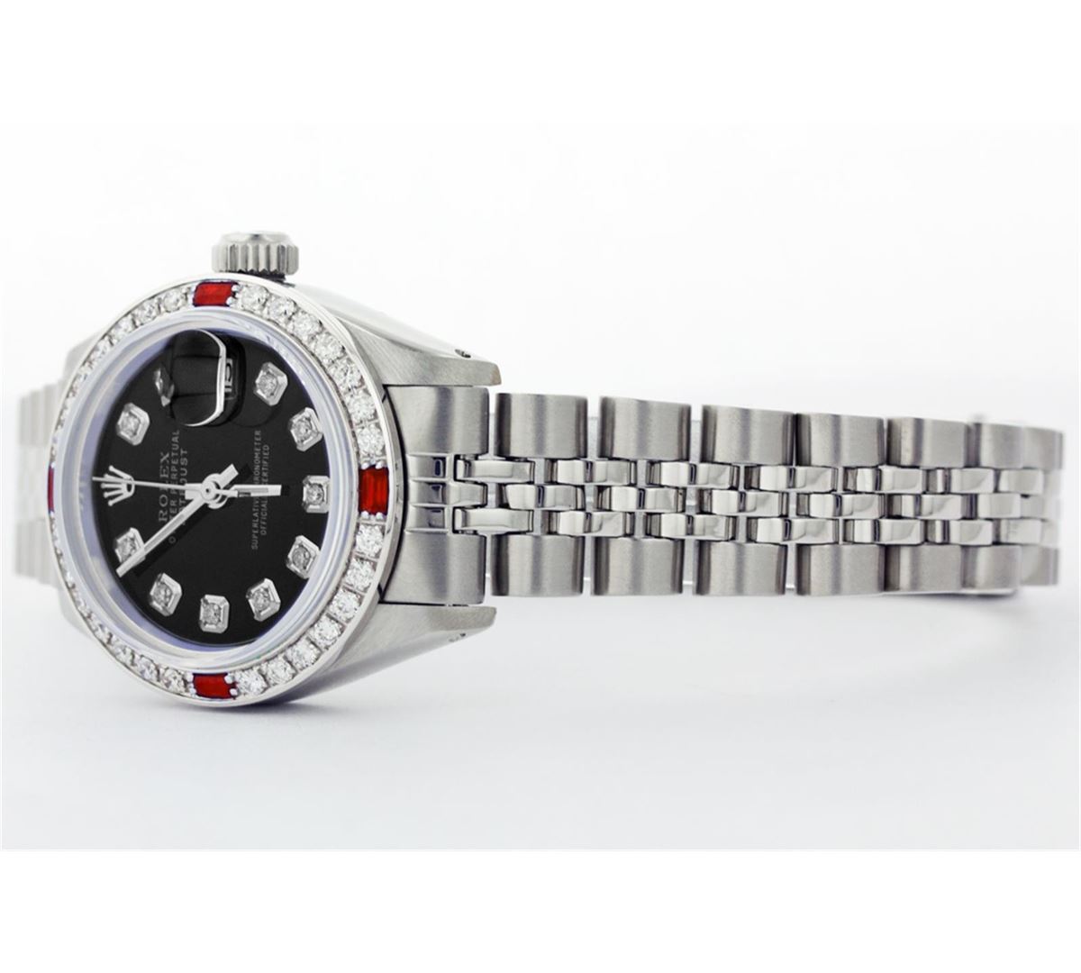 One Ladies Rolex Datejust Polished Bright with Satin Finish, Serviced & Electronically Tested, Stainless Steel Case:26mm, Stainless Steel Crown, Custom Bezel: 18K White Gold Ruby Beadset Diamond Bezel, Diamond Count: 28 Diamonds + 4 Rubies Total Weight .70 Carat, Clarity: SI-VS, Color: G to H. Custom Crystal: Synthetic Sapphire Cyclops Lens. Movement: Automatic Winding Movement Caliber 2030. Custom Dial: Black Dial with Diamond Hour Markers. Clarity: SI-VS, Color: G to H. Date Window: 3 O'Clock Position Date Display, Model: 6917 Condition: G-6 Extra Fine. Bracelet: Stainless Steel Jubilee Band. Non quickset. Bright Polish & Satin Finish. 5.5 Inch Length, Adjustable. Standard Clasp, With Rolex Logo.