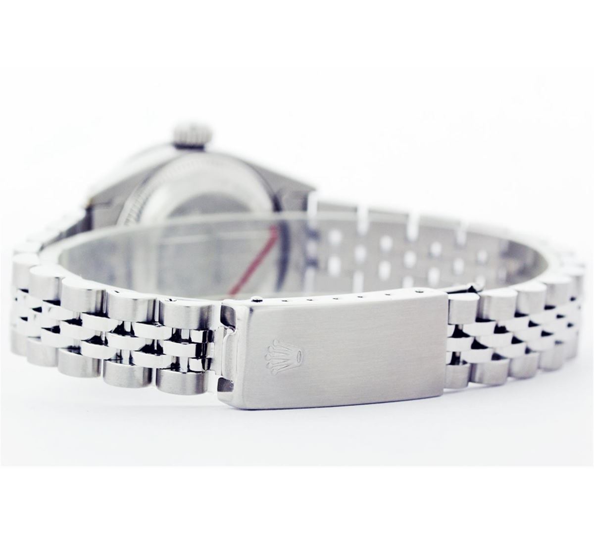 One Ladies Rolex Datejust Polished Bright with Satin Finish, Serviced & Electronically Tested, Stainless Steel Case:26mm, Stainless Steel Crown, Custom Bezel: 18K White Gold Ruby Beadset Diamond Bezel, Diamond Count: 28 Diamonds + 4 Rubies Total Weight .70 Carat, Clarity: SI-VS, Color: G to H. Custom Crystal: Synthetic Sapphire Cyclops Lens. Movement: Automatic Winding Movement Caliber 2030. Custom Dial: Black Dial with Diamond Hour Markers. Clarity: SI-VS, Color: G to H. Date Window: 3 O'Clock Position Date Display, Model: 6917 Condition: G-6 Extra Fine. Bracelet: Stainless Steel Jubilee Band. Non quickset. Bright Polish & Satin Finish. 5.5 Inch Length, Adjustable. Standard Clasp, With Rolex Logo.