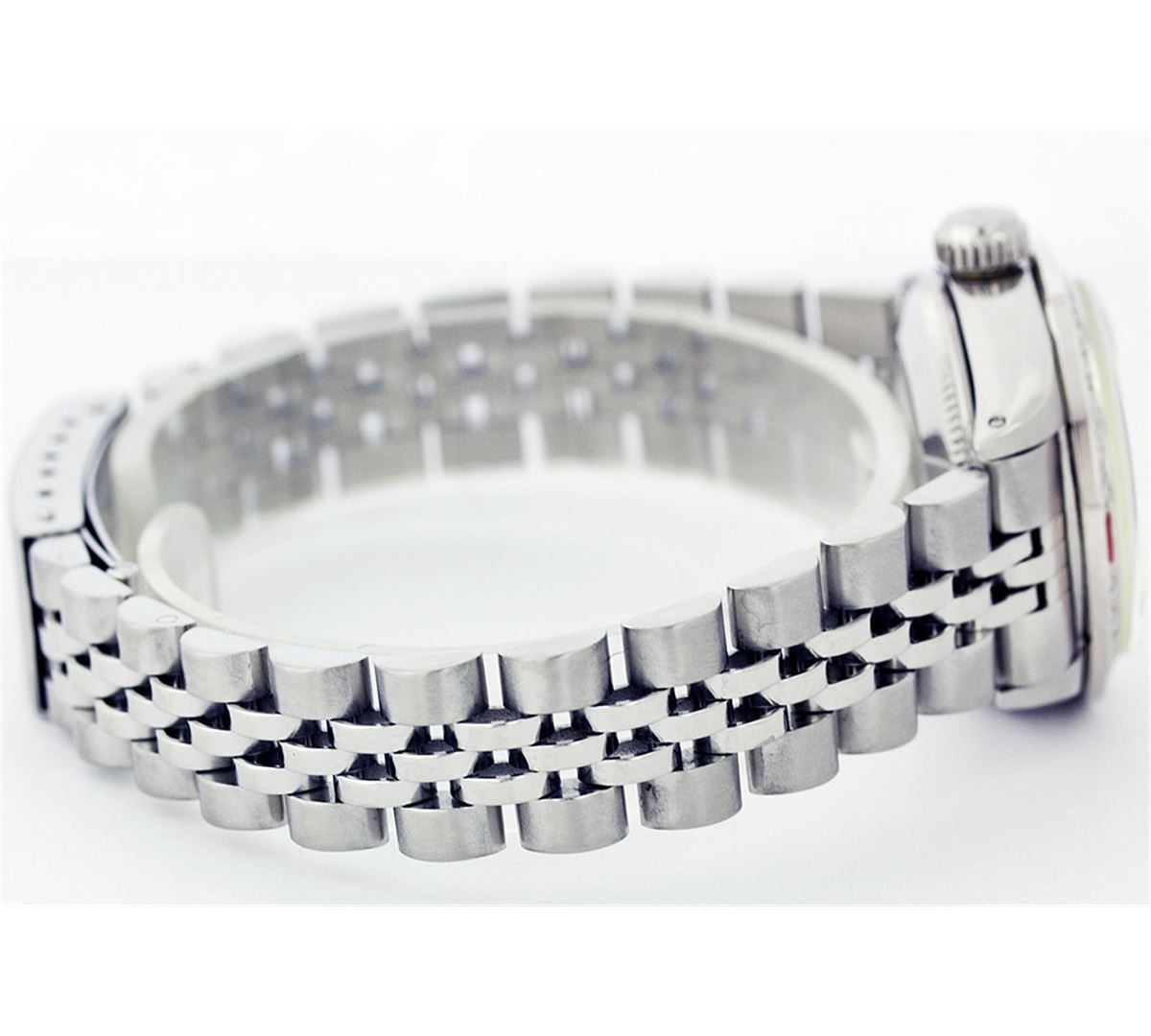 One Ladies Rolex Datejust Polished Bright with Satin Finish, Serviced & Electronically Tested, Stainless Steel Case:26mm, Stainless Steel Crown, Custom Bezel: 18K White Gold Ruby Beadset Diamond Bezel, Diamond Count: 28 Diamonds + 4 Rubies Total Weight .70 Carat, Clarity: SI-VS, Color: G to H. Custom Crystal: Synthetic Sapphire Cyclops Lens. Movement: Automatic Winding Movement Caliber 2030. Custom Dial: Mother Of Pearl Diamond Dial, Diamond Count: 10 Diamonds In Dial, Clarity: SI-VS, to H. Date Window: 3 O'Clock Position Date Display, Non Quickset, Model: 6917 Condition: G-6 Extra Fine. Bracelet: Stainless Steel Jubilee Band. Bright Polish & Satin Finish. 5.5 Inch Length, Adjustable. Standard Clasp, With Rolex Logo.