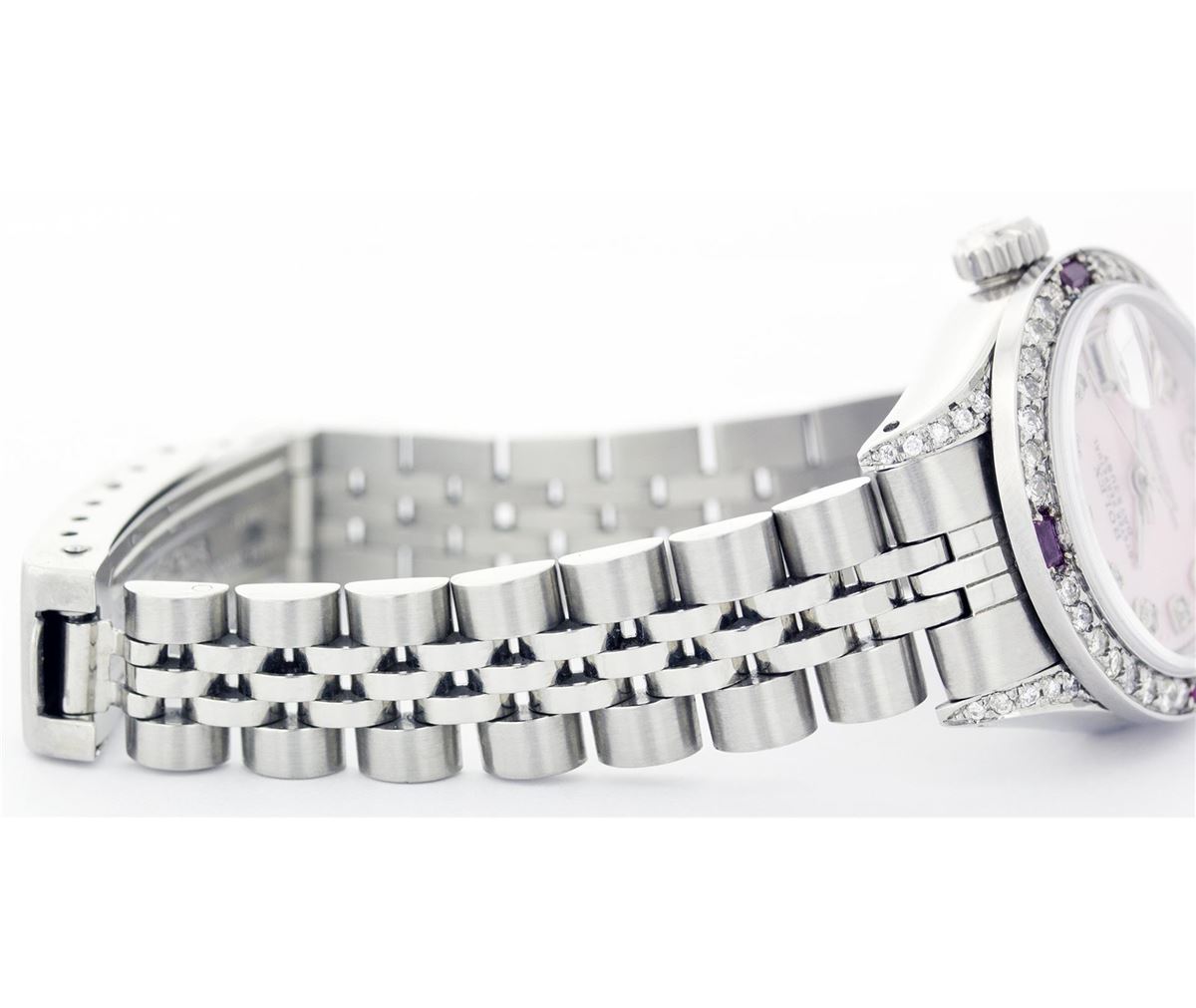 One Ladies Rolex Datejust Polished Bright with Satin Finish, Serviced & Electronically Tested, Stainless Steel Case With Diamond Lugs, Clarity: SI-VS, Color: G to H Case Size:26mm, Stainless Steel Crown, Custom Bezel: 18K White Gold Ruby Beadset Diamond Bezel, Diamond Count: 28 Diamonds + 4 Rubies Total Weight .70 Carat, Clarity: SI-VS, Color: G to H. Custom Crystal: Synthetic Sapphire Cyclops Lens. Movement: Automatic Winding Movement Caliber 2030. Custom Dial: Refinished light Pink Mother Of Pearl With Diamond Hour Markers, Diamond Count: 10 Diamonds, Clarity: SI-VS, to H. Date Window: 3 O'Clock Position Date Display, Non Quickset, Model: 6917 Condition: G-6 Extra Fine. Bracelet: Stainless Steel Jubilee. Bright Polish & Satin Finish. 5.5 Inch Length, Adjustable. Standard Clasp, With Rolex Logo.
