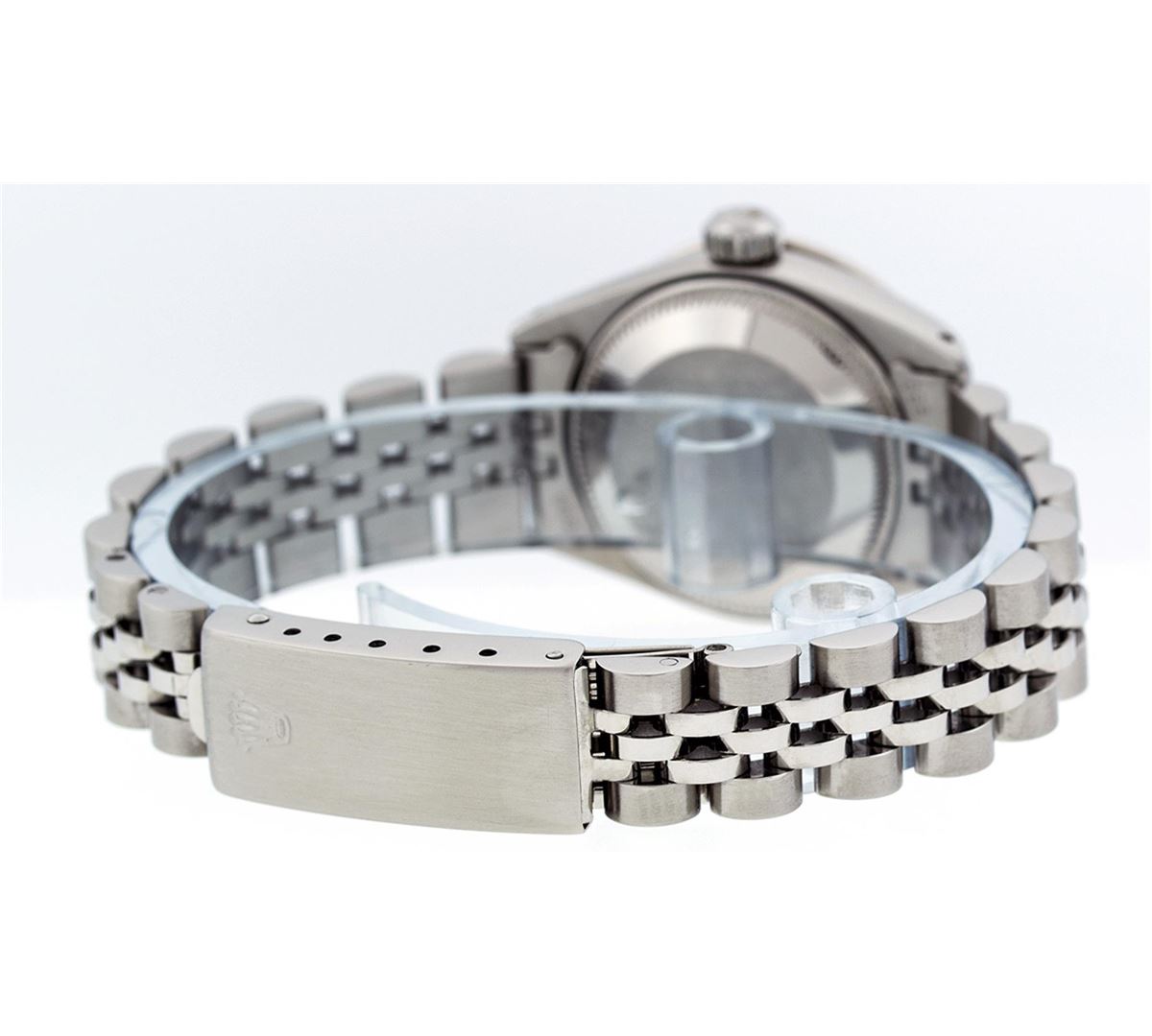 Ladies Rolex Datejust Polished Bright with Satin Finish, Serviced & Electronically Tested, Stainless Steel Case:26mm, Stainless Steel Crown, Custom Bezel: 18K White Gold Ruby Beadset Diamond Bezel, Diamond + Gem Count: 28 Diamonds + 4 Ruby. Total Weight .70 Carat, Clarity: SI-VS, Color: G to H. Custom Crystal: Synthetic Sapphire Cyclops Lens. Movement: Automatic Winding Movement Caliber 2030. Custom Dial: Refinished Ice Green With Diamond Hour Markers. Diamond Count: 10 Diamonds, Color: G To H, Clarity: SI-VS. Date Window: 3 O'Clock Position Date Display, Model: Datejust. Condition: G-6 Extra Fine. Bracelet: Stainless Steel Jubilee. Bright Polish & Satin Finish. 6.0 Inch Length, Adjustable. Standard Clasp, With Rolex Logo. Comes with 6 month warranty.