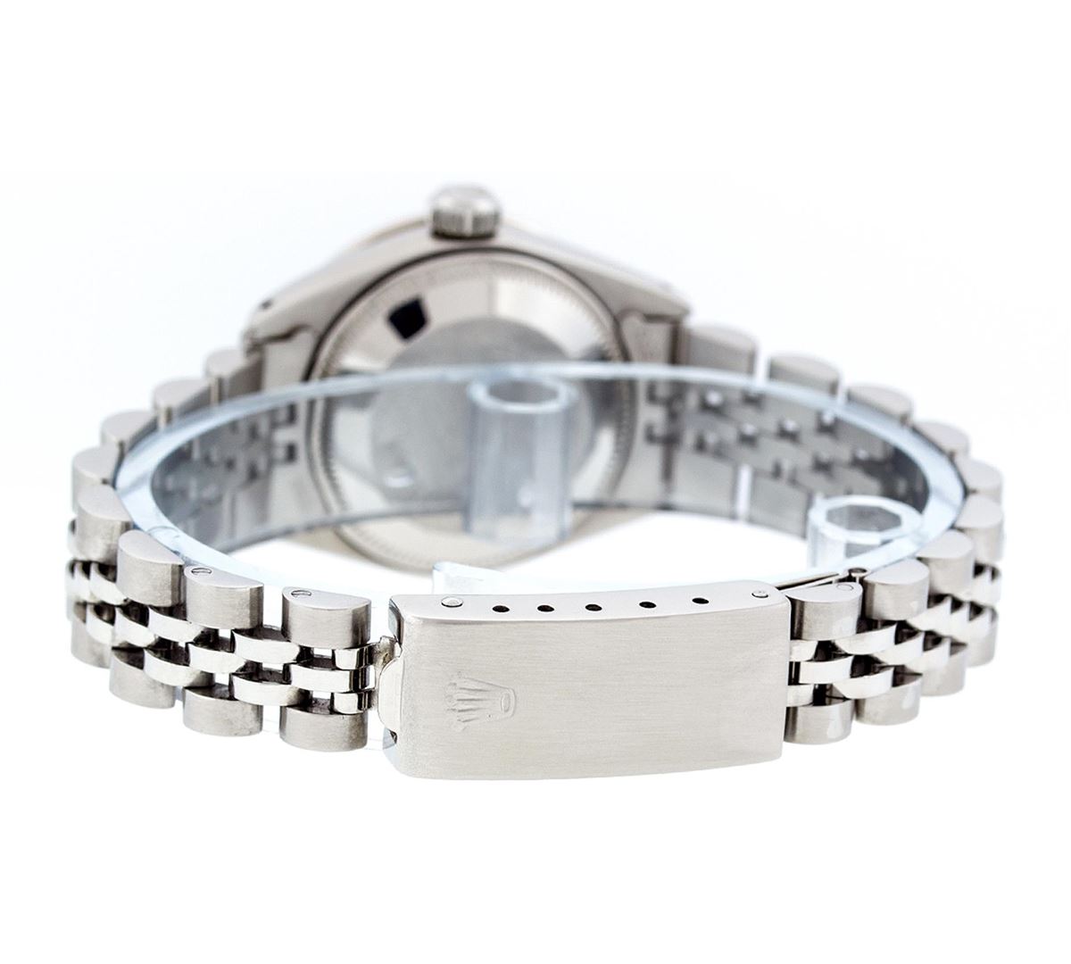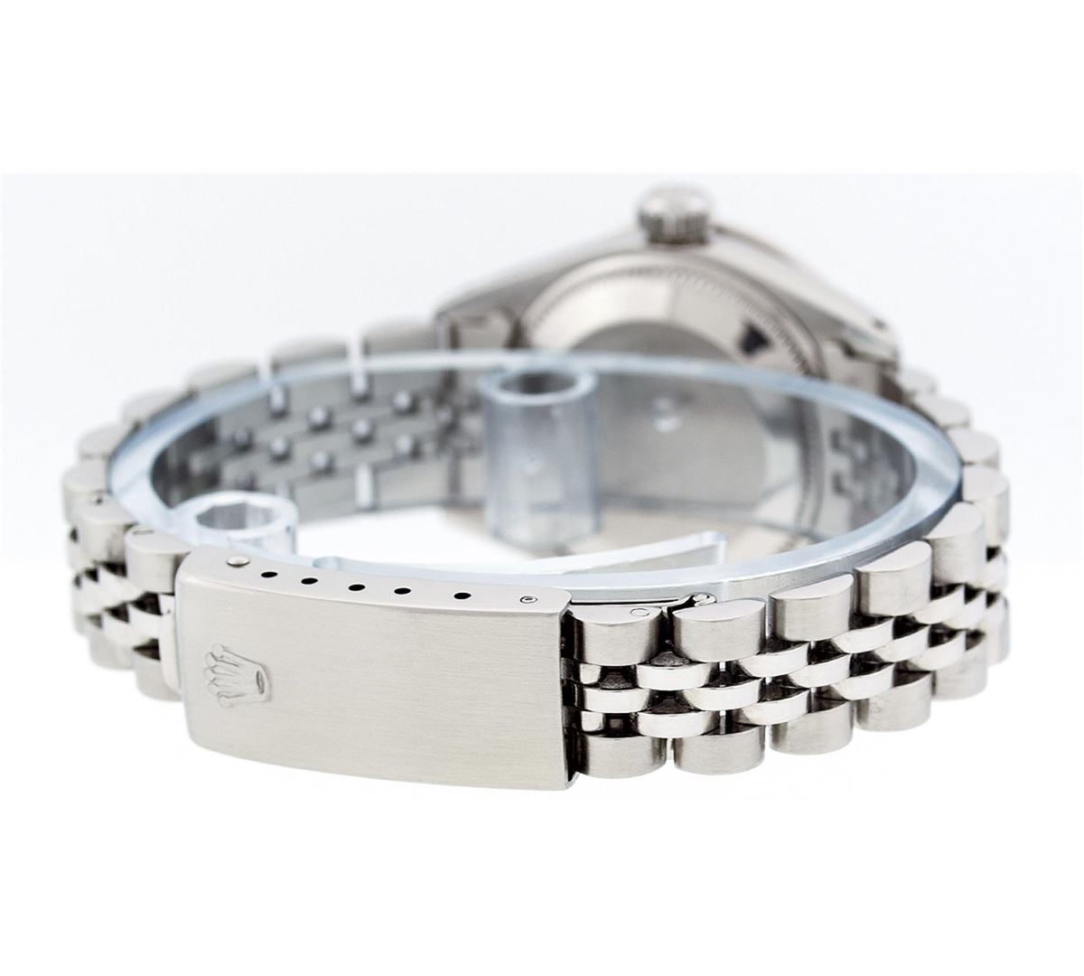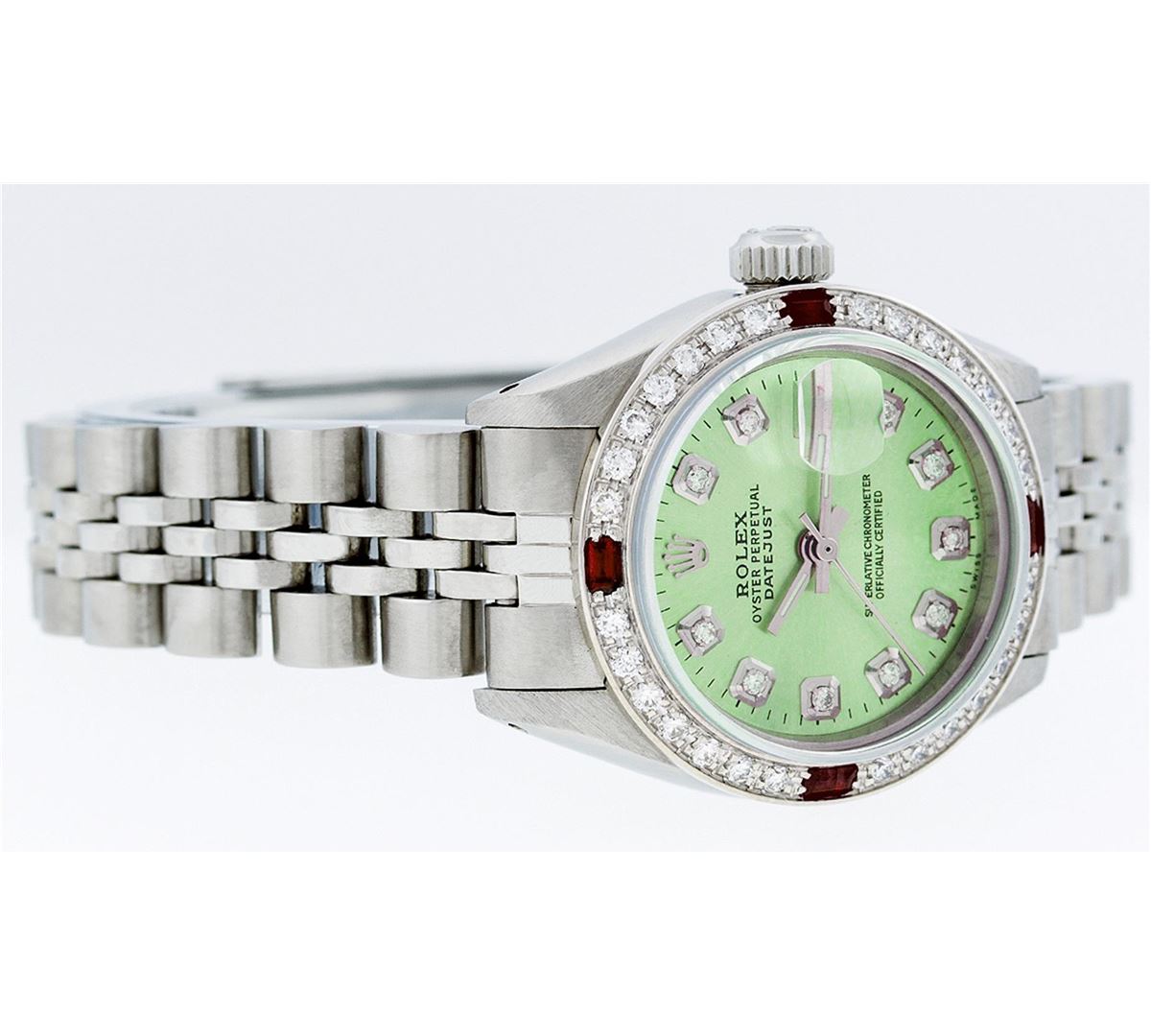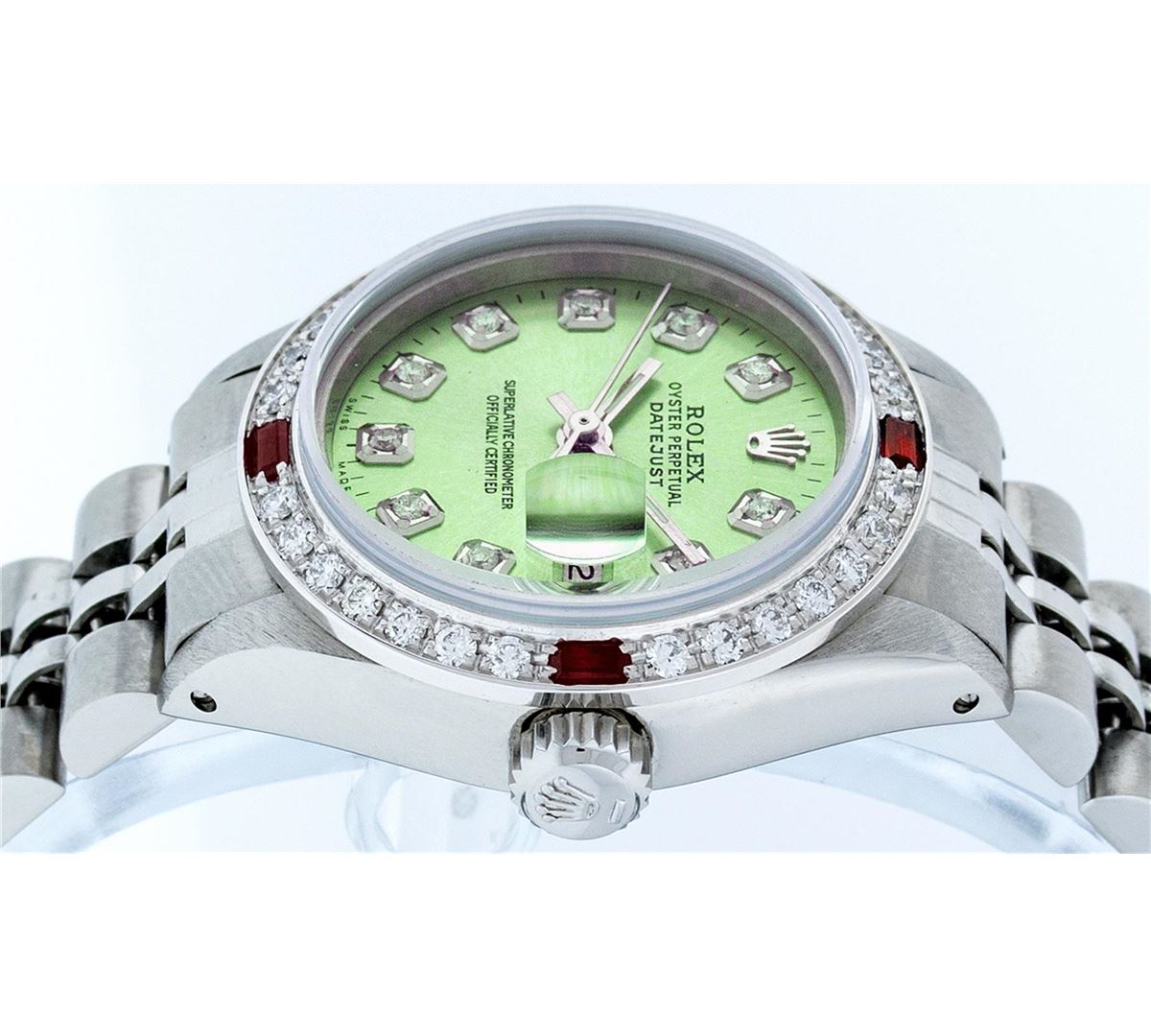 Ladies Rolex Datejust Polished Bright with Satin Finish, Serviced & Electronically Tested, Stainless Steel Case:26mm, Stainless Steel Crown, Custom Bezel: 18K White Gold Ruby Beadset Diamond Bezel, Diamond + Gem Count: 28 Diamonds + 4 Ruby. Total Weight .70 Carat, Clarity: SI-VS, Color: G to H. Custom Crystal: Synthetic Sapphire Cyclops Lens. Movement: Automatic Winding Movement Caliber 2030. Custom Dial: Refinished Ice Green With Diamond Hour Markers. Diamond Count: 10 Diamonds, Color: G To H, Clarity: SI-VS. Date Window: 3 O'Clock Position Date Display, Model: Datejust. Condition: G-6 Extra Fine. Bracelet: Stainless Steel Jubilee. Bright Polish & Satin Finish. 6.0 Inch Length, Adjustable. Standard Clasp, With Rolex Logo. Comes with 6 month warranty.