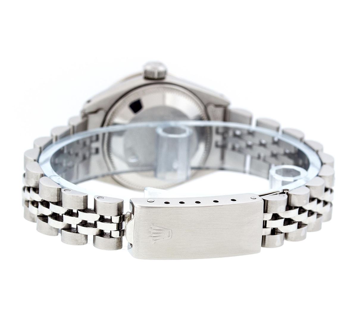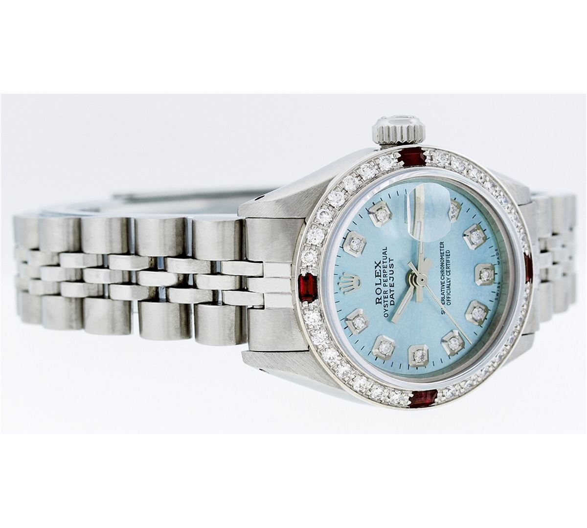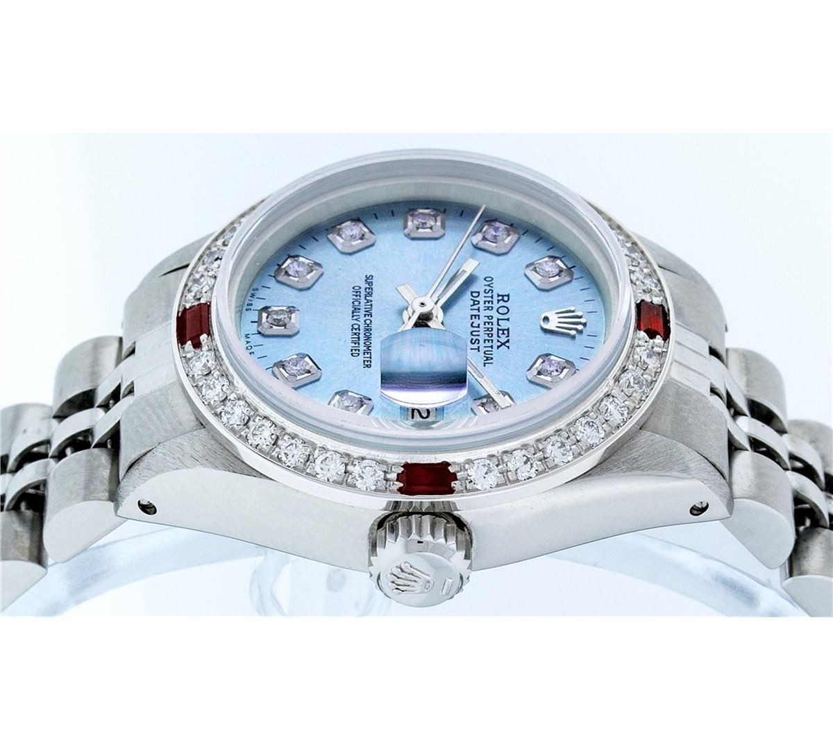 Ladies Rolex Datejust Polished Bright with Satin Finish, Serviced & Electronically Tested, Stainless Steel Case:26mm, Stainless Steel Crown, Custom Bezel: 18K White Gold Ruby Beadset Diamond Bezel, Diamond + Gem Count: 28 Diamonds + 4 Ruby. Total Weight .70 Carat, Clarity: SI-VS, Color: G to H. Custom Crystal: Synthetic Sapphire Cyclops Lens. Movement: Automatic Winding Movement Caliber 2030. Custom Dial: Refinished Sky Blue With Diamond Hour Markers. Diamond Count: 10 Diamonds, Color: G To H, Clarity: SI-VS. Date Window: 3 O'Clock Position Date Display, Model: Datejust. Condition: G-6 Extra Fine. Bracelet: Stainless Steel Jubilee. Bright Polish & Satin Finish. 6.0 Inch Length, Adjustable. Standard Clasp, With Rolex Logo. Comes with 6 month warranty.