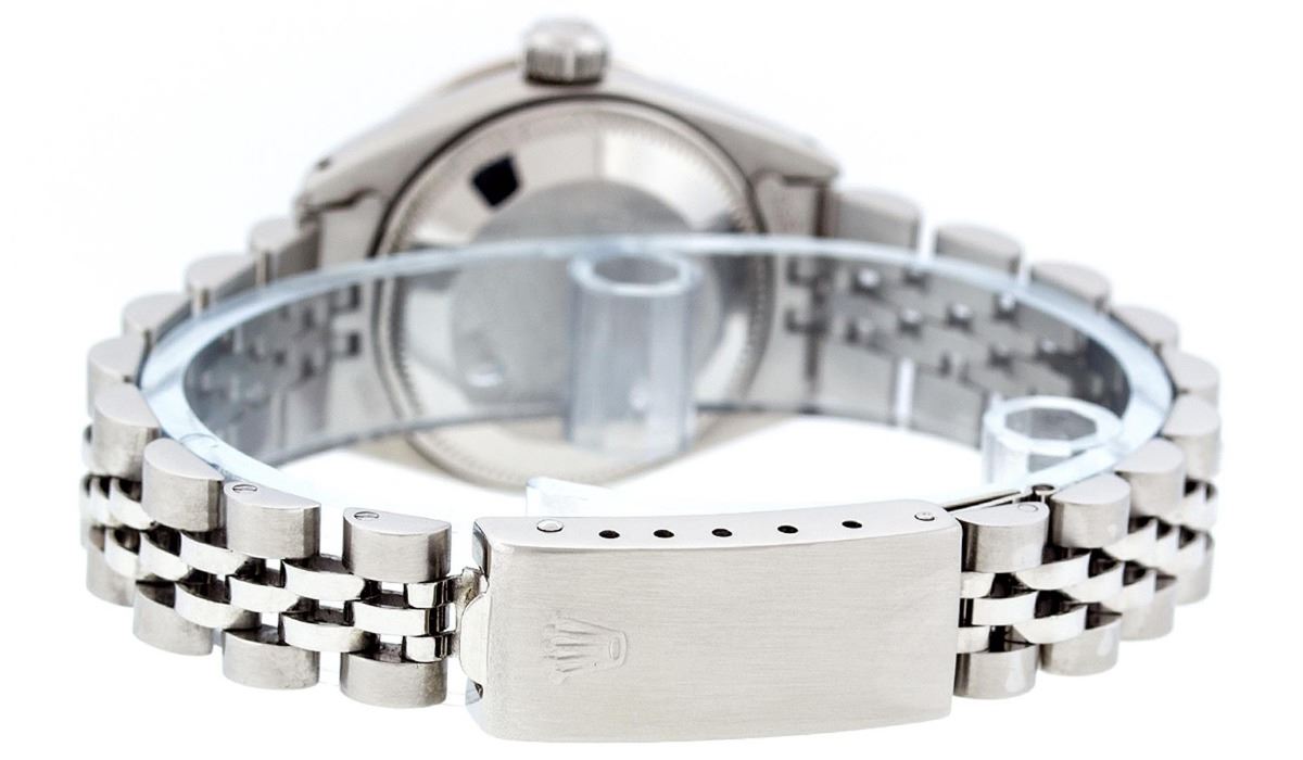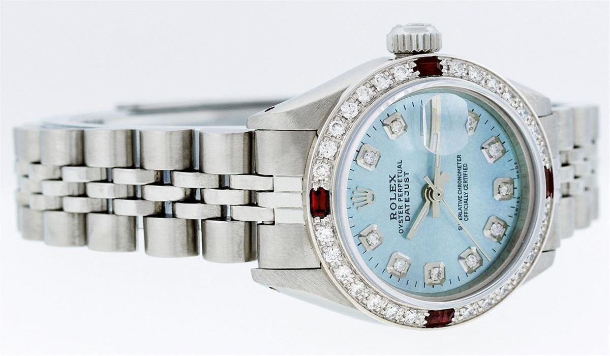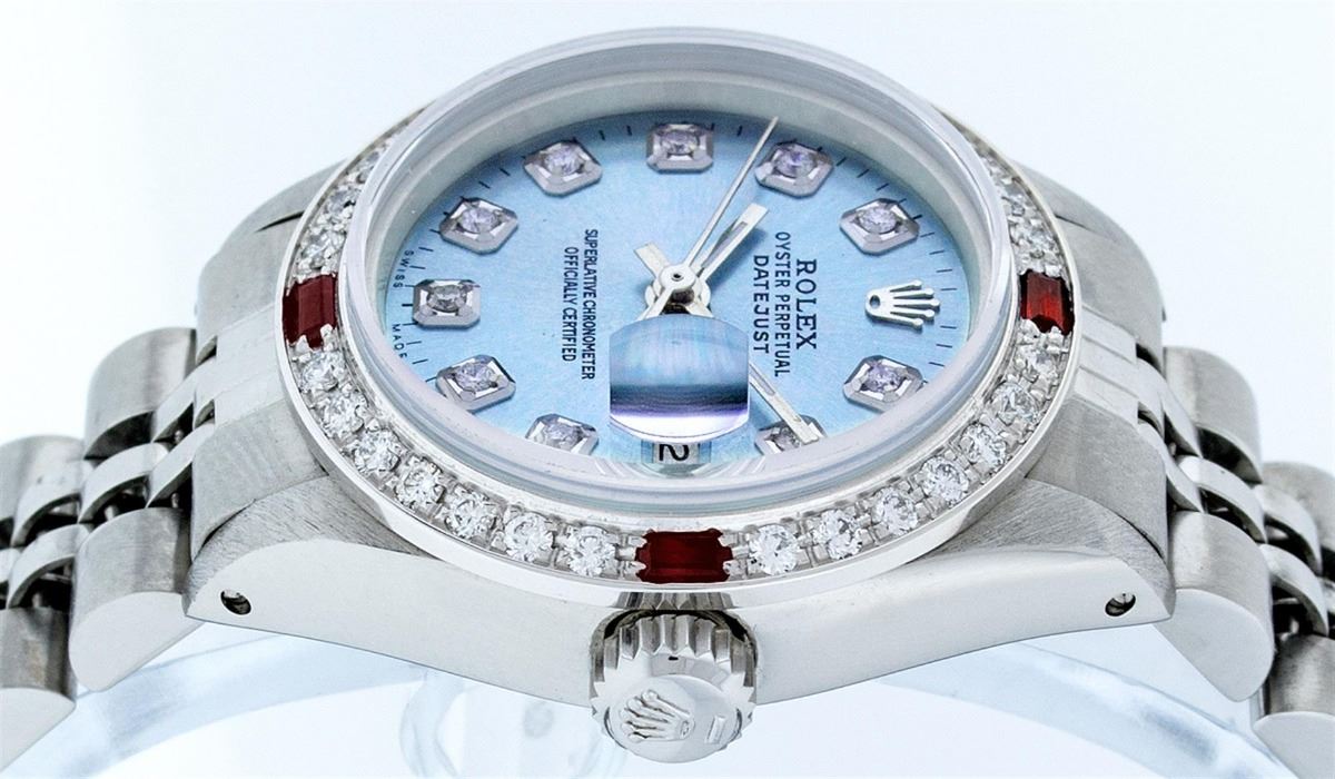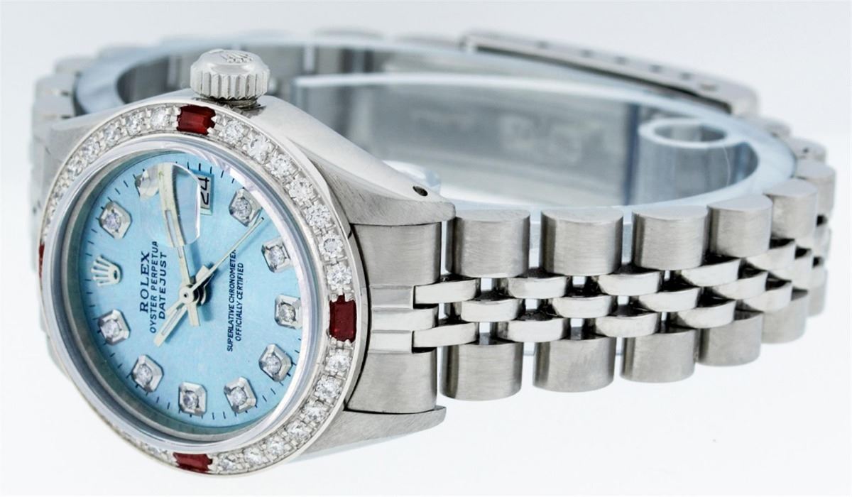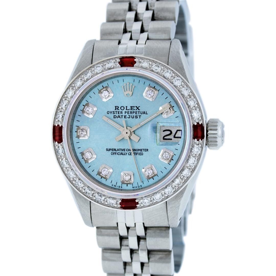 Ladies Rolex Datejust Polished Bright with Satin Finish, Serviced & Electronically Tested, Stainless Steel Case:26mm, Stainless Steel Crown, Custom Bezel: 18K White Gold Ruby Beadset Diamond Bezel, Diamond + Gem Count: 28 Diamonds + 4 Ruby. Total Weight .70 Carat, Clarity: SI-VS, Color: G to H. Custom Crystal: Synthetic Sapphire Cyclops Lens. Movement: Automatic Winding Movement Caliber 2030. Custom Dial: Refinished Sky Blue With Diamond Hour Markers. Diamond Count: 10 Diamonds, Color: G To H, Clarity: SI-VS. Date Window: 3 O'Clock Position Date Display, Model: Datejust. Condition: G-6 Extra Fine. Bracelet: Stainless Steel Jubilee. Bright Polish & Satin Finish. 6.0 Inch Length, Adjustable. Standard Clasp, With Rolex Logo. Comes with 6 month warranty.