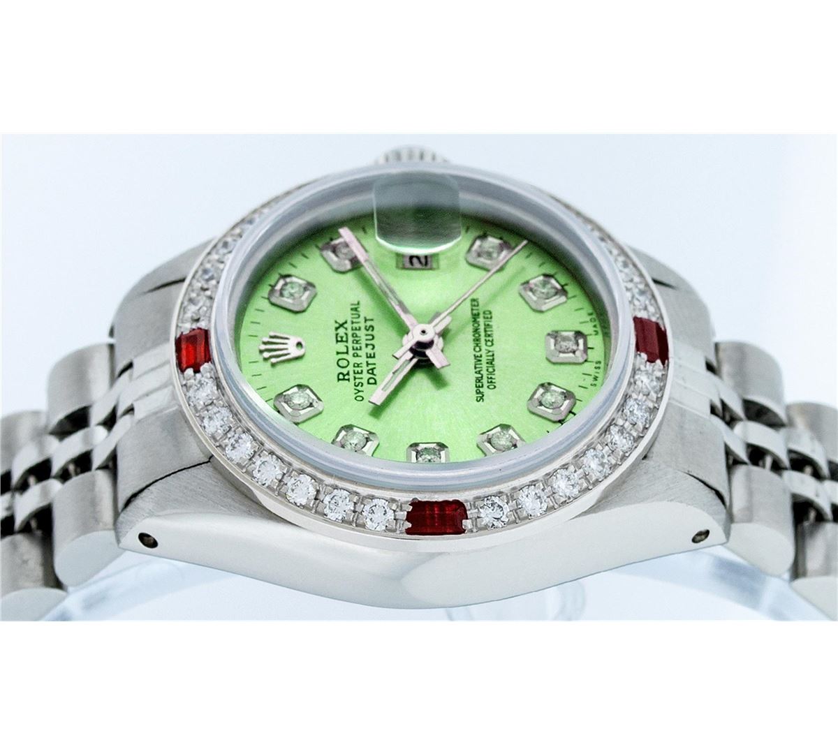 Ladies Rolex Datejust Polished Bright with Satin Finish, Serviced & Electronically Tested, Stainless Steel Case:26mm, Stainless Steel Crown, Custom Bezel: 18K White Gold Ruby Beadset Diamond Bezel, Diamond + Gem Count: 28 Diamonds + 4 Ruby. Total Weight .70 Carat, Clarity: SI-VS, Color: G to H. Custom Crystal: Synthetic Sapphire Cyclops Lens. Movement: Automatic Winding Movement Caliber 2030. Custom Dial: Refinished Ice Green With Diamond Hour Markers. Diamond Count: 10 Diamonds, Color: G To H, Clarity: SI-VS. Date Window: 3 O'Clock Position Date Display, Model: Datejust. Condition: G-6 Extra Fine. Bracelet: Stainless Steel Jubilee. Bright Polish & Satin Finish. 6.0 Inch Length, Adjustable. Standard Clasp, With Rolex Logo. Comes with 6 month warranty.