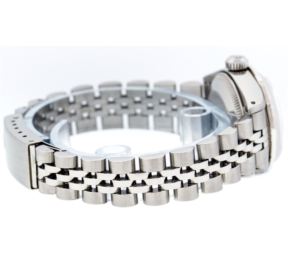 Ladies Rolex Datejust Polished Bright with Satin Finish, Serviced & Electronically Tested, Stainless Steel Case:26mm, Stainless Steel Crown, Custom Bezel: 18K White Gold Ruby Beadset Diamond Bezel, Diamond + Gem Count: 28 Diamonds + 4 Ruby. Total Weight .70 Carat, Clarity: SI-VS, Color: G to H. Custom Crystal: Synthetic Sapphire Cyclops Lens. Movement: Automatic Winding Movement Caliber 2030. Custom Dial: Refinished Ice Green With Diamond Hour Markers. Diamond Count: 10 Diamonds, Color: G To H, Clarity: SI-VS. Date Window: 3 O'Clock Position Date Display, Model: Datejust. Condition: G-6 Extra Fine. Bracelet: Stainless Steel Jubilee. Bright Polish & Satin Finish. 6.0 Inch Length, Adjustable. Standard Clasp, With Rolex Logo. Comes with 6 month warranty.