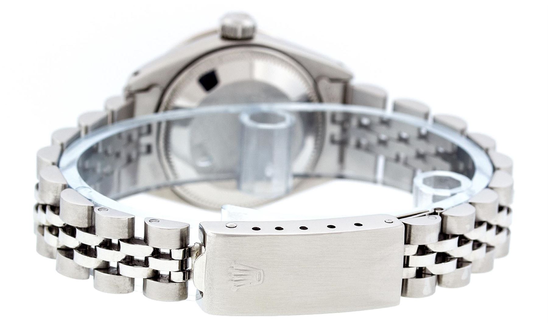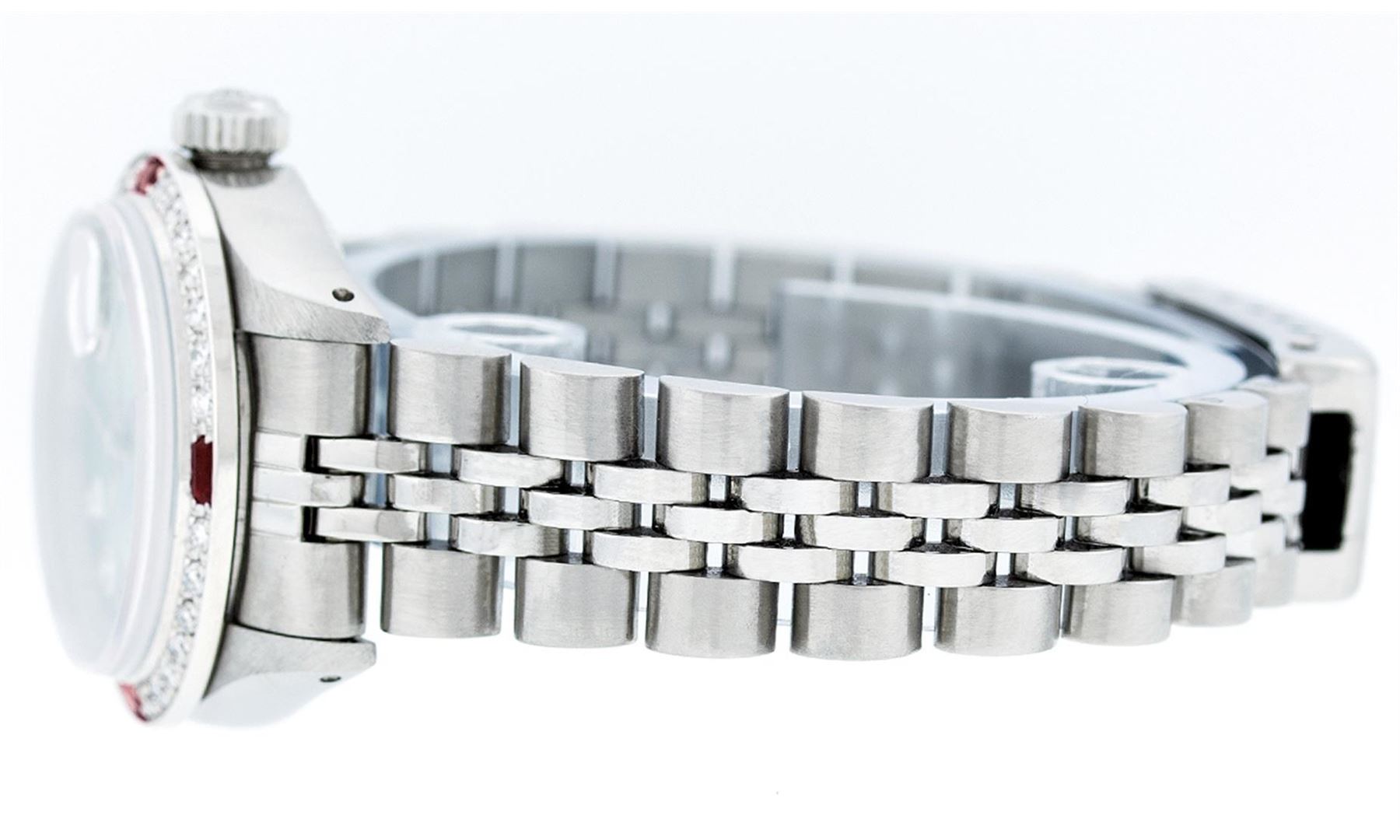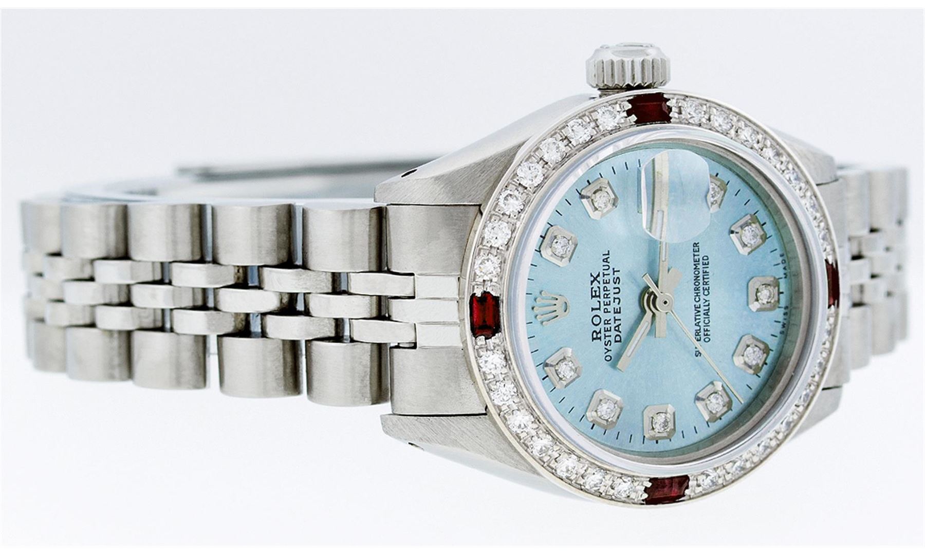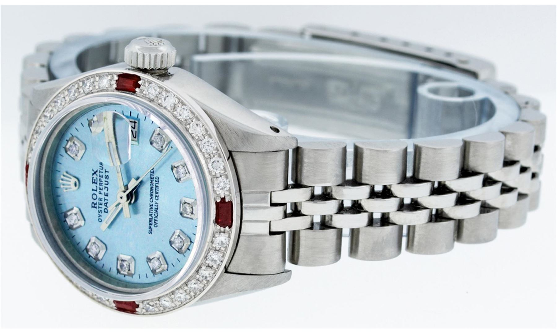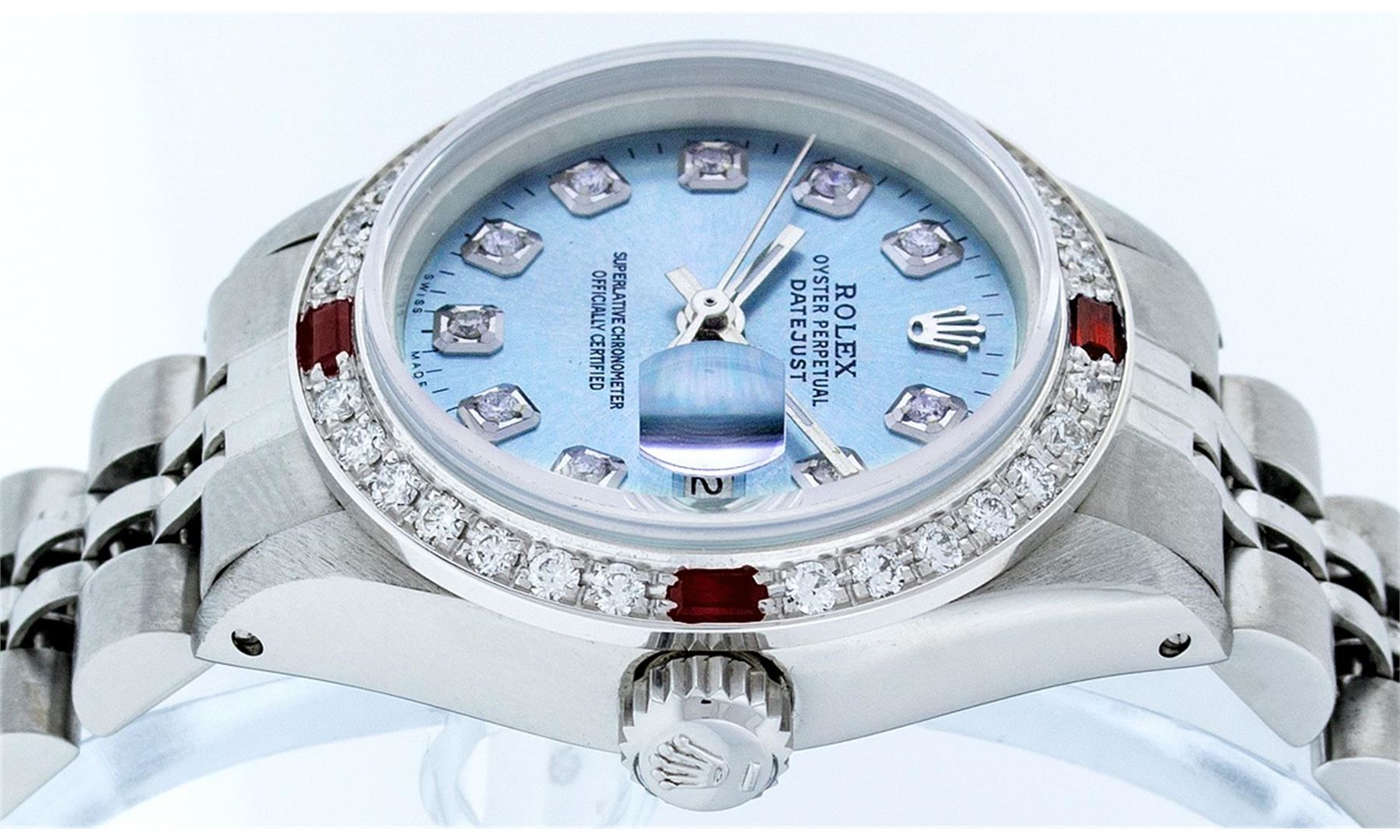 Ladies Rolex Datejust Polished Bright with Satin Finish, Serviced & Electronically Tested, Stainless Steel Case:26mm, Stainless Steel Crown, Custom Bezel: 18K White Gold Ruby Beadset Diamond Bezel, Diamond + Gem Count: 28 Diamonds + 4 Ruby. Total Weight .70 Carat, Clarity: SI-VS, Color: G to H. Custom Crystal: Synthetic Sapphire Cyclops Lens. Movement: Automatic Winding Movement Caliber 2030. Custom Dial: Refinished Sky Blue With Diamond Hour Markers. Diamond Count: 10 Diamonds, Color: G To H, Clarity: SI-VS. Date Window: 3 O'Clock Position Date Display, Model: Datejust. Condition: G-6 Extra Fine. Bracelet: Stainless Steel Jubilee. Bright Polish & Satin Finish. 6.0 Inch Length, Adjustable. Standard Clasp, With Rolex Logo. Comes with 6 month warranty.