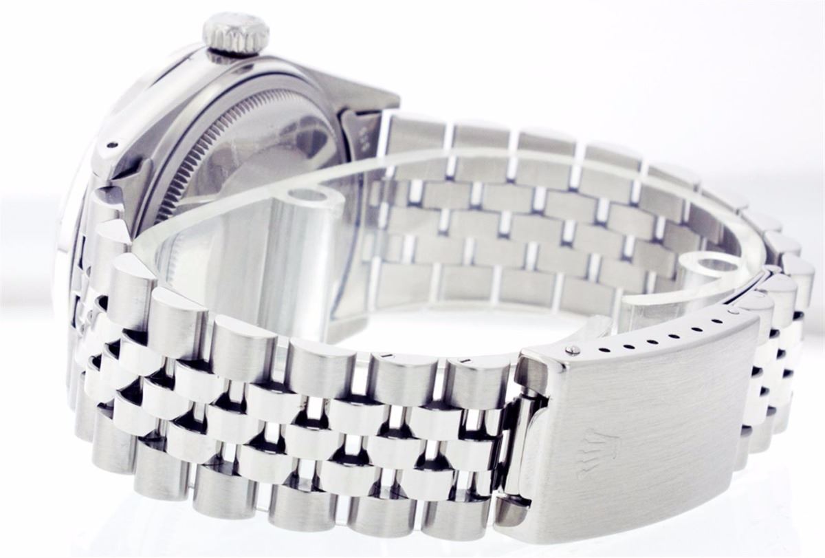 One Mens Rolex Datejust Polished Bright with Satin Finish, Serviced & Electronically Tested, Stainless Steel Case:36mm, Stainless Steel Crown, Custom Bezel: 18K White Gold Ruby Beadset Diamond Bezel, Diamond + Gem Count: 36 Diamonds + 4 Rubys Total Weight 1.00 Carat, Clarity: Si-VS, Color: G to H. Custom Crystal: Synthetic Sapphire Cyclops Lens. Movement: Automatic Winding Movement Caliber 3035. Custom Dial: Slate Grey Dial Set With Diamond Hour Markers, 10 Diamond in Dial G To H In Color, Si-VS Clarity. Date Window: 3 O'Clock Position Date Display, Quickset, Model: 16014 Condition: G-6 Extra Fine. Bracelet: Stainless Steel Jubilee. Bright Polish & Satin Finish. 6.5 Inch Length, Adjustable. Standard Clasp, With Rolex Logo.