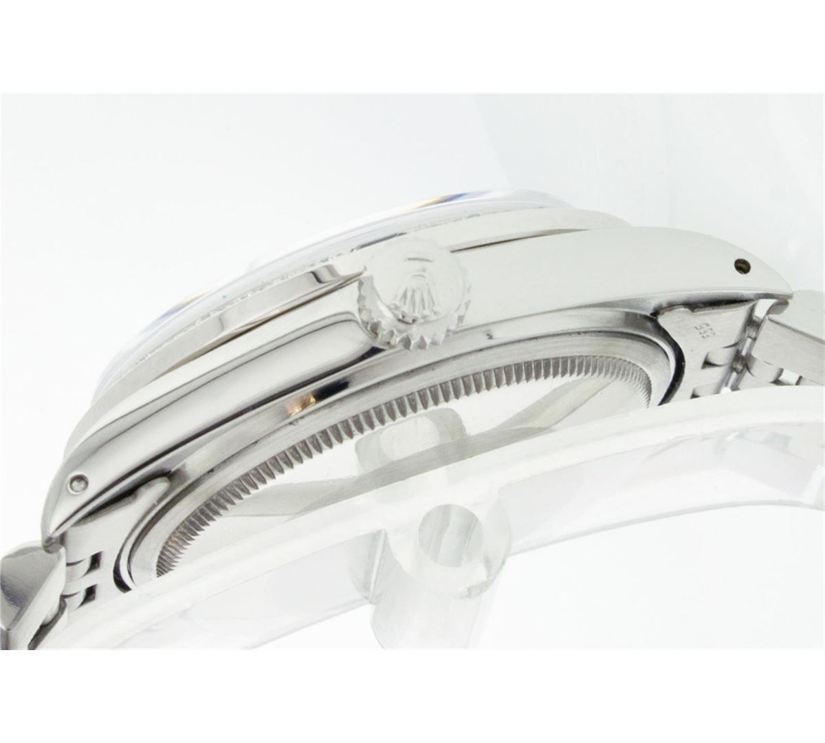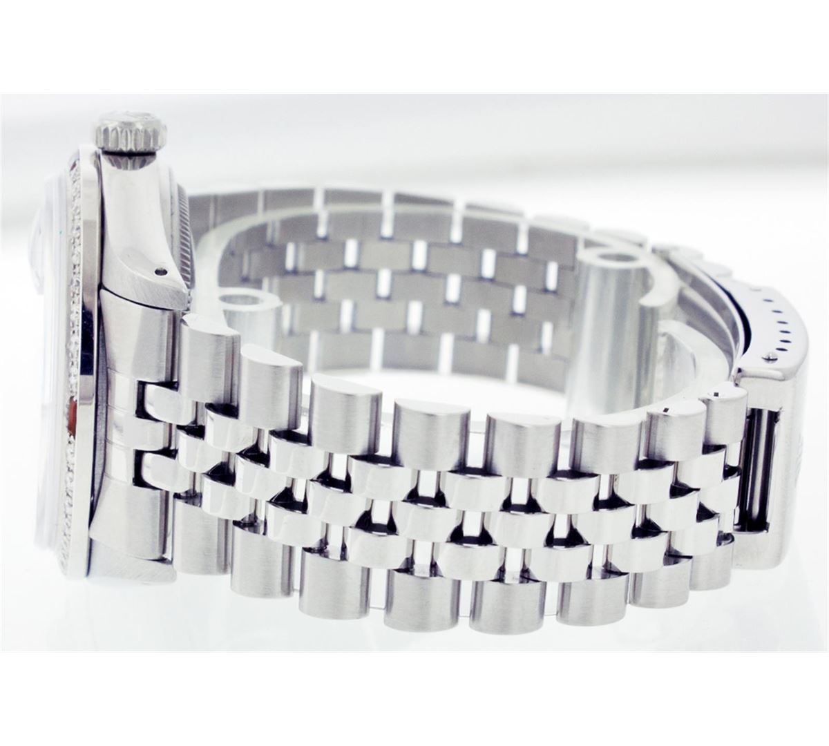 One Gents Rolex Datejust Polished, Serviced & Electronically Tested, Stainless Steel Case:36mm, Stainless Steel Crown, Custom Bezel: 18K White Gold Ruby Beadset Diamond Bezel, Diamond + Gem Count: 36 Diamonds + 4 Rubies Total Weight 1.00 Carat, Clarity: SI-VS, Color: G to H. Custom Crystal: Synthetic Sapphire Cyclops Lens. Movement: Automatic Winding Movement Caliber 3035. Custom Dial: Red Vignette With Diamond Hour Markers, 10 Diamond Dial G To H In Color, Clarity: SI-VS. Date Window: 3 O'Clock Position Date Display, Quickset, Model: 16014 Condition: G-6 Extra Fine. Bracelet: Stainless Steel Jubilee. Bright Polish & Satin Finish. 6.5 Inch Length, Adjustable. Standard Clasp, With Rolex Logo.
