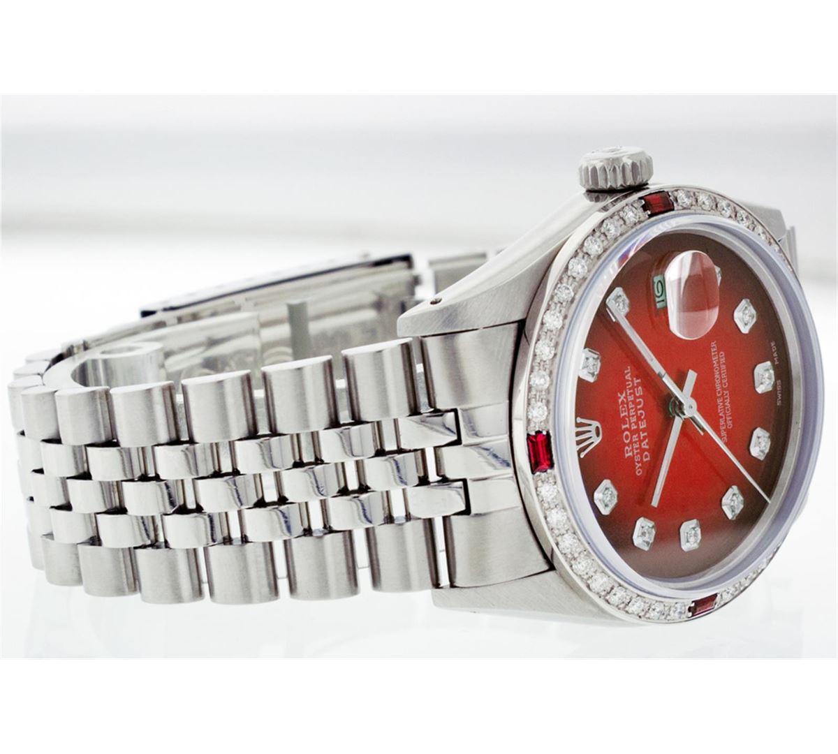 One Gents Rolex Datejust Polished, Serviced & Electronically Tested, Stainless Steel Case:36mm, Stainless Steel Crown, Custom Bezel: 18K White Gold Ruby Beadset Diamond Bezel, Diamond + Gem Count: 36 Diamonds + 4 Rubies Total Weight 1.00 Carat, Clarity: SI-VS, Color: G to H. Custom Crystal: Synthetic Sapphire Cyclops Lens. Movement: Automatic Winding Movement Caliber 3035. Custom Dial: Red Vignette With Diamond Hour Markers, 10 Diamond Dial G To H In Color, Clarity: SI-VS. Date Window: 3 O'Clock Position Date Display, Quickset, Model: 16014 Condition: G-6 Extra Fine. Bracelet: Stainless Steel Jubilee. Bright Polish & Satin Finish. 6.5 Inch Length, Adjustable. Standard Clasp, With Rolex Logo.