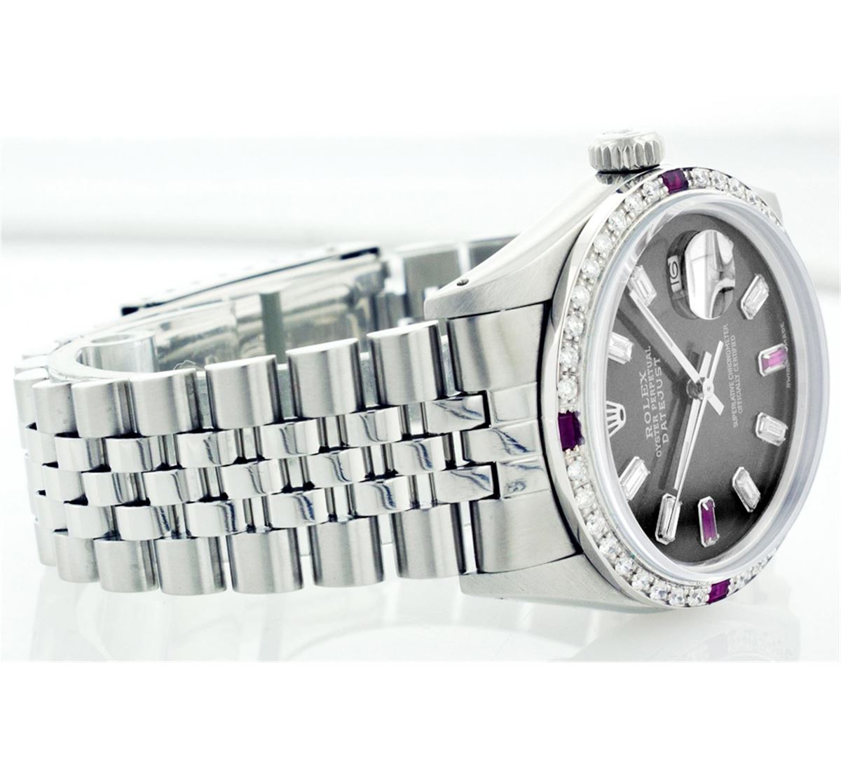 One Gents Rolex Datejust Polished, Serviced & Electronically Tested, Stainless Steel Case:36mm, Stainless Steel Crown, Custom Bezel: 18K White Gold Ruby Beadset Diamond Bezel, Diamond + Gem Count: 36 Diamonds + 4 Rubies Total Weight 1.00 Carat, Clarity: SI-VS, Color: G to H. Custom Crystal: Synthetic Sapphire Cyclops Lens. Movement: Automatic Winding Movement Caliber 3035. Custom Dial: Black, Baguette + 2 Ruby Baguette Diamond Hour Markers, Diamond Count: 8 Diamond + 2 Ruby Baguette. G To H In Color, Clarity: SI-VS. Date Window: 3 O'Clock Position Date Display, Quickset, Model: 16014 Condition: G-6 Extra Fine. Bracelet: Stainless Steel Jubilee. Bright Polish & Satin Finish. 6.5 Inch Length, Adjustable. Standard Clasp, With Rolex Logo.