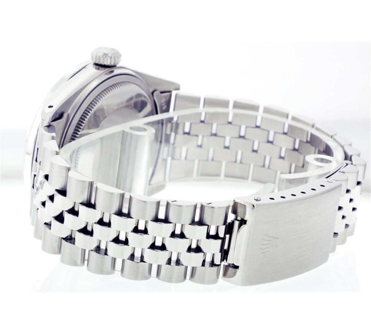 One Mens Rolex Datejust Polished Bright with Satin Finish, Serviced & Electronically Tested, Stainless Steel Case:36mm, Stainless Steel Crown, Custom Bezel: 18K White Gold Ruby Beadset Diamond Bezel, Diamond + Gem Count: 36 Diamonds + 4 Rubys Total Weight 1.00 Carat, Clarity: Si-VS, Color: G to H. Custom Crystal: Synthetic Sapphire Cyclops Lens. Movement: Automatic Winding Movement Caliber 3035. Custom Dial: Slate Grey Dial Set With Diamond Hour Markers, 10 Diamond in Dial G To H In Color, Si-VS Clarity. Date Window: 3 O'Clock Position Date Display, Quickset, Model: 16014 Condition: G-6 Extra Fine. Bracelet: Stainless Steel Jubilee. Bright Polish & Satin Finish. 6.5 Inch Length, Adjustable. Standard Clasp, With Rolex Logo.