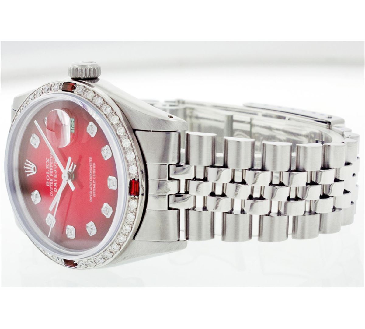 One Gents Rolex Datejust Polished, Serviced & Electronically Tested, Stainless Steel Case:36mm, Stainless Steel Crown, Custom Bezel: 18K White Gold Ruby Beadset Diamond Bezel, Diamond + Gem Count: 36 Diamonds + 4 Rubies Total Weight 1.00 Carat, Clarity: SI-VS, Color: G to H. Custom Crystal: Synthetic Sapphire Cyclops Lens. Movement: Automatic Winding Movement Caliber 3035. Custom Dial: Red Vignette With Diamond Hour Markers, 10 Diamond Dial G To H In Color, Clarity: SI-VS. Date Window: 3 O'Clock Position Date Display, Quickset, Model: 16014 Condition: G-6 Extra Fine. Bracelet: Stainless Steel Jubilee. Bright Polish & Satin Finish. 6.5 Inch Length, Adjustable. Standard Clasp, With Rolex Logo.