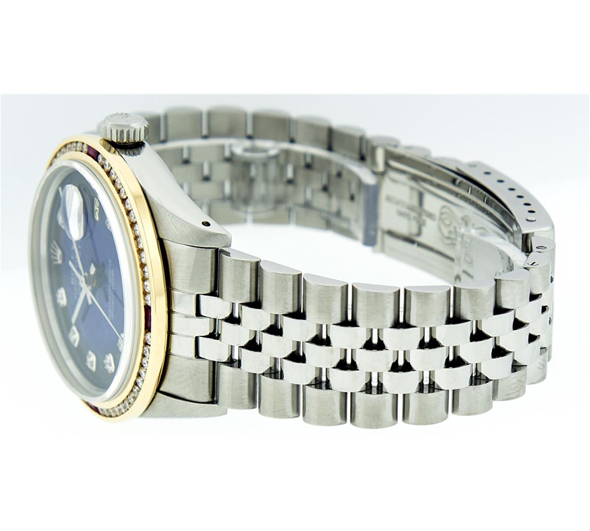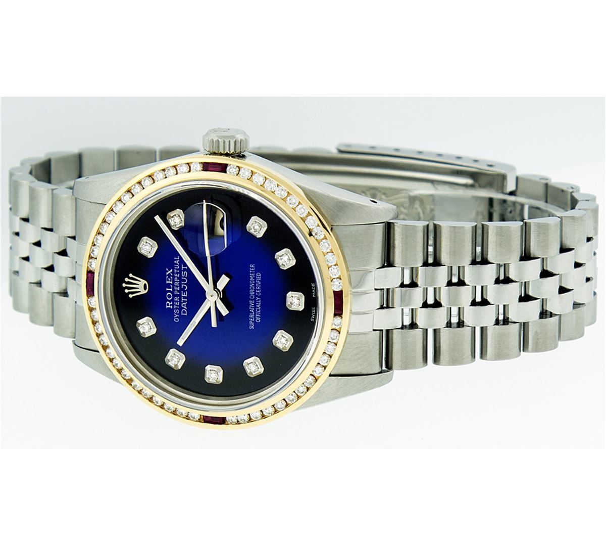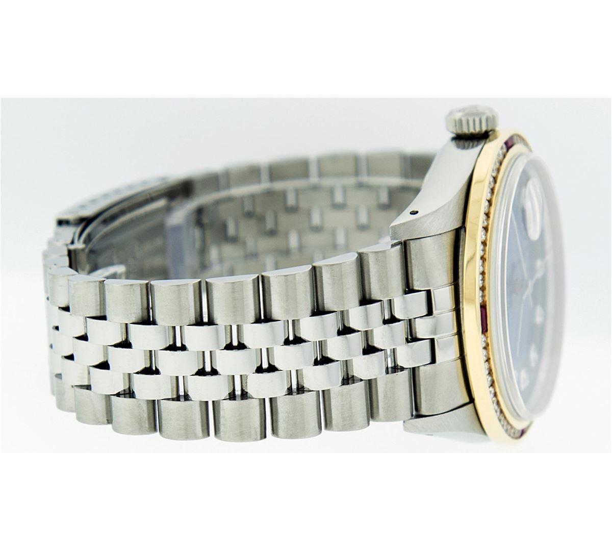 One Mens Stainless Steel Rolex Datejust Polished Bright with Satin Finish, Fully Serviced & Electronically Tested, Stainless Steel Case:36mm, Stainless Steel Crown, Custom Bezel: 18K Yellow Gold Channel Set Ruby Diamond Bezel, Diamond Count: 46 Diamonds Total Weight 1.40 Carat, Clarity: SI-VS, Color: G to H. Custom Crystal: Synthetic Sapphire Cyclops Lens. Movement: Automatic Winding Movement Caliber 3035. Custom Dial: Blue Vignette Diamond With Line Track & Lumi Dots, 10 Diamonds in Dial G To H In Color, Clarity: SI-VS. Date Window: 3 O'Clock Position Date Display, Quickset, Model: Datejust, Condition: G-6 Extra Fine. Bracelet: Stainless Steel Jubilee. Bright Polish & Satin Finish. 7.0 Inch Length, Adjustable. Standard Clasp, With Rolex Logo.