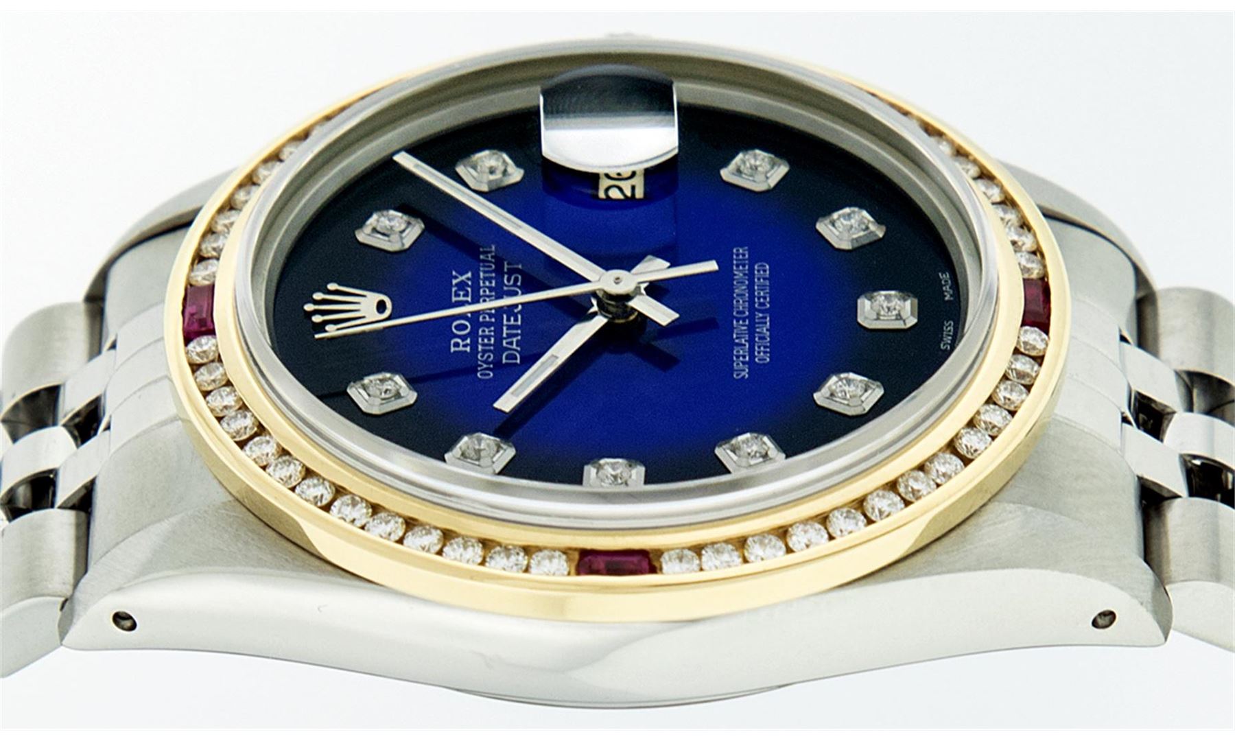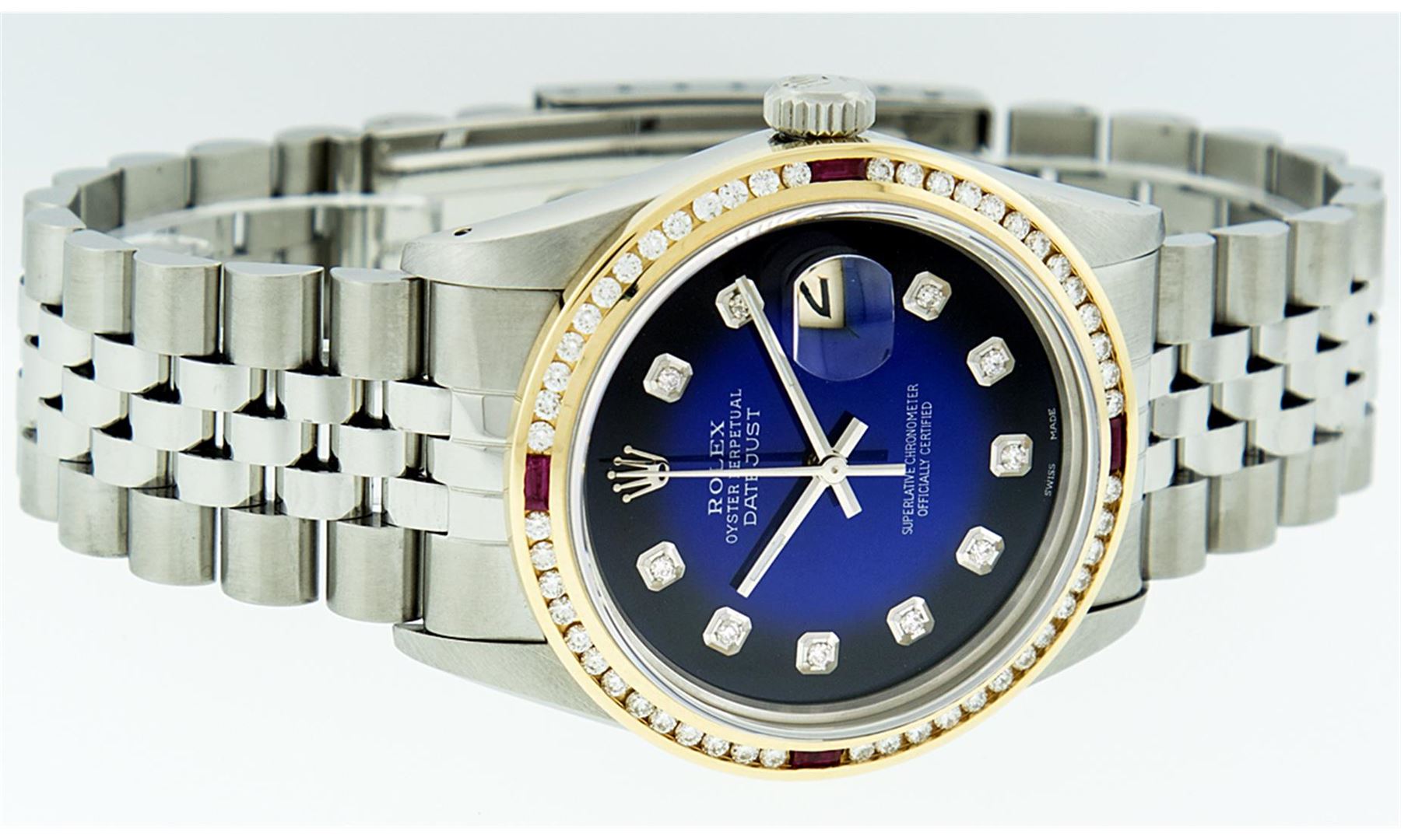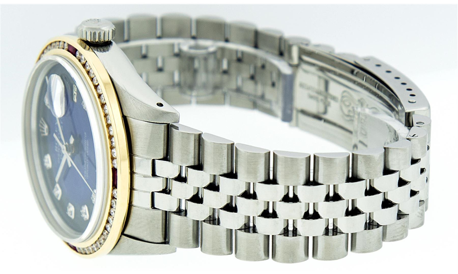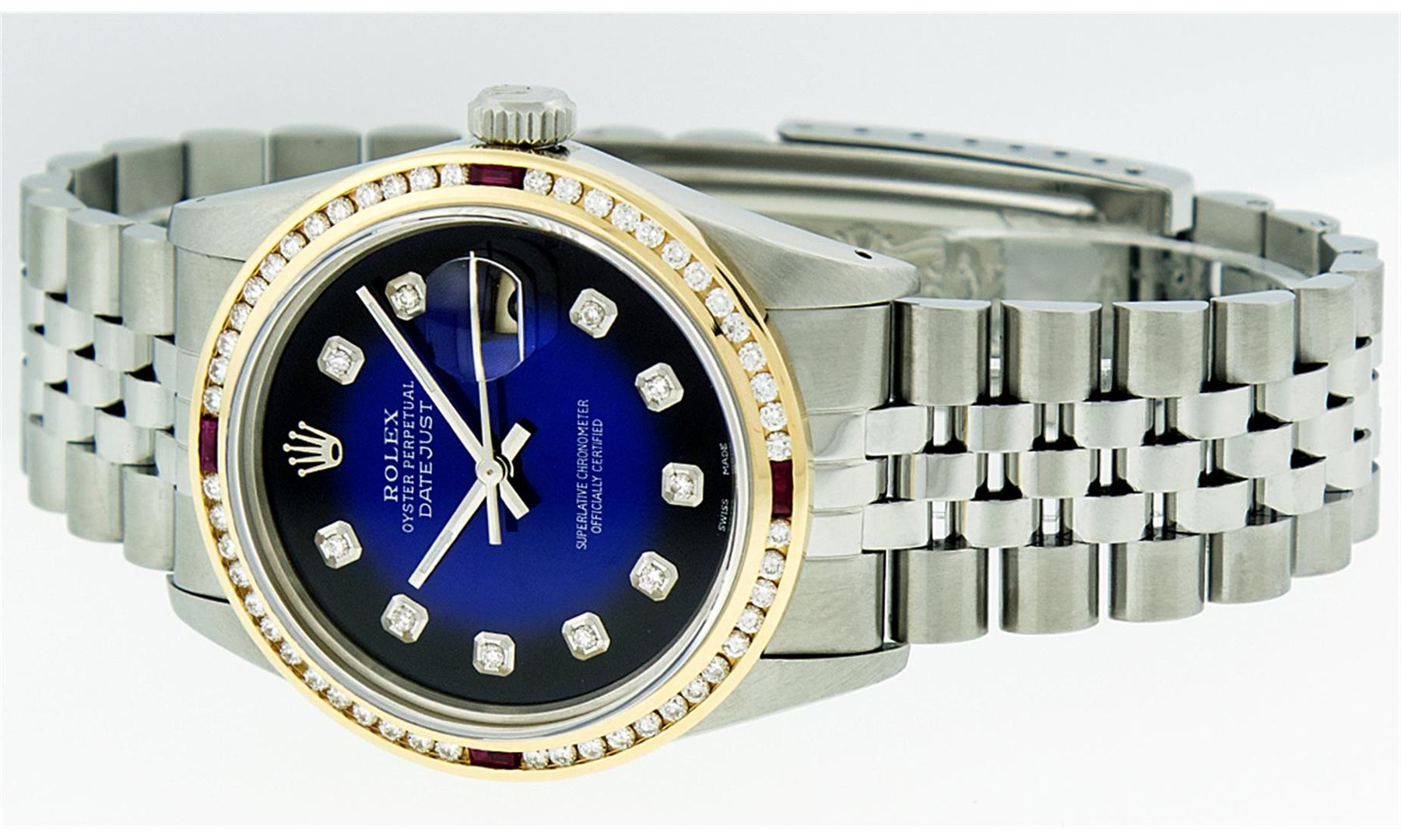 One Mens Stainless Steel Rolex Datejust Polished Bright with Satin Finish, Fully Serviced & Electronically Tested, Stainless Steel Case:36mm, Stainless Steel Crown, Custom Bezel: 18K Yellow Gold Channel Set Ruby Diamond Bezel, Diamond Count: 46 Diamonds Total Weight 1.40 Carat, Clarity: SI-VS, Color: G to H. Custom Crystal: Synthetic Sapphire Cyclops Lens. Movement: Automatic Winding Movement Caliber 3035. Custom Dial: Blue Vignette Diamond With Line Track & Lumi Dots, 10 Diamonds in Dial G To H In Color, Clarity: SI-VS. Date Window: 3 O'Clock Position Date Display, Quickset, Model: Datejust, Condition: G-6 Extra Fine. Bracelet: Stainless Steel Jubilee. Bright Polish & Satin Finish. 7.0 Inch Length, Adjustable. Standard Clasp, With Rolex Logo.