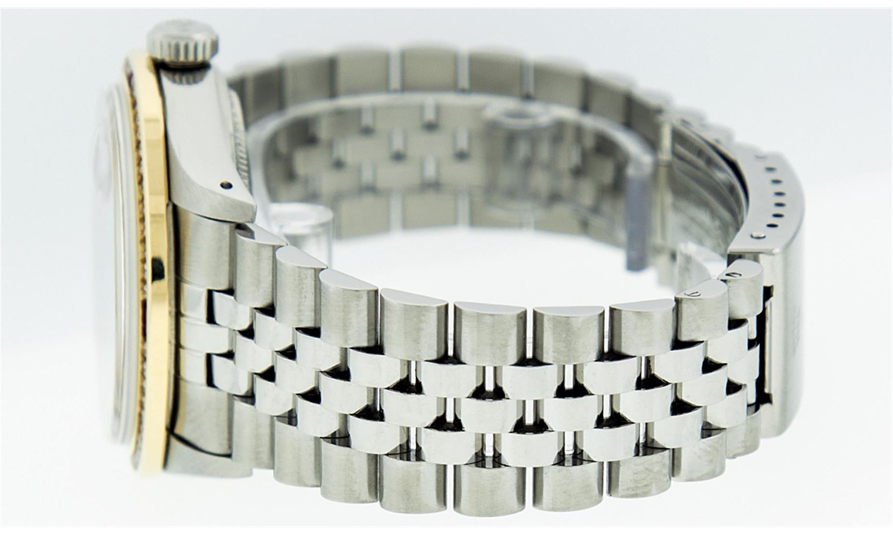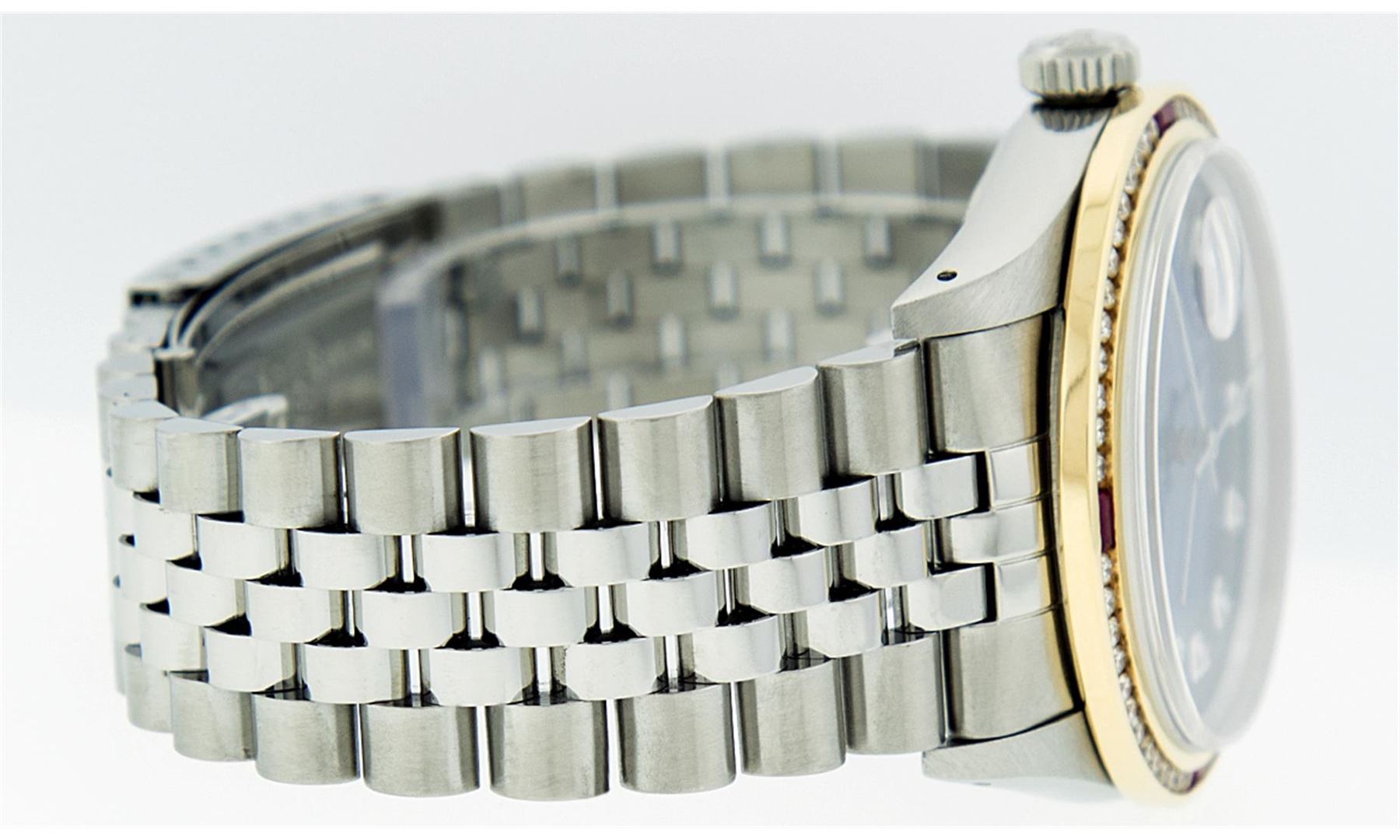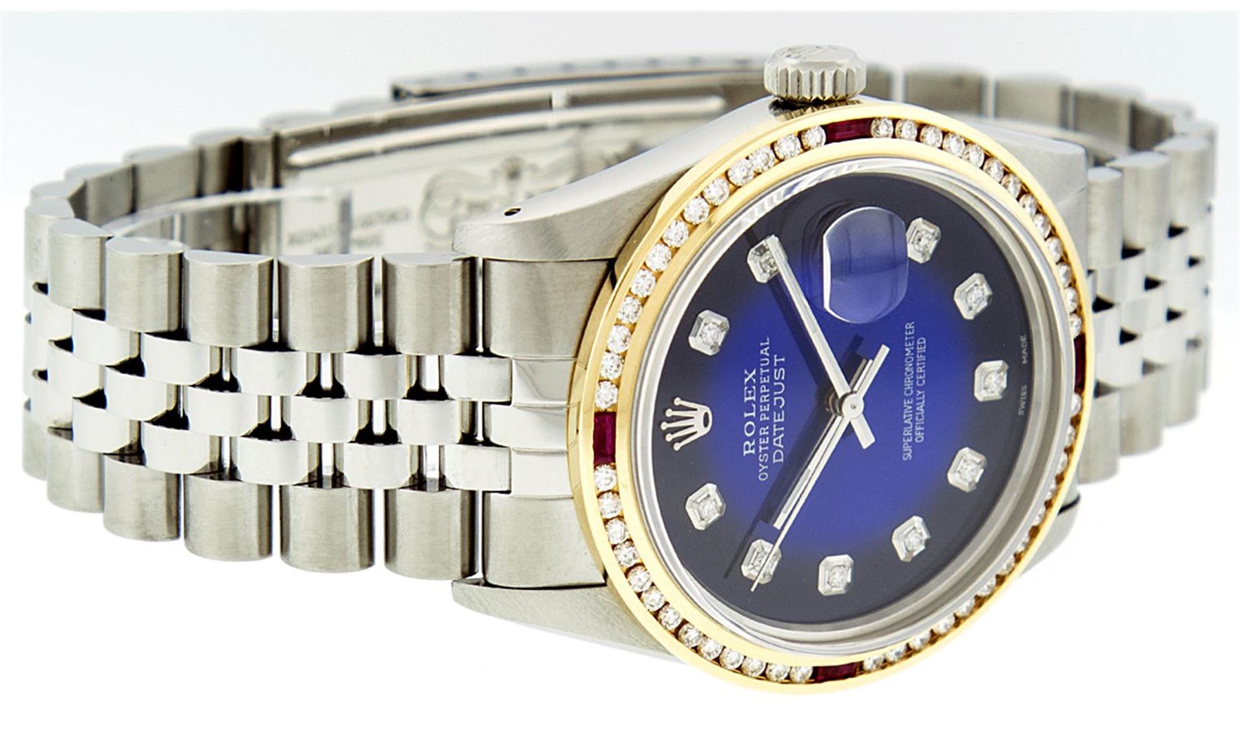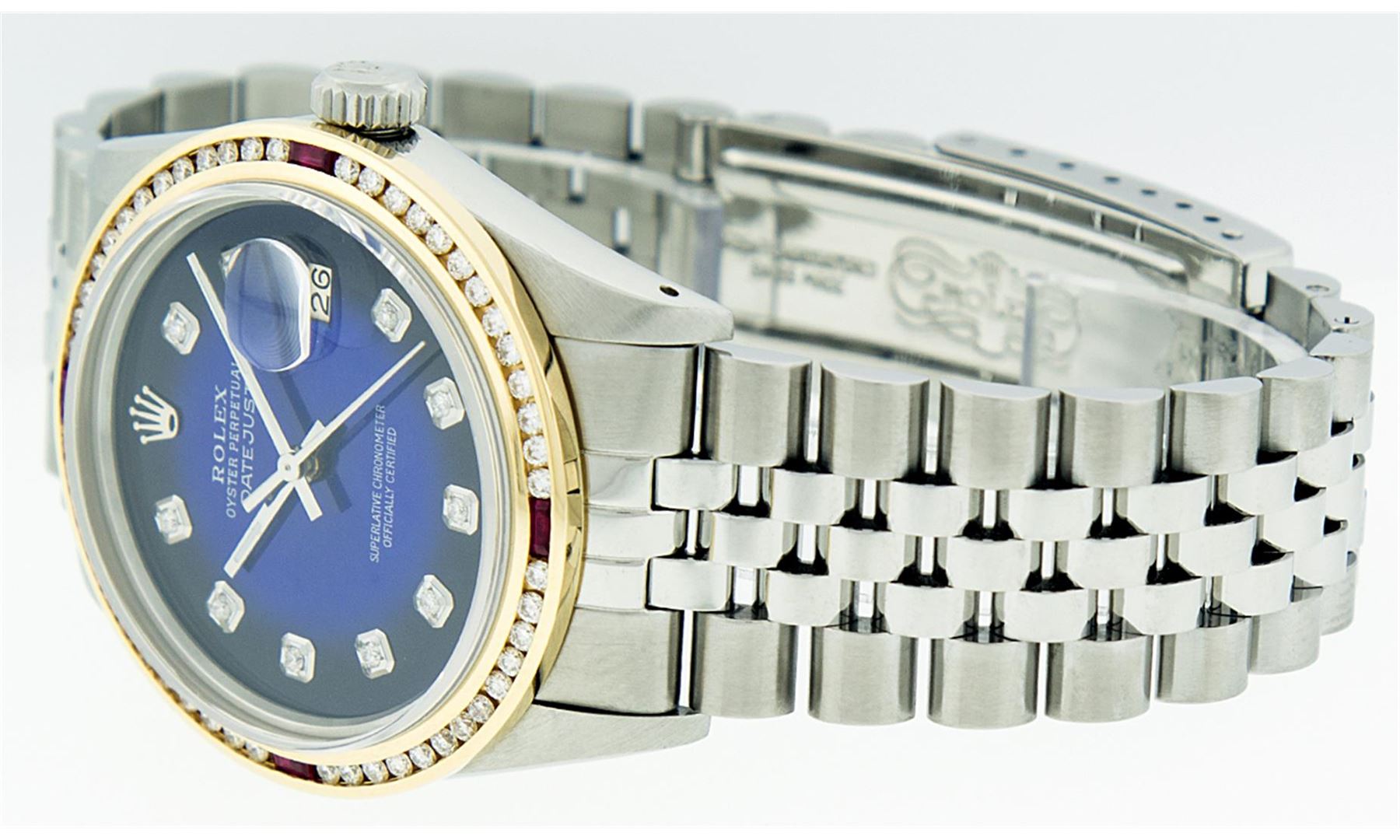 One Mens Stainless Steel Rolex Datejust Polished Bright with Satin Finish, Fully Serviced & Electronically Tested, Stainless Steel Case:36mm, Stainless Steel Crown, Custom Bezel: 18K Yellow Gold Channel Set Ruby Diamond Bezel, Diamond Count: 46 Diamonds Total Weight 1.40 Carat, Clarity: SI-VS, Color: G to H. Custom Crystal: Synthetic Sapphire Cyclops Lens. Movement: Automatic Winding Movement Caliber 3035. Custom Dial: Blue Vignette Diamond With Line Track & Lumi Dots, 10 Diamonds in Dial G To H In Color, Clarity: SI-VS. Date Window: 3 O'Clock Position Date Display, Quickset, Model: Datejust, Condition: G-6 Extra Fine. Bracelet: Stainless Steel Jubilee. Bright Polish & Satin Finish. 7.0 Inch Length, Adjustable. Standard Clasp, With Rolex Logo.