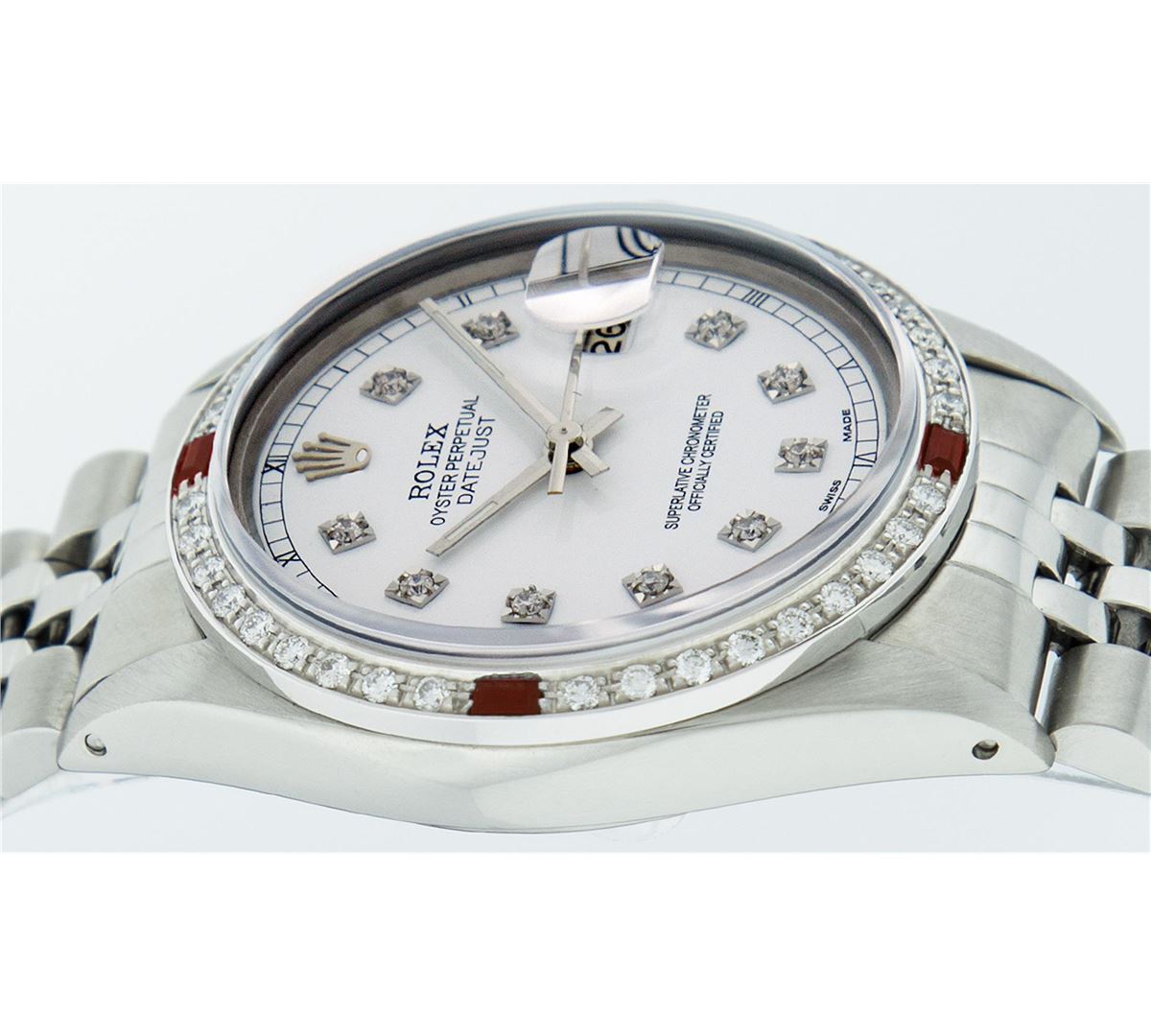 One Mens Rolex Datejust Polished Bright with Satin Finish, Serviced & Electronically Tested, Stainless Steel Case:36mm, Stainless Steel Crown, Custom Bezel: 18K White Gold Ruby Beadset Diamond Bezel, Diamond + Gem Count: 36 Diamonds + 4 Rubies. Total Weight 1.00 Carat, Clarity: Si-VS, Color: G to H. Custom Crystal: Synthetic Sapphire Cyclops Lens. Movement: Automatic Winding Movement Caliber 3035. Custom Dial: White Diamond Dial With Square Roman Track, Diamond Count: 10 Diamonds Square Setting, Color: G to H, Clarity: SI-VS.. Date Window: 3 O'Clock Position Date Display, Quickset, Model: Datejust. Condition: G-6 Extra Fine. Bracelet: Stainless Steel Jubilee. Bright Polish & Satin Finish. 7.0 Inch Length, Adjustable. Standard Clasp, With Rolex Logo. Comes with 6 month warranty.