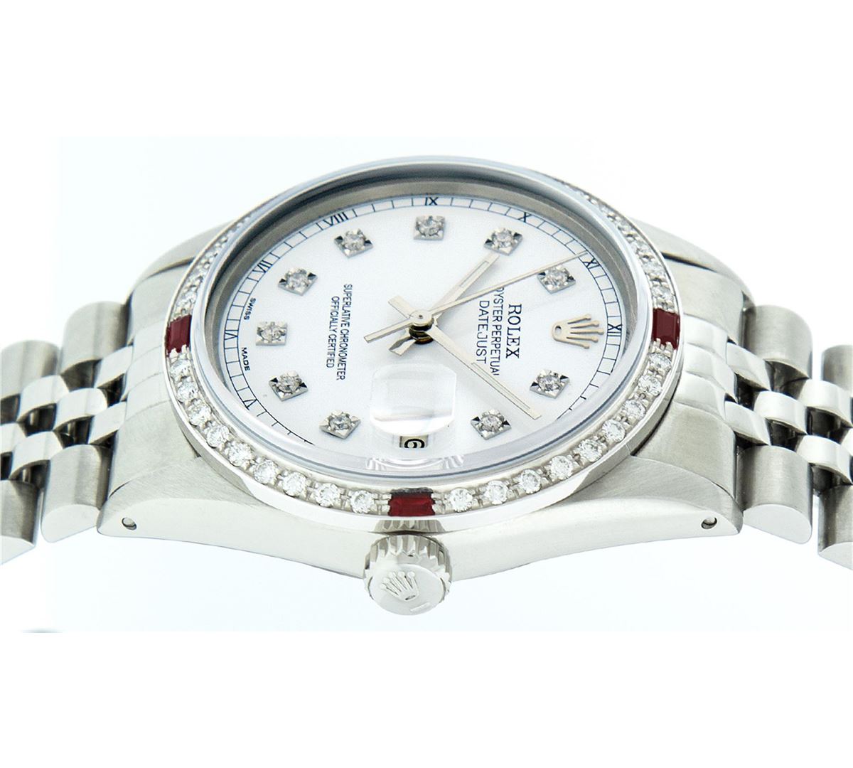 One Mens Rolex Datejust Polished Bright with Satin Finish, Serviced & Electronically Tested, Stainless Steel Case:36mm, Stainless Steel Crown, Custom Bezel: 18K White Gold Ruby Beadset Diamond Bezel, Diamond + Gem Count: 36 Diamonds + 4 Rubies. Total Weight 1.00 Carat, Clarity: Si-VS, Color: G to H. Custom Crystal: Synthetic Sapphire Cyclops Lens. Movement: Automatic Winding Movement Caliber 3035. Custom Dial: White Diamond Dial With Square Roman Track, Diamond Count: 10 Diamonds Square Setting, Color: G to H, Clarity: SI-VS.. Date Window: 3 O'Clock Position Date Display, Quickset, Model: Datejust. Condition: G-6 Extra Fine. Bracelet: Stainless Steel Jubilee. Bright Polish & Satin Finish. 7.0 Inch Length, Adjustable. Standard Clasp, With Rolex Logo. Comes with 6 month warranty.