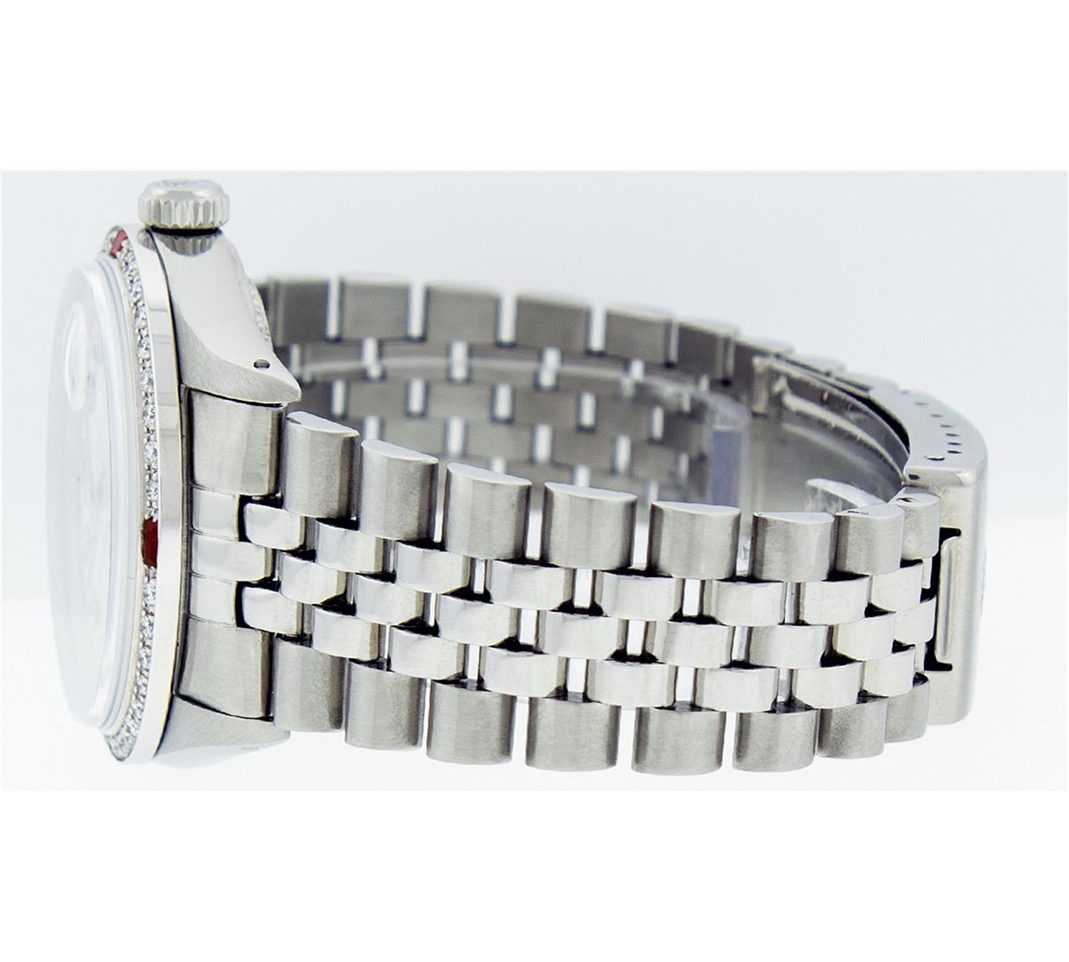 One Mens Rolex Datejust Polished Bright with Satin Finish, Serviced & Electronically Tested, Stainless Steel Case:36mm, Stainless Steel Crown, Custom Bezel: 18K White Gold Ruby Beadset Diamond Bezel, Diamond + Gem Count: 36 Diamonds + 4 Rubies. Total Weight 1.00 Carat, Clarity: Si-VS, Color: G to H. Custom Crystal: Synthetic Sapphire Cyclops Lens. Movement: Automatic Winding Movement Caliber 3035. Custom Dial: White Diamond Dial With Square Roman Track, Diamond Count: 10 Diamonds Square Setting, Color: G to H, Clarity: SI-VS.. Date Window: 3 O'Clock Position Date Display, Quickset, Model: Datejust. Condition: G-6 Extra Fine. Bracelet: Stainless Steel Jubilee. Bright Polish & Satin Finish. 7.0 Inch Length, Adjustable. Standard Clasp, With Rolex Logo. Comes with 6 month warranty.