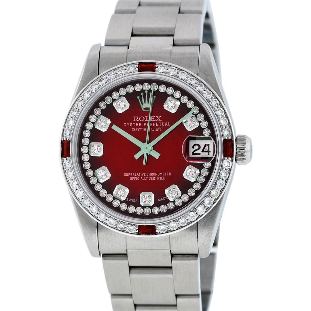 One Midsize Stainless Steel Rolex Datejust Polished, Serviced & Electronically Tested, Stainless Steel Case Case:31mm, Stainless Steel Crown, Custom Bezel: 18K White Gold Ruby Beadset Bezel, Diamond Count: 40 Diamonds + 4 Rubies, Total Weight: 1 Carat, Color: G To H, Clarity: VS2-SI1. Custom Crystal: Synthetic Sapphire Cyclops Lens. Movement: Automatic Winding Movement Caliber 2235. Custom Dial: Red Vignette Diamond Dial VVS. Color: G to H, Clarity: VVS, Date Window: 3 O'Clock Position Date Display, Quickset, Model: Midsize Datejust. Condition: G-6 Extra Fine The Watch Is In Very Good Condition Free Of All Scratches And Dents. Bracelet: Stainless Steel Oyster Band. Bright Polish. 6.0 Inch Length, Adjustable. Standard Clasp, With Rolex Logo. Comes with 6 month warranty.