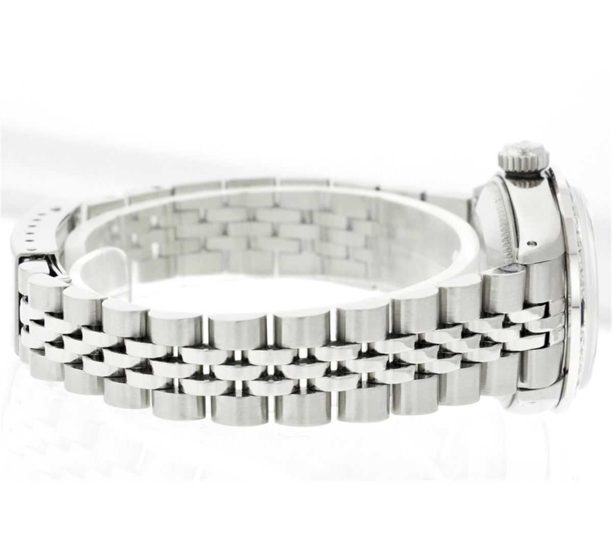 One Ladies Rolex Datejust Polished Bright with Satin Finish, Serviced & Electronically Tested, Stainless Steel Case: 26mm, Stainless Steel Crown, Custom Bezel: 18K White Gold Sapphire Beadset Diamond Bezel, Diamond + Gem Count: 28 Diamonds + 4 Sapphires Total Weight .70 Carat, Clarity: SI-VS, Color: G to H. Custom Crystal: Synthetic Sapphire Cyclops Lens. Movement: Automatic Winding Movement Caliber 2030. Original Custom Dial: Refinished Blue Vignette With Diamond Hour Markers, 10 Diamond in Dial G To H In Color, Clarity: SI-VS. Date Window: 3 O'Clock Position Date Display, Quickset, Model: 6917 Condition: G-6 Extra Fine. Bracelet: Stainless Steel Jubilee. Bright Polish & Satin Finish. 5.5 Inch Length, Adjustable. Standard Clasp, With Rolex Logo.