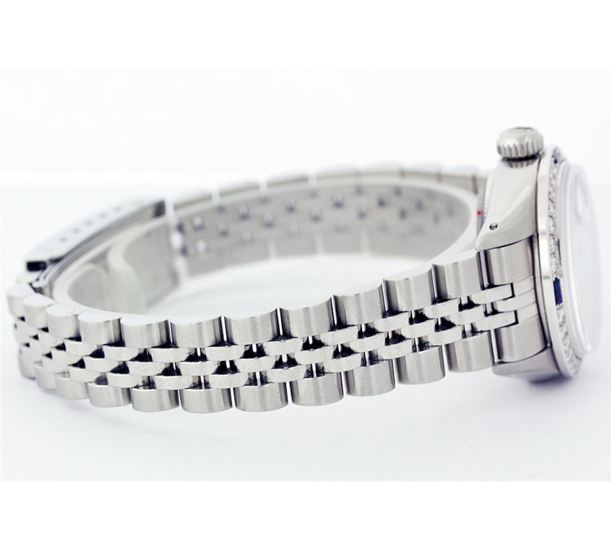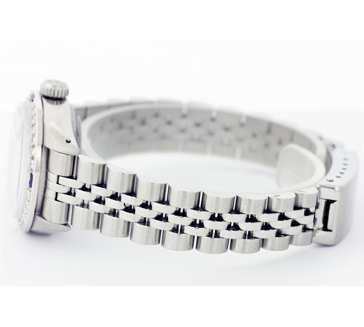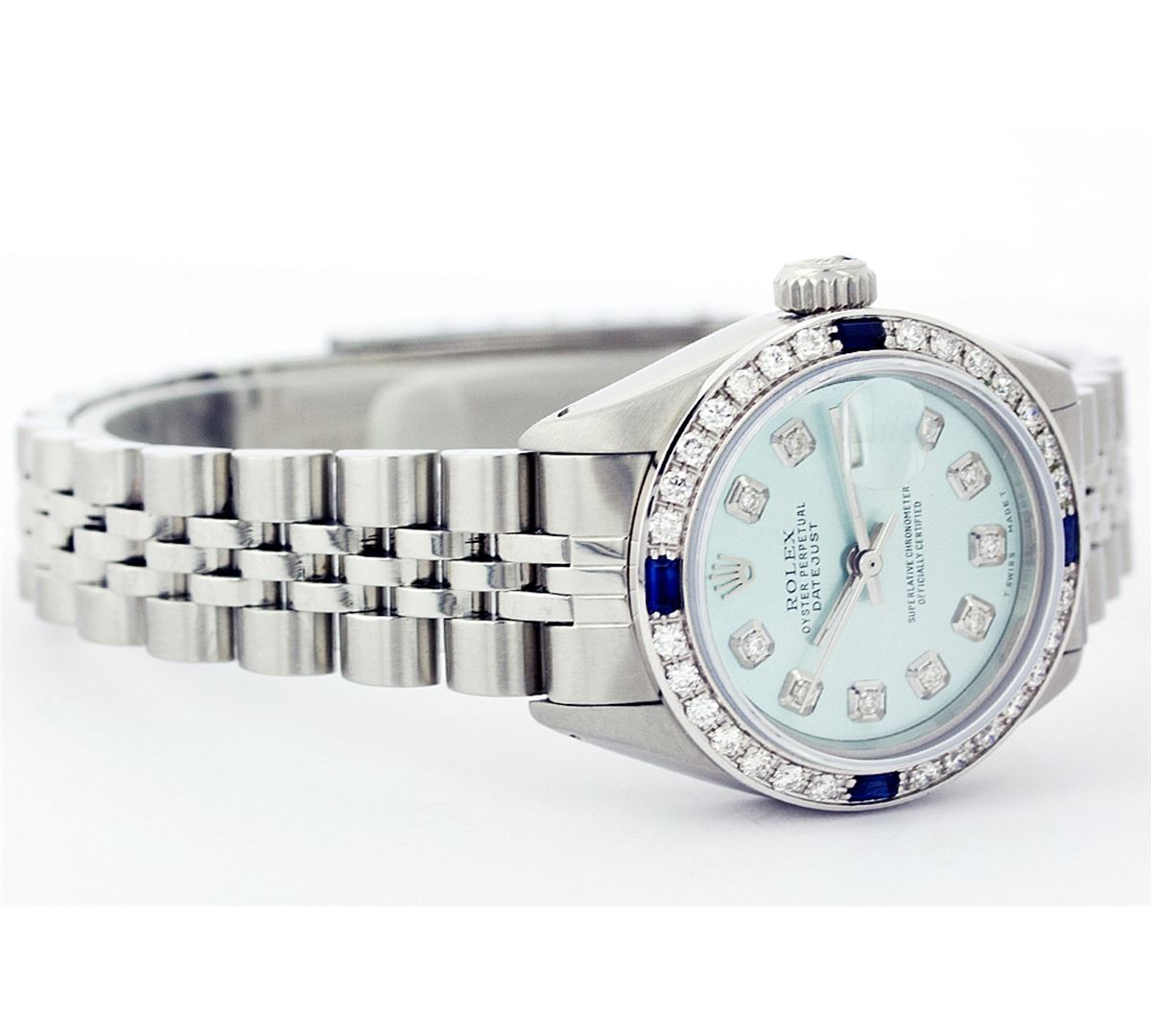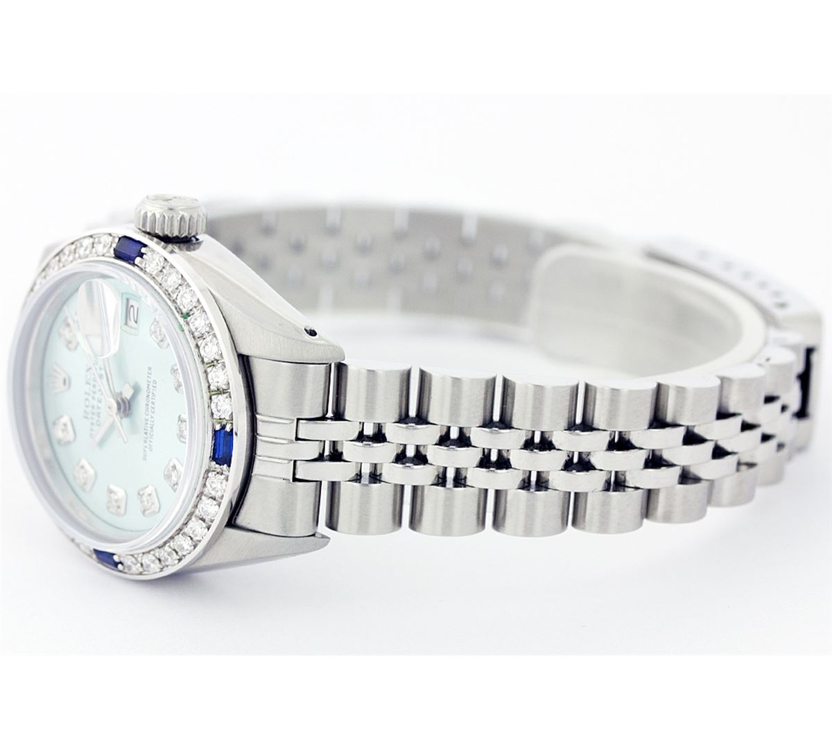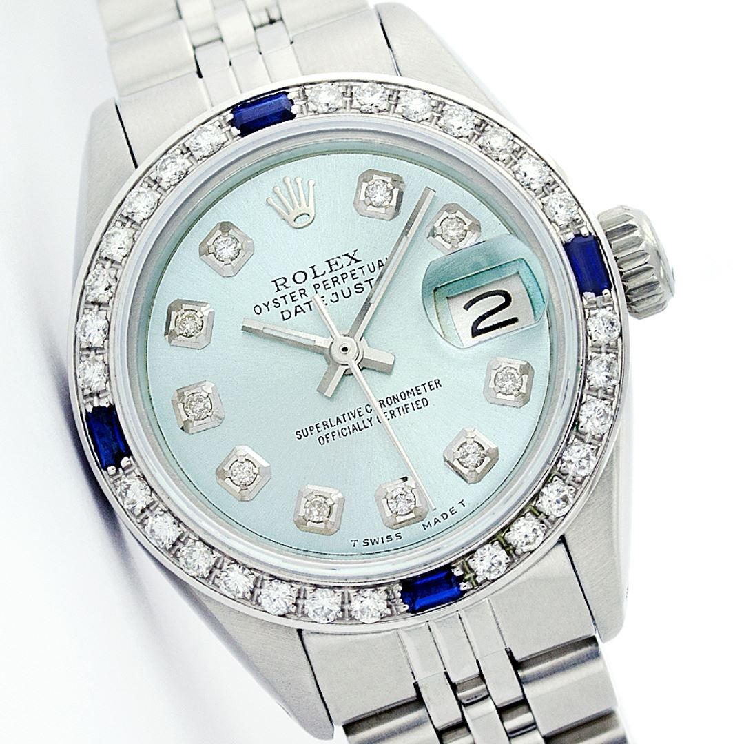 One Ladies Rolex Datejust Polished Bright with Satin Finish, Serviced & Electronically Tested, Stainless Steel Case:26mm, Stainless Steel Crown, Custom Bezel: 18K White Gold Sapphire Beadset Diamond Bezel, Diamond + Gem Count: 28 Diamonds + 4 Sapphires Total Weight .70 Carat, Clarity: SI-VS, Color: G to H. Custom Crystal: Synthetic Sapphire Cyclops Lens. Movement: Automatic Winding Movement Caliber 2030. Custom Dial: Refinished Ice Blue With Diamond Hour Markers, Diamond Count: 10 Diamonds, Clarity: SI-VS, to H. Date Window: 3 O'Clock Position Date Display, Non Quickset, Model: 6917 Condition: G-6 Extra Fine. Bracelet: Stainless Steel Jubilee. Bright Polish & Satin Finish. 5.5 Inch Length, Adjustable. Standard Clasp, With Rolex Logo.