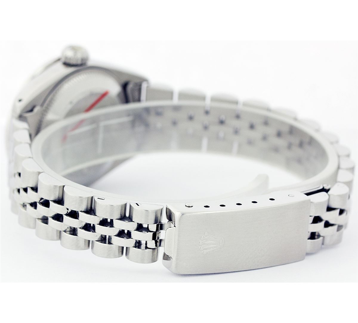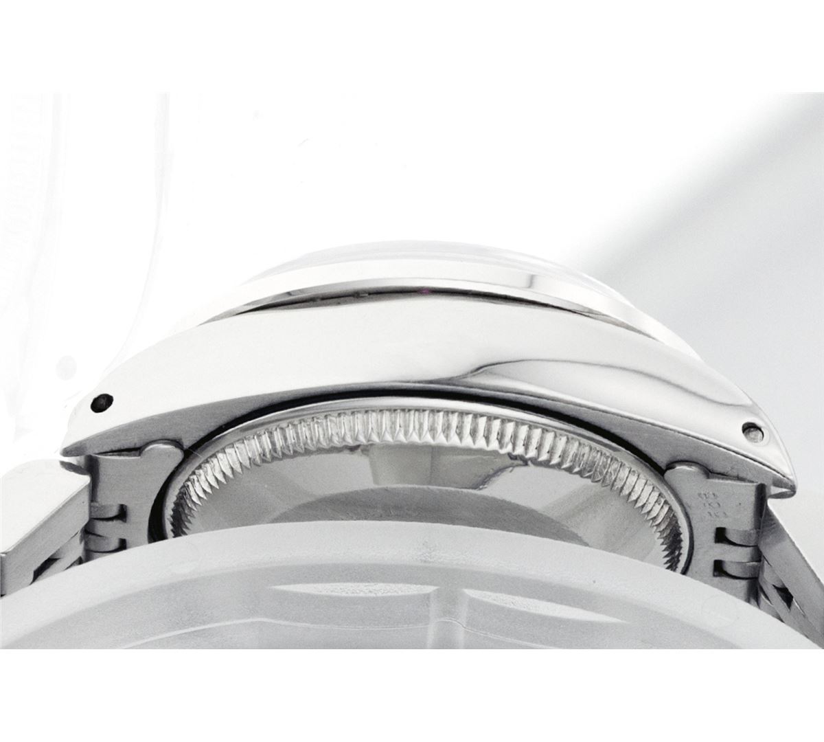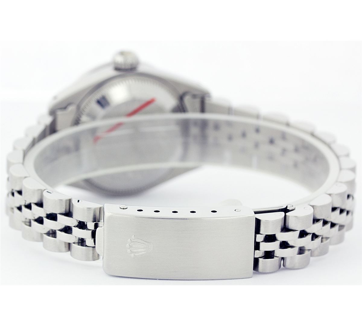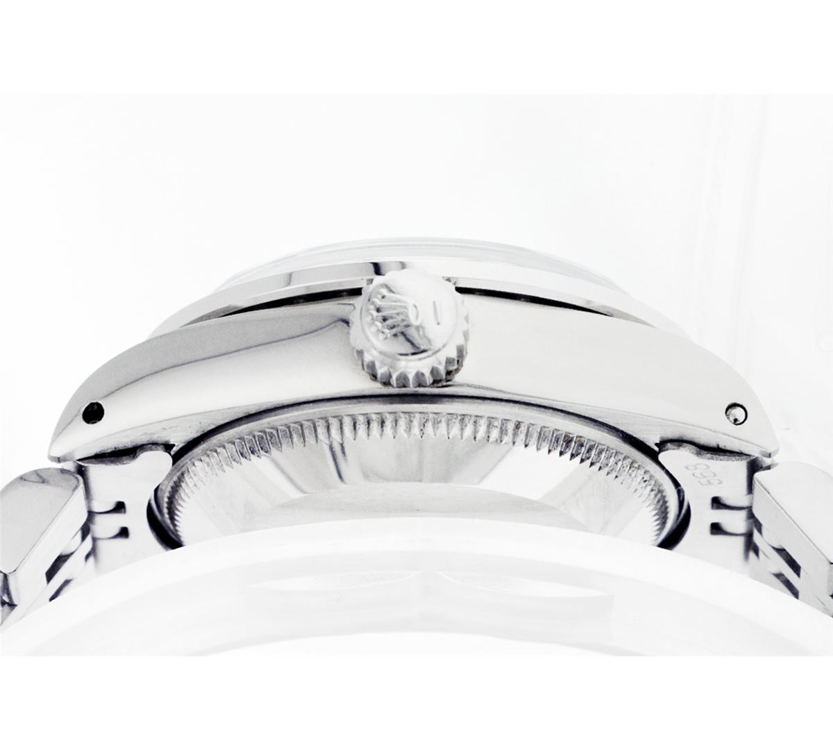 One Ladies Rolex Datejust Polished Bright with Satin Finish, Serviced & Electronically Tested, Stainless Steel Case:26mm, Stainless Steel Crown, Custom Bezel: 18K White Gold Sapphire Beadset Diamond Bezel, Diamond + Gem Count: 28 Diamonds + 4 Sapphires Total Weight .70 Carat, Clarity: SI-VS, Color: G to H. Custom Crystal: Synthetic Sapphire Cyclops Lens. Movement: Automatic Winding Movement Caliber 2030. Custom Dial: Refinished Ice Blue With Diamond Hour Markers, Diamond Count: 10 Diamonds, Clarity: SI-VS, to H. Date Window: 3 O'Clock Position Date Display, Non Quickset, Model: 6917 Condition: G-6 Extra Fine. Bracelet: Stainless Steel Jubilee. Bright Polish & Satin Finish. 5.5 Inch Length, Adjustable. Standard Clasp, With Rolex Logo.