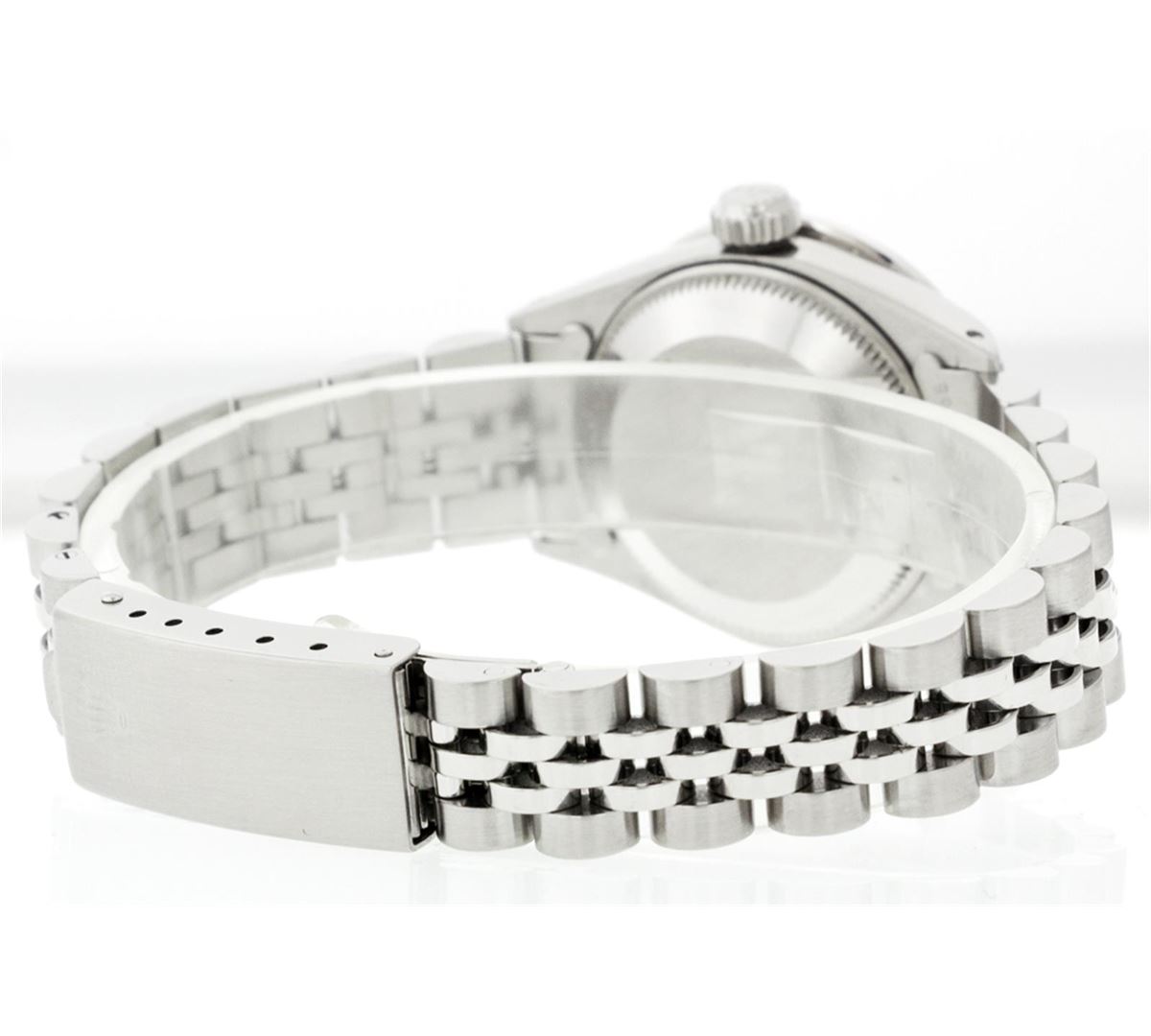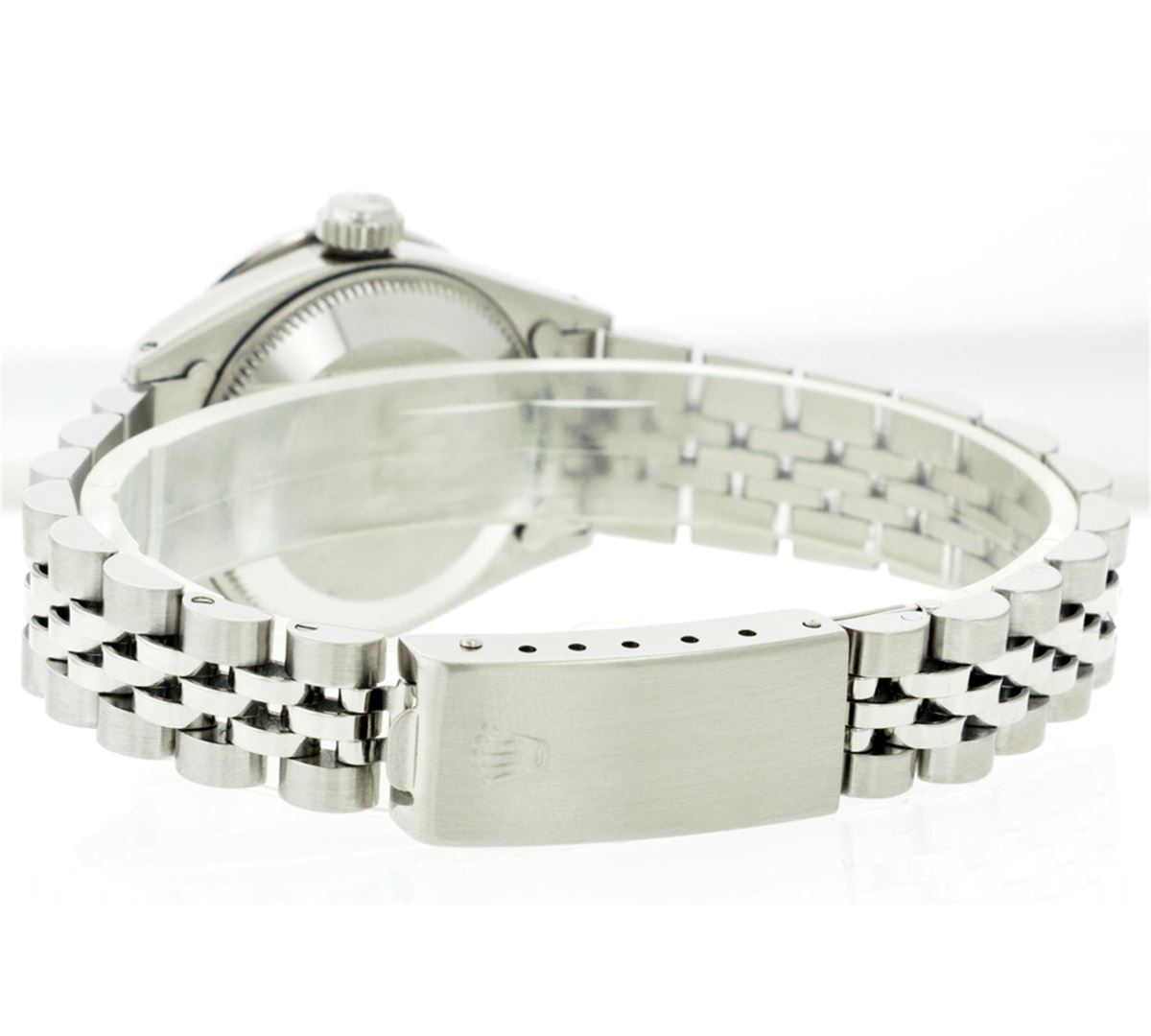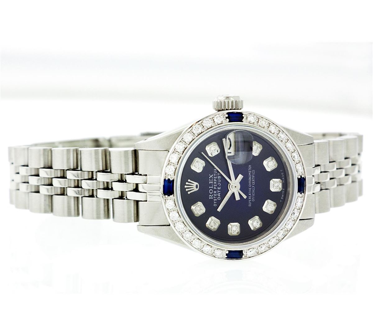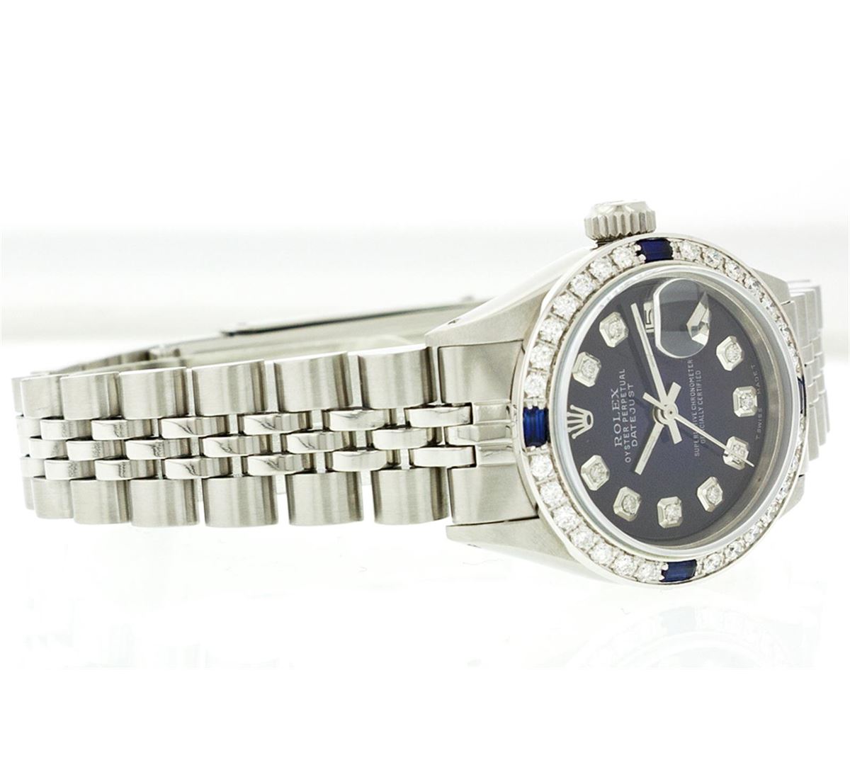 One Ladies Rolex Datejust Polished Bright with Satin Finish, Serviced & Electronically Tested, Stainless Steel Case: 26mm, Stainless Steel Crown, Custom Bezel: 18K White Gold Sapphire Beadset Diamond Bezel, Diamond + Gem Count: 28 Diamonds + 4 Sapphires Total Weight .70 Carat, Clarity: SI-VS, Color: G to H. Custom Crystal: Synthetic Sapphire Cyclops Lens. Movement: Automatic Winding Movement Caliber 2030. Original Custom Dial: Refinished Blue Vignette With Diamond Hour Markers, 10 Diamond in Dial G To H In Color, Clarity: SI-VS. Date Window: 3 O'Clock Position Date Display, Non Quickset, Model: 6917 Condition: G-6 Extra Fine. Bracelet: Stainless Steel Jubilee. Bright Polish & Satin Finish. 5.5 Inch Length, Adjustable. Standard Clasp, With Rolex Logo.