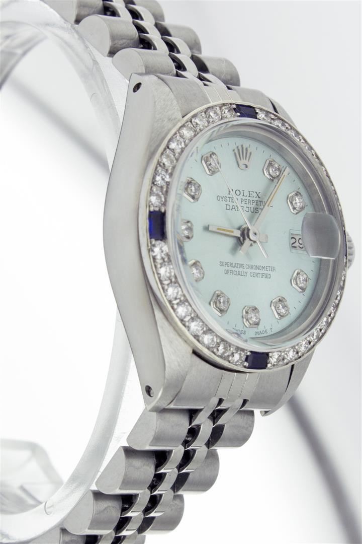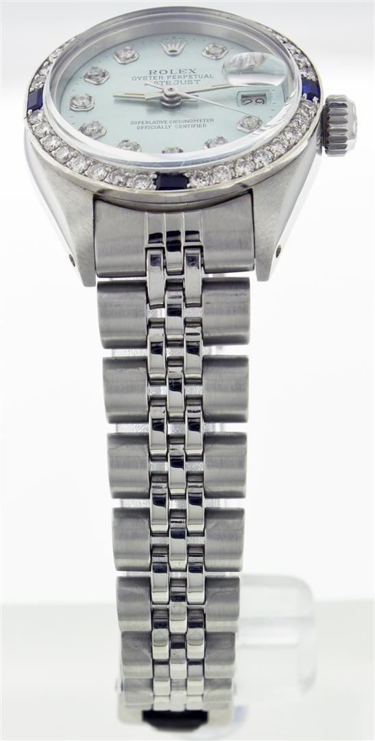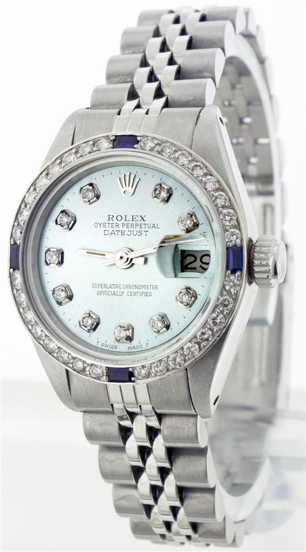 One Ladies Rolex Datejust Polished Bright with Satin Finish, Serviced & Electronically Tested, Stainless Steel Case:26mm, Stainless Steel Crown, Custom Bezel: 18K White Gold Sapphire Beadset Diamond Bezel, Diamond Count: 28 Diamonds + 4 Sapphires Total Weight .70 Carat, Clarity: SI-VS, Color: G to H. Custom Crystal: Synthetic Sapphire Cyclops Lens. Movement: Automatic Winding Movement Caliber 2030. Custom Dial: Ice Blue Diamond Dial, Diamond Count: 10 Diamonds In Dial, Clarity: SI-VS, Color: G to H. Date Window: 3 O'Clock Position Date Display, Non Quickset, Model: 6917 Condition: G-6 Extra Fine. Bracelet: Stainless Steel Jubilee Band. Bright Polish & Satin Finish. 5.5 Inch Length, Adjustable. Standard Clasp, With Rolex Logo.