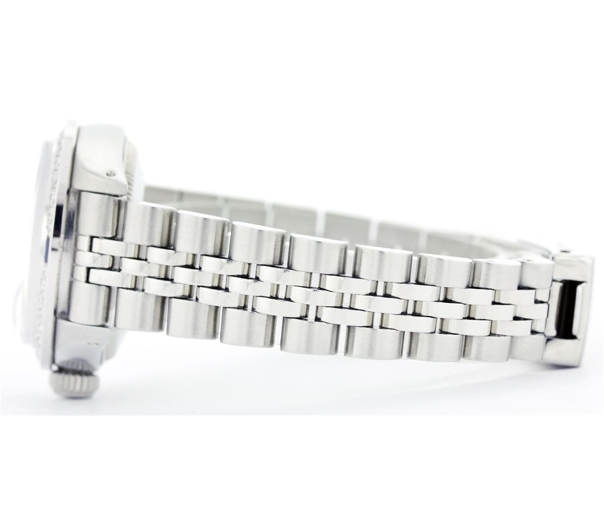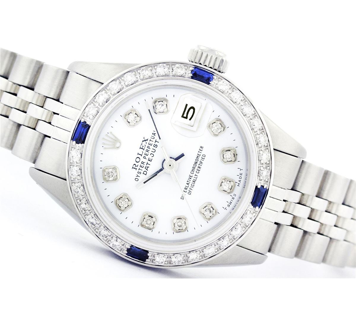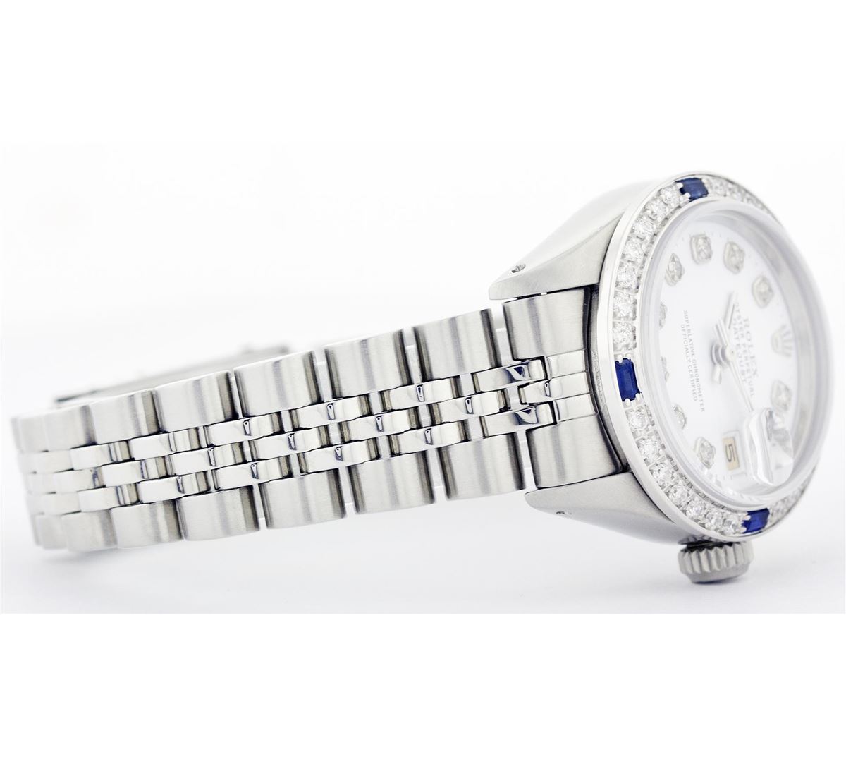 One Ladies Rolex Datejust Polished Bright with Satin Finish, Serviced & Electronically Tested, Stainless Steel Case:26mm, Stainless Steel Crown, Custom Bezel: 18K White Gold Sapphire Beadset Diamond Bezel, Diamond Count: 28 Diamonds + 4 Sapphires Total Weight .70 Carat, Clarity: SI-VS, Color: G to H. Custom Crystal: Synthetic Sapphire Cyclops Lens. Movement: Automatic Winding Movement Caliber 2030. Custom Dial: White Dial With Diamond Hour Markers, Diamond Count: 10 Diamonds, Clarity: SI-VS, Color: G to H. Date Window: 3 O'Clock Position Date Display, Non Quickset, Model: 6917 Condition: G-6 Extra Fine. Bracelet: Stainless Steel Jubilee. Bright Polish & Satin Finish. 5.5 Inch Length, Adjustable. Standard Clasp, With Rolex Logo.