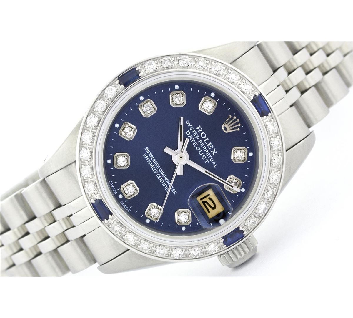 One Ladies Rolex Datejust Polished Bright with Satin Finish, Serviced & Electronically Tested, Stainless Steel Case:26mm, Stainless Steel Crown, Custom Bezel: 18K White Gold Sapphire Beadset Diamond Bezel, Diamond + Gem Count: 28 Diamonds + 4 Sapphires Total Weight .70 Carat, Clarity: SI-VS, Color: G to H. Custom Crystal: Synthetic Sapphire Cyclops Lens. Movement: Automatic Winding Movement Caliber 2030. Custom Dial: Refinished Blue With Diamond Hour Markers, Diamond Count: 10 Diamonds, Clarity: SI-VS, Color: G to H. Date Window: 3 O'Clock Position Date Display, Non Quickset, Model: 6917 Condition: G-6 Extra Fine. Bracelet: Stainless Steel Jubilee. Bright Polish & Satin Finish. 5.5 Inch Length, Adjustable. Standard Clasp, With Rolex Logo.