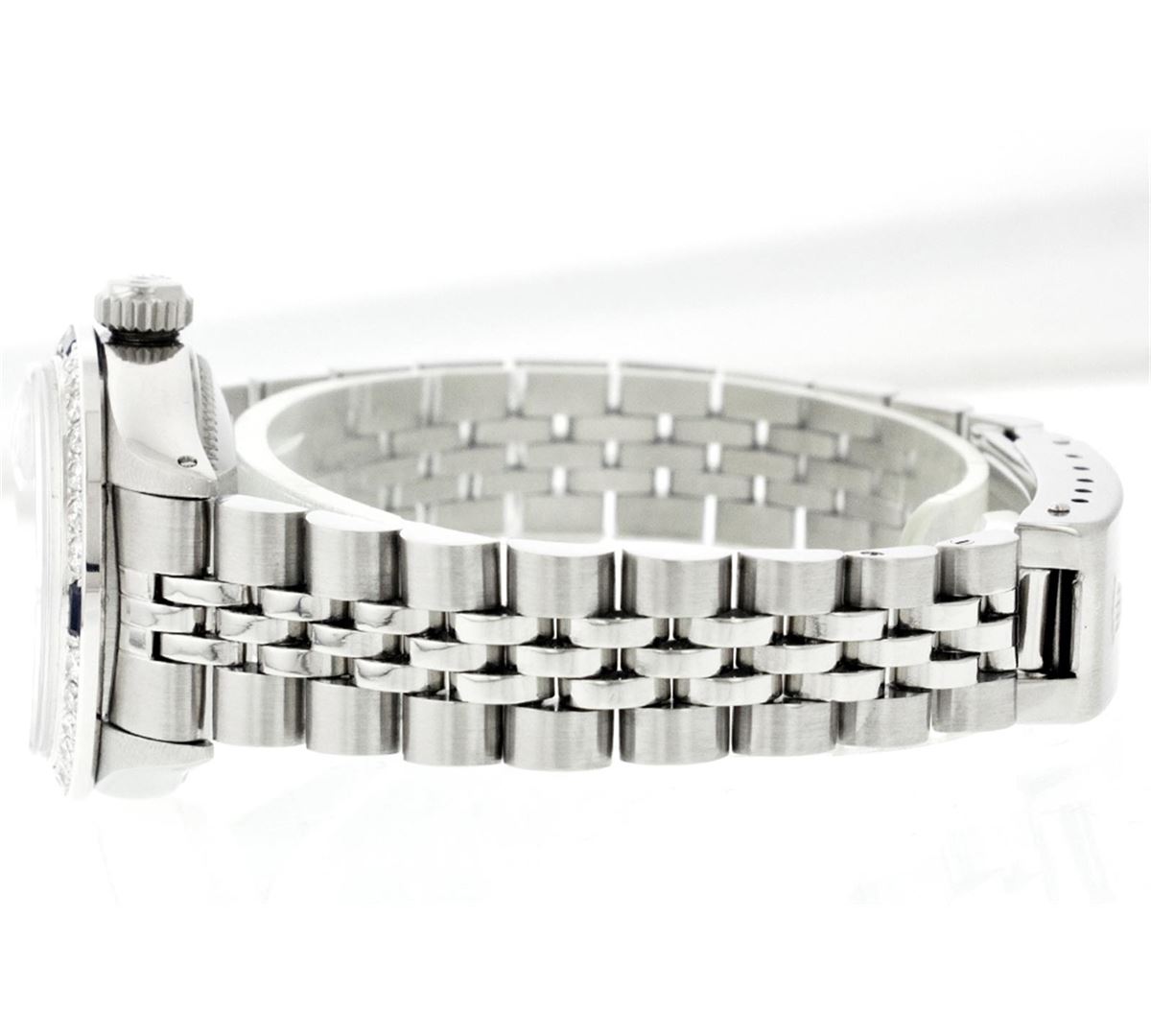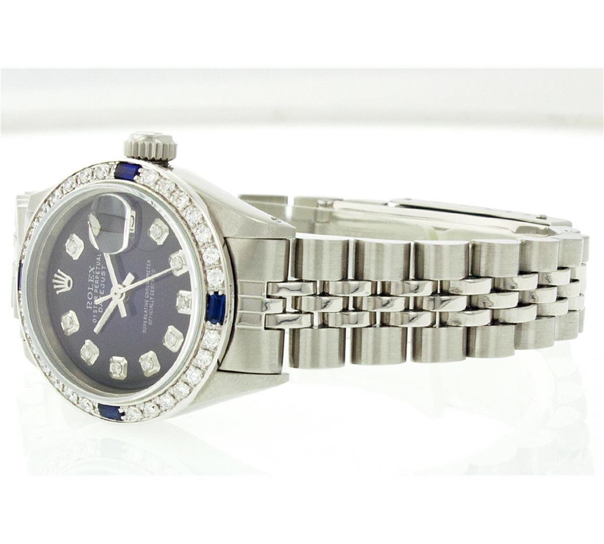 One Ladies Rolex Datejust Polished Bright with Satin Finish, Serviced & Electronically Tested, Stainless Steel Case: 26mm, Stainless Steel Crown, Custom Bezel: 18K White Gold Sapphire Beadset Diamond Bezel, Diamond + Gem Count: 28 Diamonds + 4 Sapphires Total Weight .70 Carat, Clarity: SI-VS, Color: G to H. Custom Crystal: Synthetic Sapphire Cyclops Lens. Movement: Automatic Winding Movement Caliber 2030. Original Custom Dial: Refinished Blue Vignette With Diamond Hour Markers, 10 Diamond in Dial G To H In Color, Clarity: SI-VS. Date Window: 3 O'Clock Position Date Display, Non Quickset, Model: 6917 Condition: G-6 Extra Fine. Bracelet: Stainless Steel Jubilee. Bright Polish & Satin Finish. 5.5 Inch Length, Adjustable. Standard Clasp, With Rolex Logo.