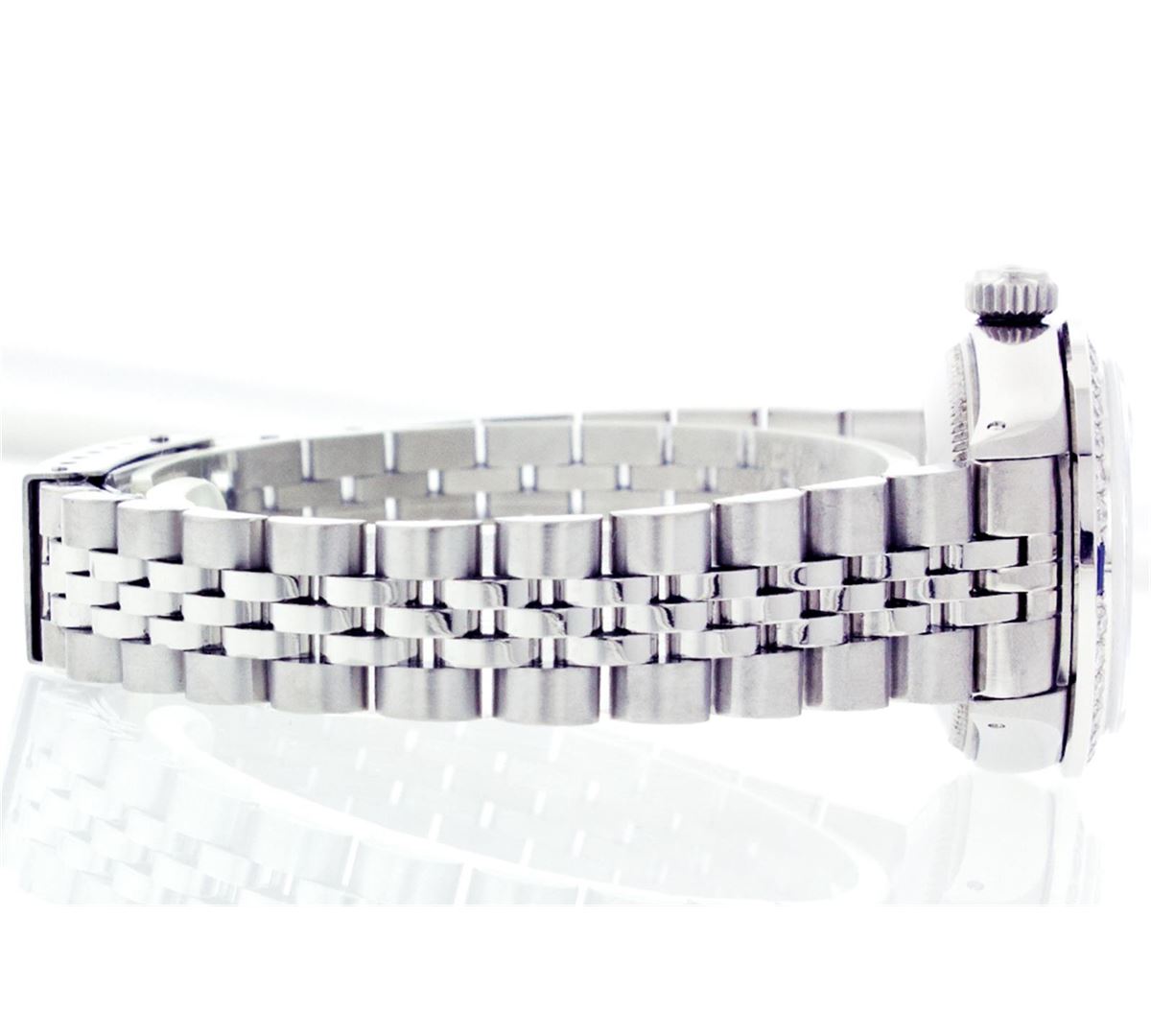 One Ladies Rolex Datejust Polished Bright with Satin Finish, Serviced & Electronically Tested, Stainless Steel Case:26mm, Stainless Steel Crown, Custom Bezel: 18K White Gold Sapphire Beadset Diamond Bezel, Diamond + Gem Count: 28 Diamonds + 4 Sapphires Total Weight .70 Carat, Clarity: Si-VS, Color: G to H. Custom Crystal: Synthetic Sapphire Cyclops Lens. Movement: Automatic Winding Movement Caliber 2030. Custom Dial: Ice Blue Roman Dial. Date Window: 3 O'Clock Position Date Display, Non Quickset, Model: 6917 Condition: G-6 Extra Fine. Bracelet: Stainless Steel Jubilee. Bright Polish & Satin Finish. 5.5 Inch Length, Adjustable. Standard Clasp, With Rolex Logo.