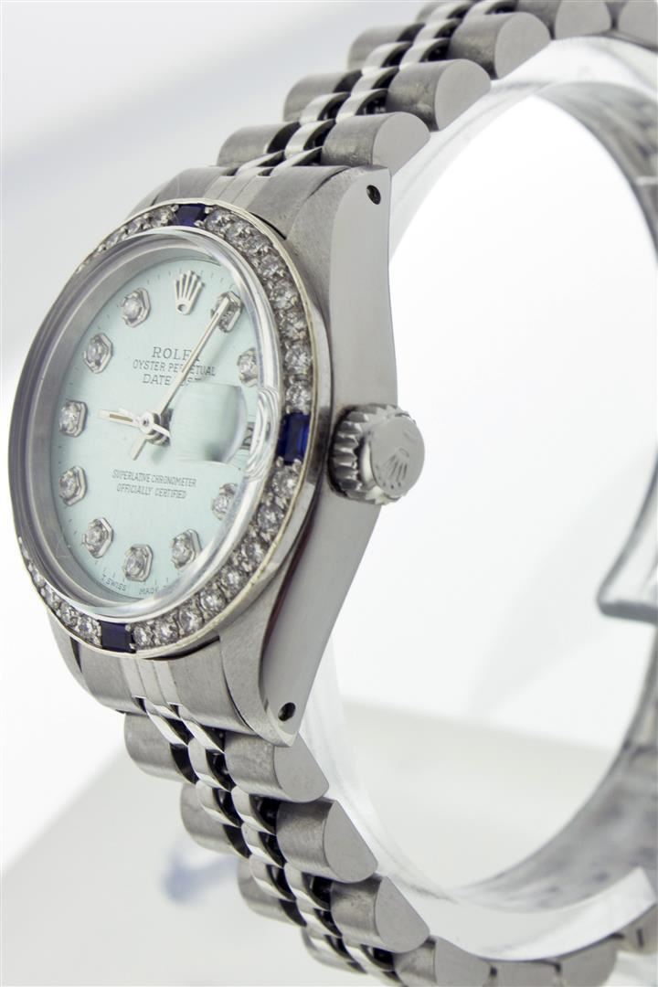 One Ladies Rolex Datejust Polished Bright with Satin Finish, Serviced & Electronically Tested, Stainless Steel Case:26mm, Stainless Steel Crown, Custom Bezel: 18K White Gold Sapphire Beadset Diamond Bezel, Diamond Count: 28 Diamonds + 4 Sapphires Total Weight .70 Carat, Clarity: SI-VS, Color: G to H. Custom Crystal: Synthetic Sapphire Cyclops Lens. Movement: Automatic Winding Movement Caliber 2030. Custom Dial: Ice Blue Diamond Dial, Diamond Count: 10 Diamonds In Dial, Clarity: SI-VS, Color: G to H. Date Window: 3 O'Clock Position Date Display, Non Quickset, Model: 6917 Condition: G-6 Extra Fine. Bracelet: Stainless Steel Jubilee Band. Bright Polish & Satin Finish. 5.5 Inch Length, Adjustable. Standard Clasp, With Rolex Logo.
