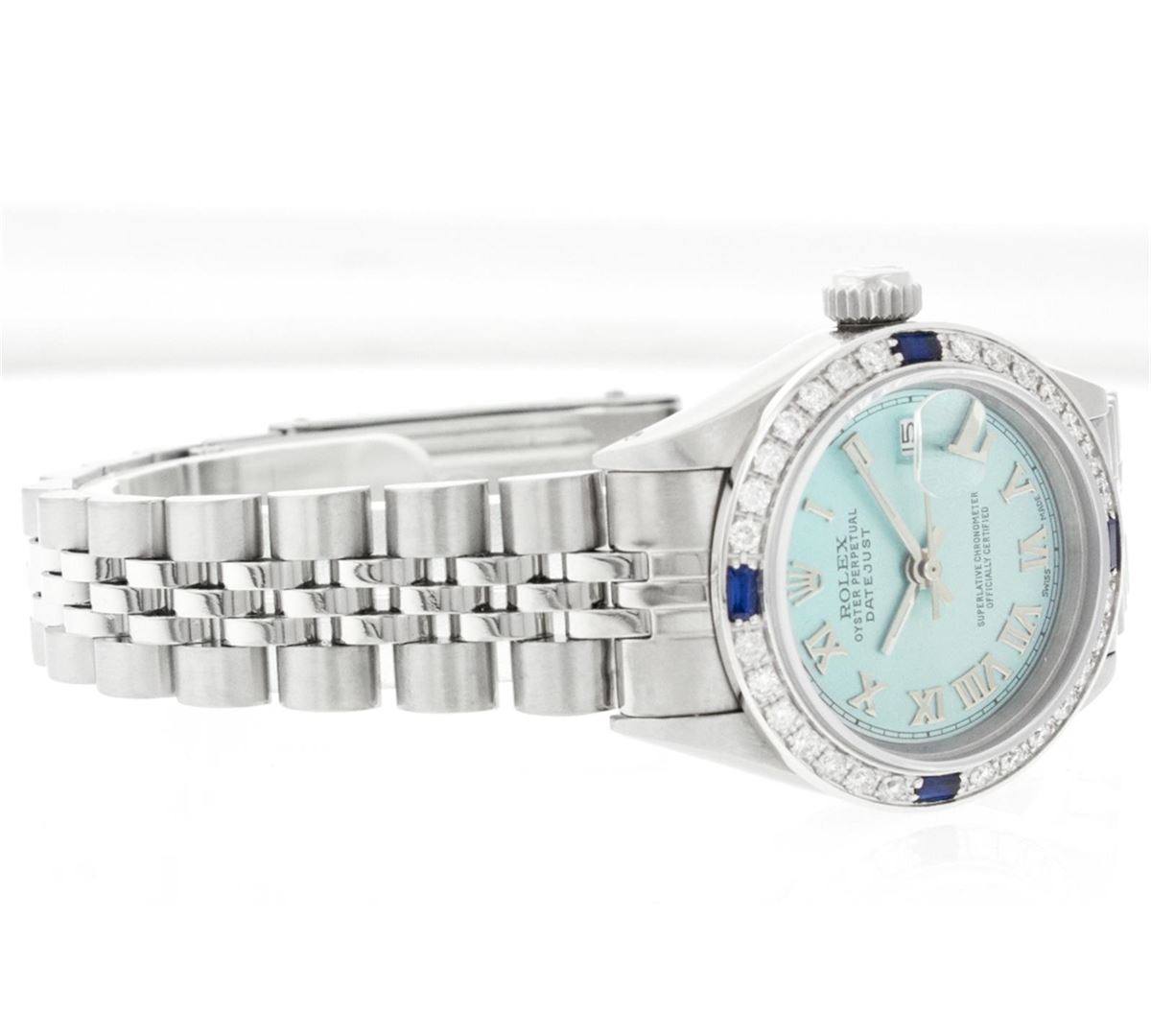One Ladies Rolex Datejust Polished Bright with Satin Finish, Serviced & Electronically Tested, Stainless Steel Case:26mm, Stainless Steel Crown, Custom Bezel: 18K White Gold Sapphire Beadset Diamond Bezel, Diamond + Gem Count: 28 Diamonds + 4 Sapphires Total Weight .70 Carat, Clarity: Si-VS, Color: G to H. Custom Crystal: Synthetic Sapphire Cyclops Lens. Movement: Automatic Winding Movement Caliber 2030. Custom Dial: Ice Blue Roman Dial. Date Window: 3 O'Clock Position Date Display, Non Quickset, Model: 6917 Condition: G-6 Extra Fine. Bracelet: Stainless Steel Jubilee. Bright Polish & Satin Finish. 5.5 Inch Length, Adjustable. Standard Clasp, With Rolex Logo.