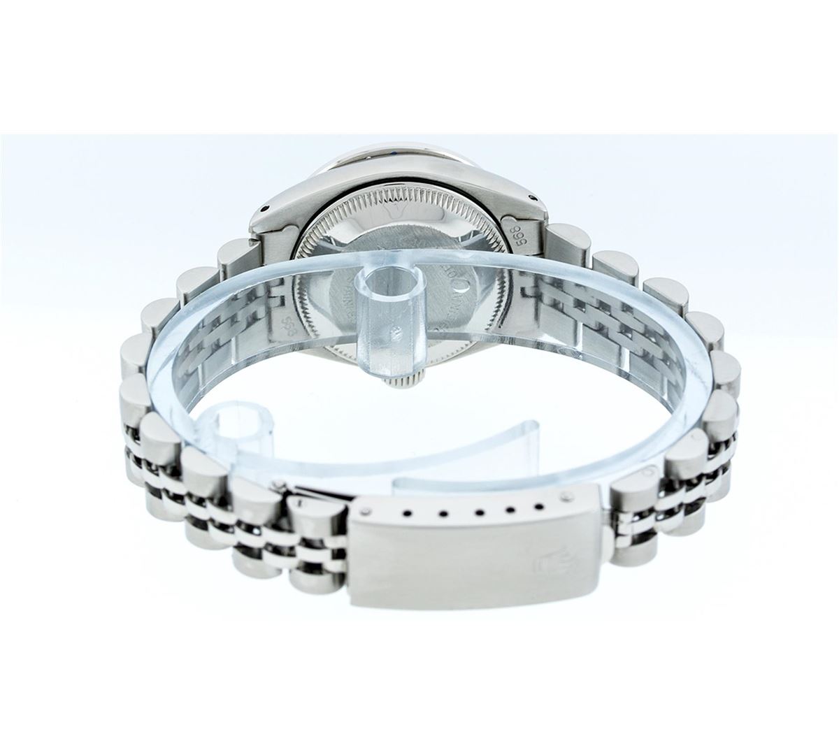 One Ladies Rolex Datejust Polished Bright with Satin Finish, Serviced & Electronically Tested, Stainless Steel Case:26mm, Stainless Steel Crown, Custom Bezel: 18K White Gold Sapphire Beadset Diamond Bezel, Diamond Count: 28 Diamonds + 4 Sapphires Total Weight .70 Carat, Clarity: SI-VS, Color: G to H. Custom Crystal: Synthetic Sapphire Cyclops Lens. Movement: Automatic Winding Movement Caliber 2030. Custom Dial: Ice Blue Diamond Dial With Line Track, Diamond Count: 10 Diamonds In Dial, Clarity: SI-VS, Color: G to H. Date Window: 3 O'Clock Position Date Display, Model: Datejust. Condition: G-6 Extra Fine. Bracelet: Stainless Steel Jubilee Band. Bright Polish & Satin Finish. 6.0 Inch Length, Adjustable. Standard Clasp, With Rolex Logo. Comes with 6 month warranty.