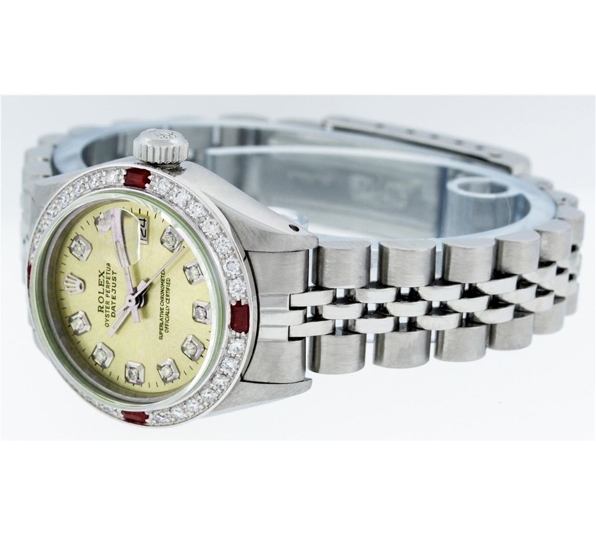 Ladies Rolex Datejust Polished Bright with Satin Finish, Serviced & Electronically Tested, Stainless Steel Case:26mm, Stainless Steel Crown, Custom Bezel: 18K White Gold Ruby Beadset Diamond Bezel, Diamond + Gem Count: 28 Diamonds + 4 Ruby. Total Weight .70 Carat, Clarity: SI-VS, Color: G to H. Custom Crystal: Synthetic Sapphire Cyclops Lens. Movement: Automatic Winding Movement Caliber 2030. Custom Dial: Refinished Yellow With Diamond Hour Markers. Diamond Count: 10 Diamonds, Color: G To H, Clarity: SI-VS. Date Window: 3 O'Clock Position Date Display, Model: Datejust. Condition: G-6 Extra Fine. Bracelet: Stainless Steel Jubilee. Bright Polish & Satin Finish. 6.0 Inch Length, Adjustable. Standard Clasp, With Rolex Logo. Comes with 6 month warranty.
