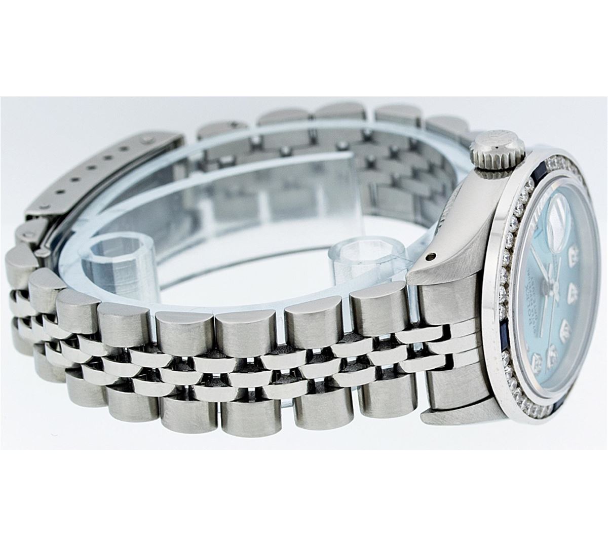 One Ladies Rolex Datejust Polished Bright with Satin Finish, Serviced & Electronically Tested, Stainless Steel Case:26mm, Stainless Steel Crown, Custom Bezel: 18K White Gold Sapphire Channel Set Diamond Bezel, Diamond + Gem Count: 36 Diamonds + 4 Sapphires Total Weight 1.00 Carat, Clarity: SI-VS, Color: G to H. Custom Crystal: Synthetic Sapphire Cyclops Lens. Movement: Automatic Winding Movement Caliber 2030. Custom Dial: Ice Blue Diamond Dial, Diamond Count: 10 Diamonds, Clarity: SI-VS, Color: G to H. Date Window: 3 O'Clock Position. Date Display, Model: Datejust, Condition: G-6 Extra Fine. Bracelet: Stainless Steel Jubilee. Bright Polish & Satin Finish. 6.0 Inch Length, Adjustable. Standard Clasp, With Rolex Logo. Comes with 6 month warranty.
