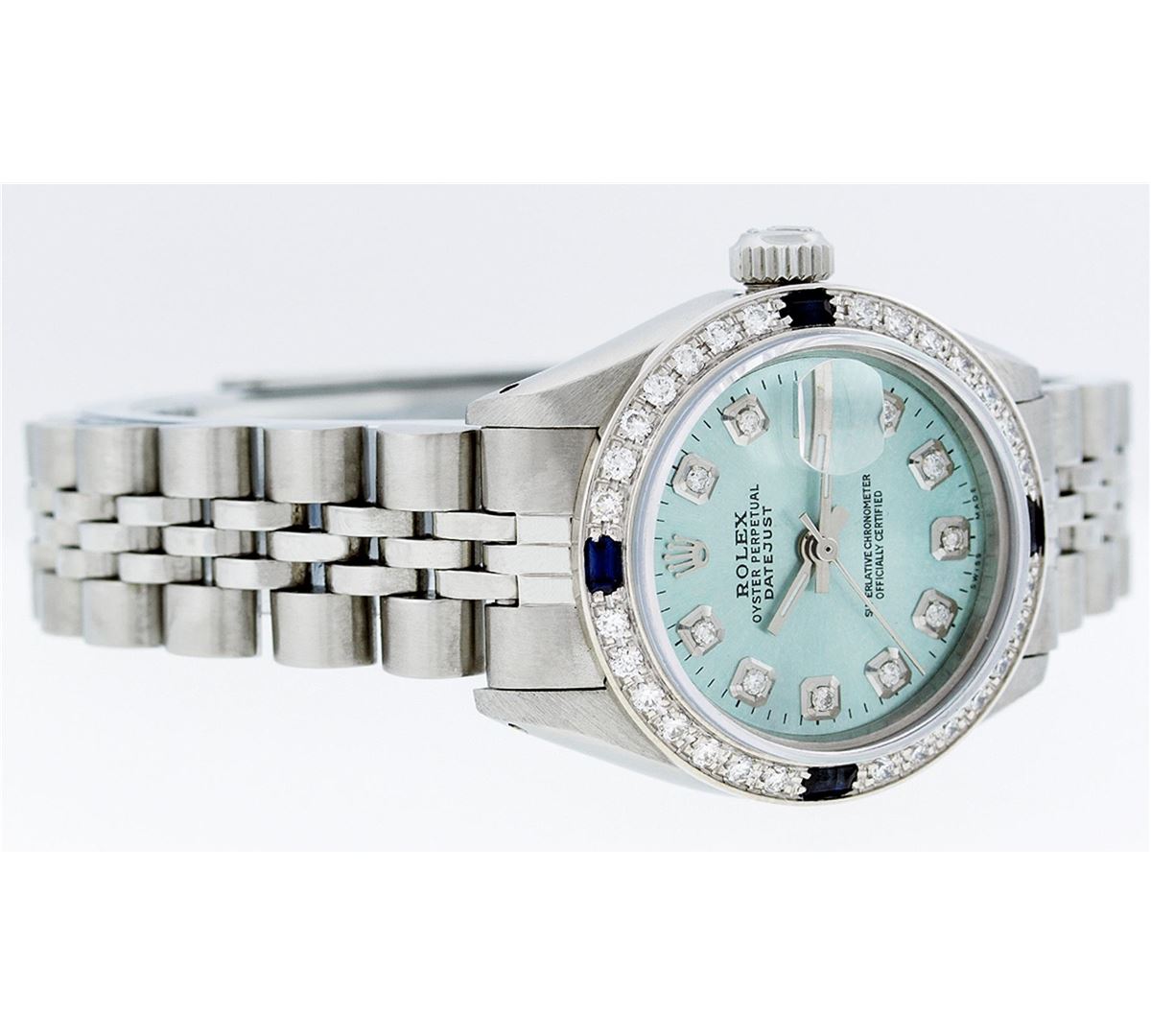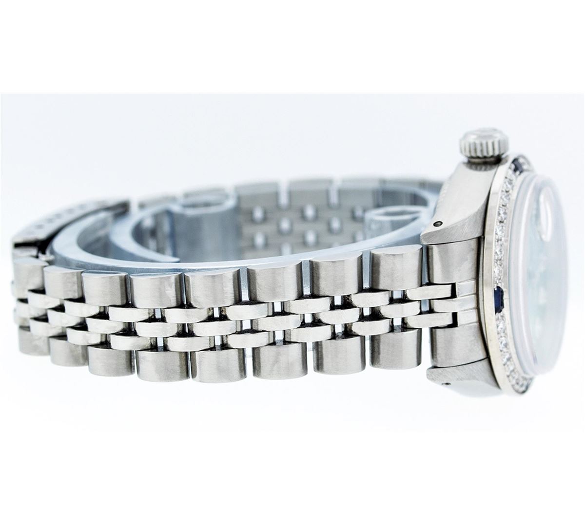 One Ladies Rolex Datejust Polished Bright with Satin Finish, Serviced & Electronically Tested, Stainless Steel Case:26mm, Stainless Steel Crown, Custom Bezel: 18K White Gold Sapphire Beadset Diamond Bezel, Diamond Count: 28 Diamonds + 4 Sapphires Total Weight .70 Carat, Clarity: SI-VS, Color: G to H. Custom Crystal: Synthetic Sapphire Cyclops Lens. Movement: Automatic Winding Movement Caliber 2030. Custom Dial: Ice Blue Diamond Dial With Line Track, Diamond Count: 10 Diamonds In Dial, Clarity: SI-VS, Color: G to H. Date Window: 3 O'Clock Position Date Display, Model: Datejust. Condition: G-6 Extra Fine. Bracelet: Stainless Steel Jubilee Band. Bright Polish & Satin Finish. 6.0 Inch Length, Adjustable. Standard Clasp, With Rolex Logo. Comes with 6 month warranty.