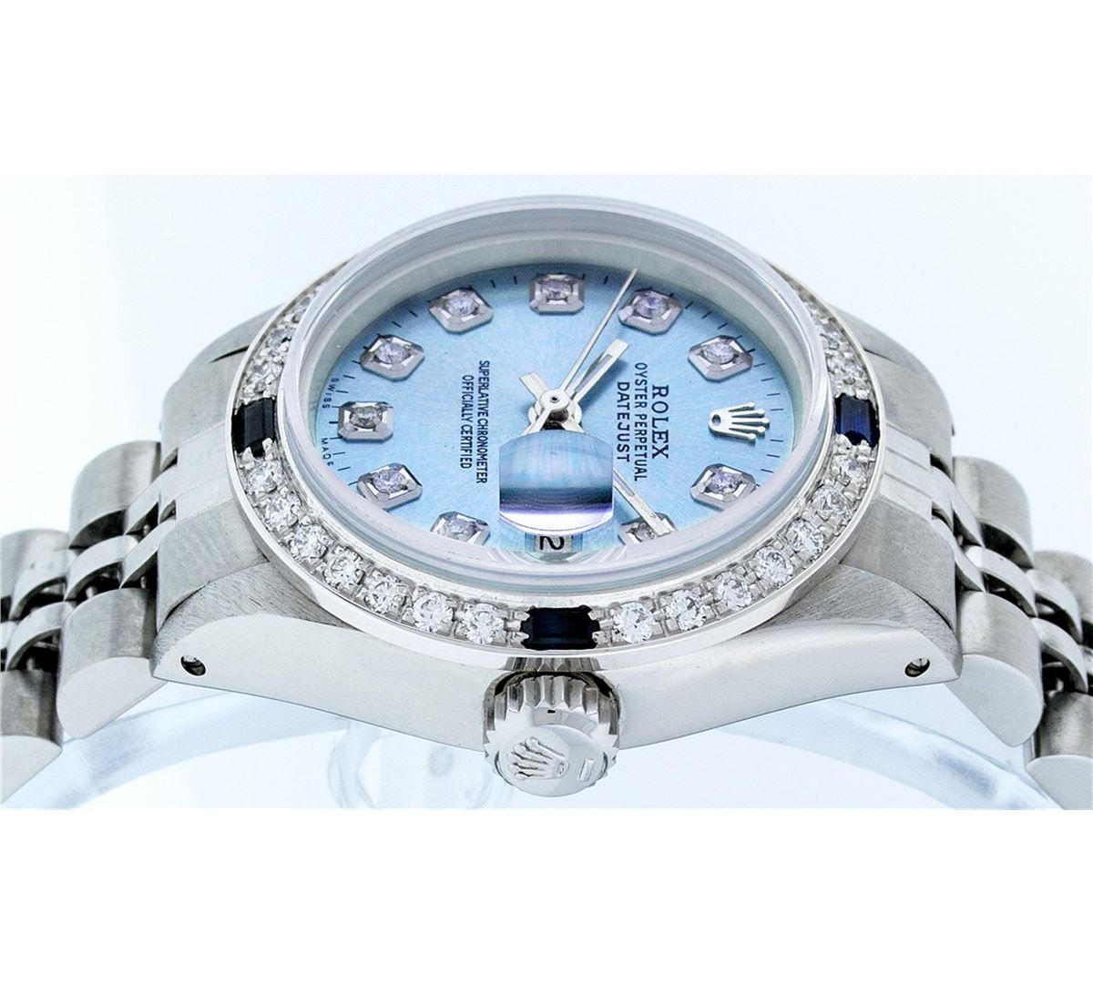 Ladies Rolex Datejust Polished Bright with Satin Finish, Serviced & Electronically Tested, Stainless Steel Case:26mm, Stainless Steel Crown, Custom Bezel: 18K White Gold Sapphire Beadset Diamond Bezel, Diamond + Gem Count: 28 Diamonds + 4 Sapphire. Total Weight .70 Carat, Clarity: SI-VS, Color: G to H. Custom Crystal: Synthetic Sapphire Cyclops Lens. Movement: Automatic Winding Movement Caliber 2030. Custom Dial: Refinished Sky Blue With Diamond Hour Markers. Diamond Count: 10 Diamonds, Color: G To H, Clarity: SI-VS. Date Window: 3 O'Clock Position Date Display, Model: Datejust. Condition: G-6 Extra Fine. Bracelet: Stainless Steel Jubilee. Bright Polish & Satin Finish. 6.0 Inch Length, Adjustable. Standard Clasp, With Rolex Logo. Comes with 6 month warranty.