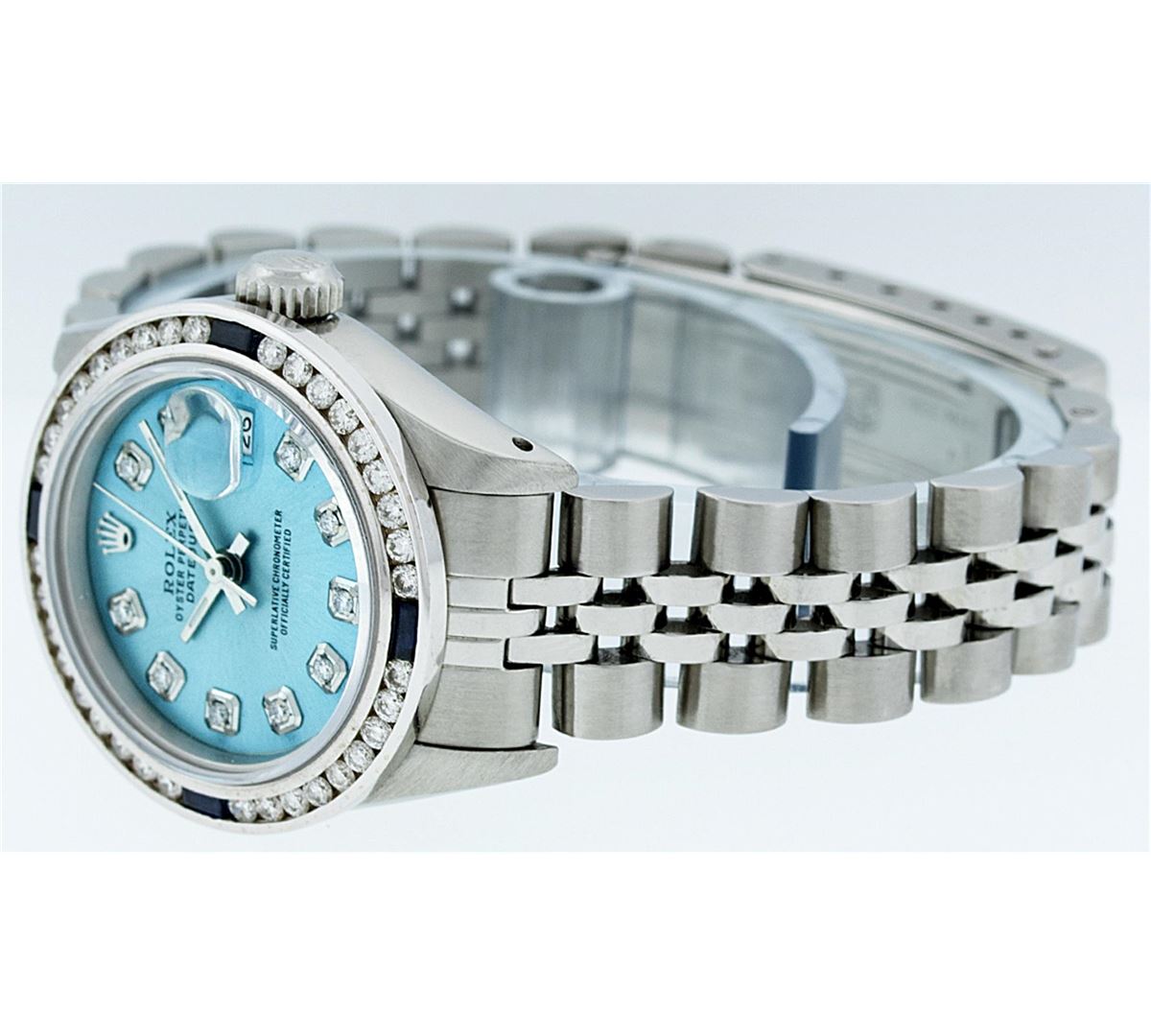 One Ladies Rolex Datejust Polished Bright with Satin Finish, Serviced & Electronically Tested, Stainless Steel Case:26mm, Stainless Steel Crown, Custom Bezel: 18K White Gold Sapphire Channel Set Diamond Bezel, Diamond + Gem Count: 36 Diamonds + 4 Sapphires Total Weight 1.00 Carat, Clarity: SI-VS, Color: G to H. Custom Crystal: Synthetic Sapphire Cyclops Lens. Movement: Automatic Winding Movement Caliber 2030. Custom Dial: Ice Blue Diamond Dial, Diamond Count: 10 Diamonds, Clarity: SI-VS, Color: G to H. Date Window: 3 O'Clock Position. Date Display, Model: Datejust, Condition: G-6 Extra Fine. Bracelet: Stainless Steel Jubilee. Bright Polish & Satin Finish. 6.0 Inch Length, Adjustable. Standard Clasp, With Rolex Logo. Comes with 6 month warranty.