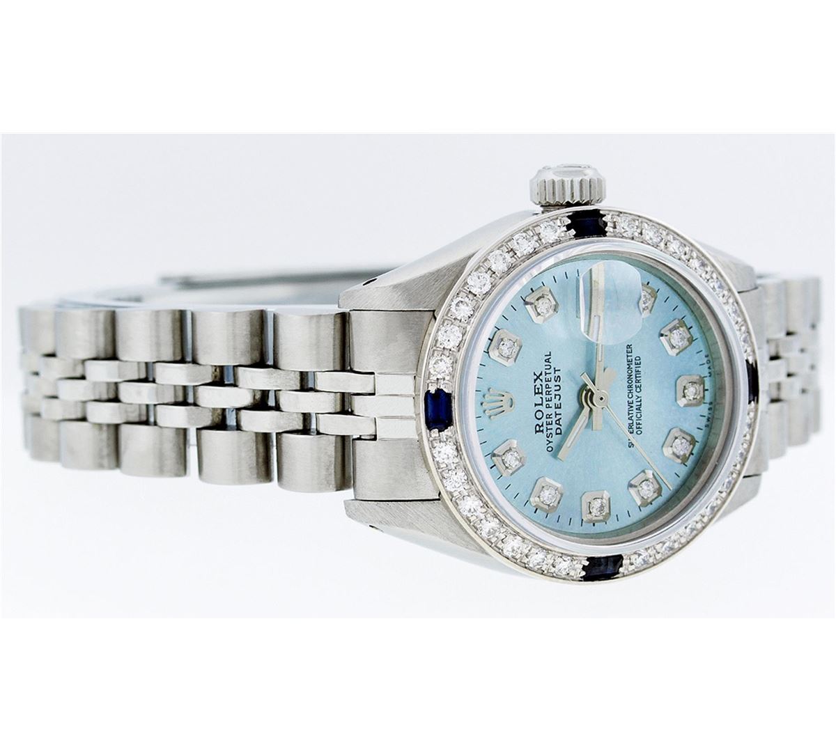 Ladies Rolex Datejust Polished Bright with Satin Finish, Serviced & Electronically Tested, Stainless Steel Case:26mm, Stainless Steel Crown, Custom Bezel: 18K White Gold Sapphire Beadset Diamond Bezel, Diamond + Gem Count: 28 Diamonds + 4 Sapphire. Total Weight .70 Carat, Clarity: SI-VS, Color: G to H. Custom Crystal: Synthetic Sapphire Cyclops Lens. Movement: Automatic Winding Movement Caliber 2030. Custom Dial: Refinished Sky Blue With Diamond Hour Markers. Diamond Count: 10 Diamonds, Color: G To H, Clarity: SI-VS. Date Window: 3 O'Clock Position Date Display, Model: Datejust. Condition: G-6 Extra Fine. Bracelet: Stainless Steel Jubilee. Bright Polish & Satin Finish. 6.0 Inch Length, Adjustable. Standard Clasp, With Rolex Logo. Comes with 6 month warranty.