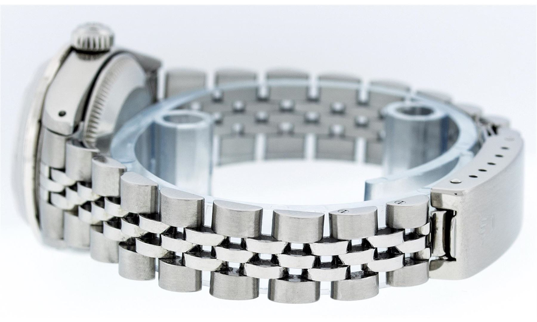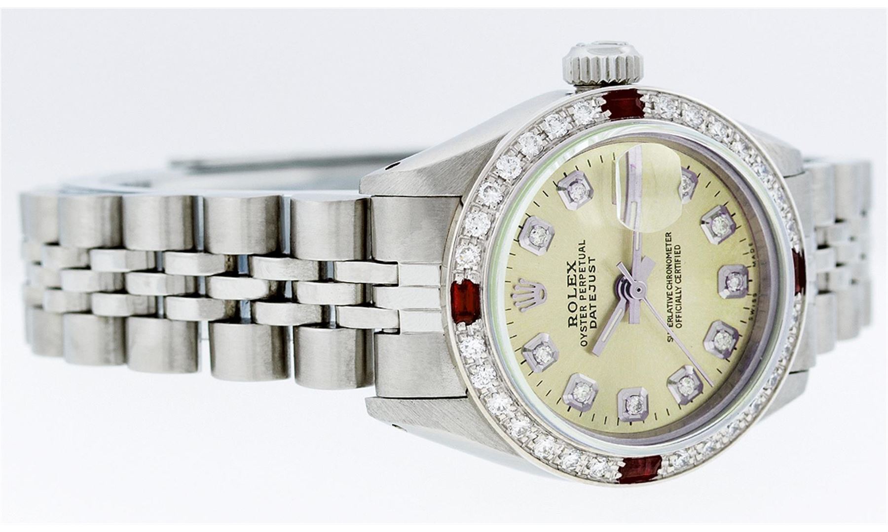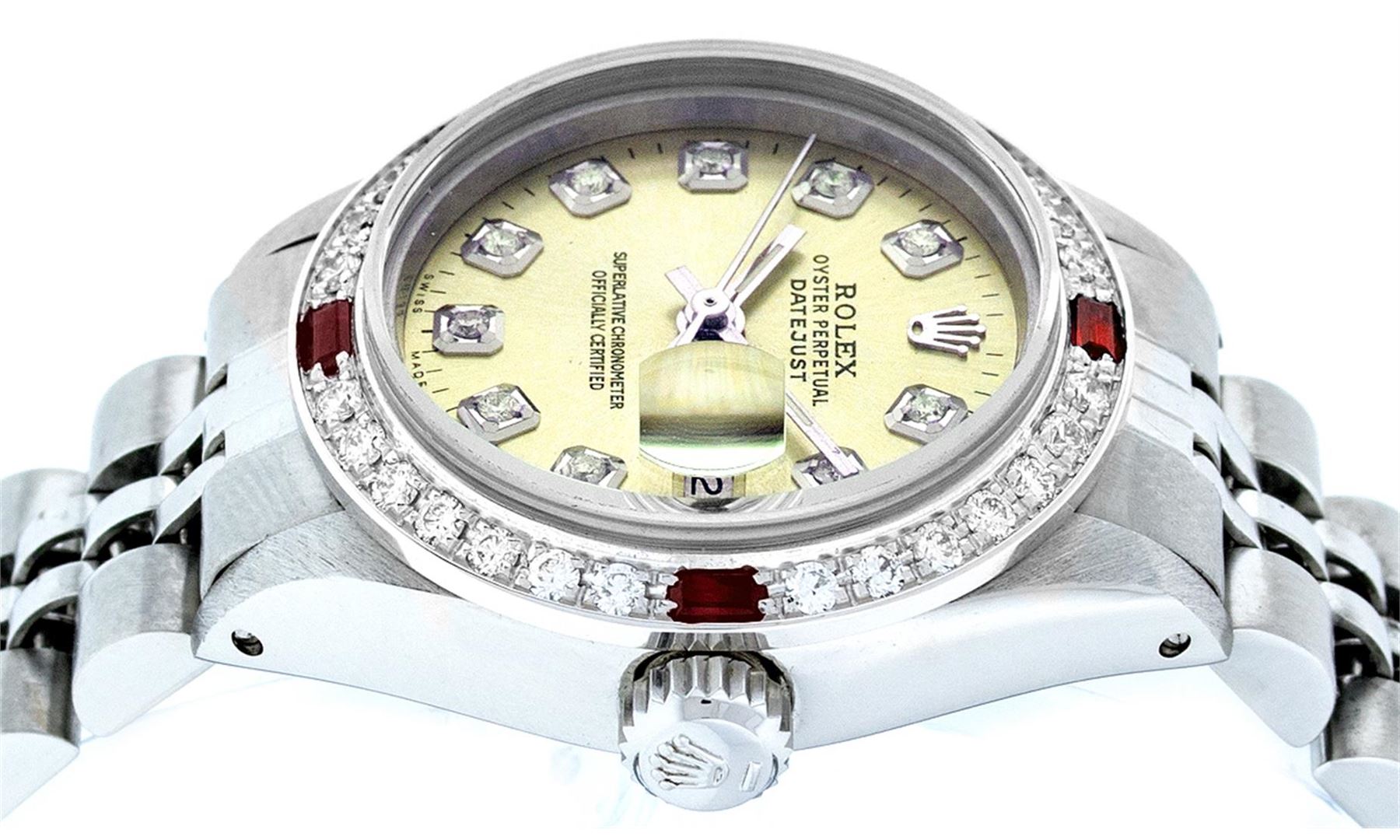 Ladies Rolex Datejust Polished Bright with Satin Finish, Serviced & Electronically Tested, Stainless Steel Case:26mm, Stainless Steel Crown, Custom Bezel: 18K White Gold Ruby Beadset Diamond Bezel, Diamond + Gem Count: 28 Diamonds + 4 Ruby. Total Weight .70 Carat, Clarity: SI-VS, Color: G to H. Custom Crystal: Synthetic Sapphire Cyclops Lens. Movement: Automatic Winding Movement Caliber 2030. Custom Dial: Refinished Yellow With Diamond Hour Markers. Diamond Count: 10 Diamonds, Color: G To H, Clarity: SI-VS. Date Window: 3 O'Clock Position Date Display, Model: Datejust. Condition: G-6 Extra Fine. Bracelet: Stainless Steel Jubilee. Bright Polish & Satin Finish. 6.0 Inch Length, Adjustable. Standard Clasp, With Rolex Logo. Comes with 6 month warranty.