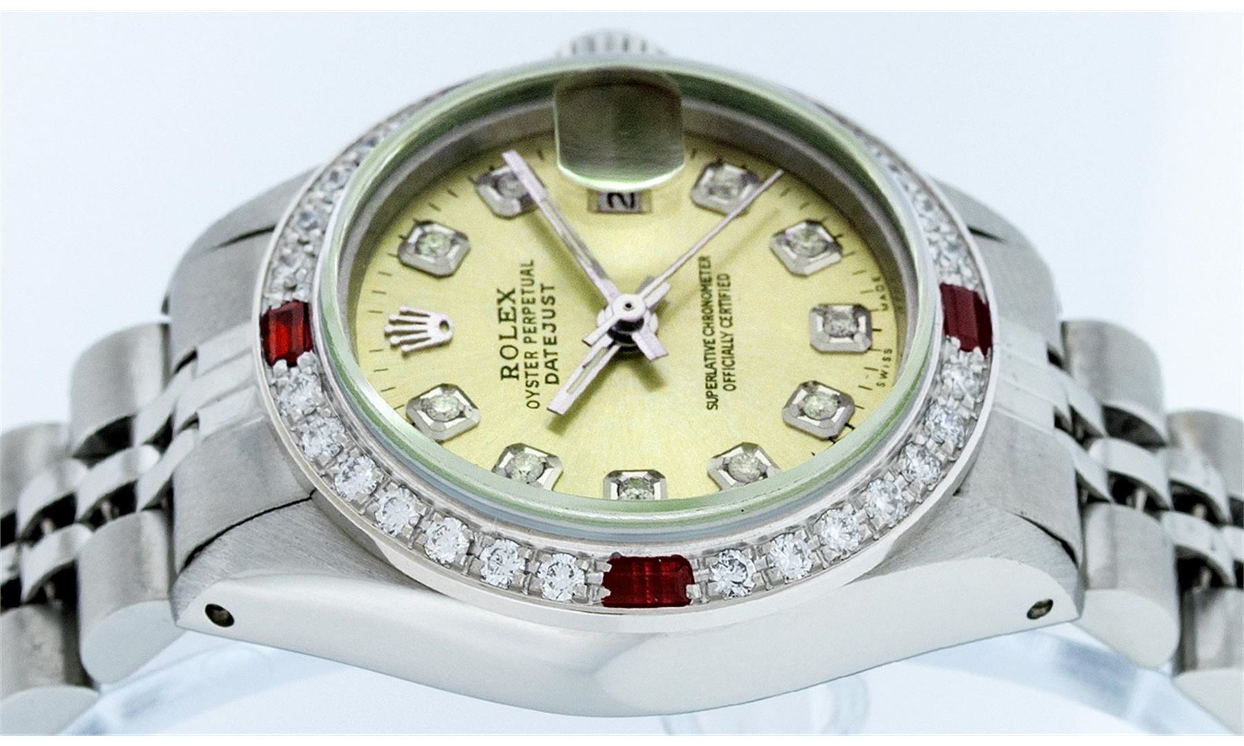 Ladies Rolex Datejust Polished Bright with Satin Finish, Serviced & Electronically Tested, Stainless Steel Case:26mm, Stainless Steel Crown, Custom Bezel: 18K White Gold Ruby Beadset Diamond Bezel, Diamond + Gem Count: 28 Diamonds + 4 Ruby. Total Weight .70 Carat, Clarity: SI-VS, Color: G to H. Custom Crystal: Synthetic Sapphire Cyclops Lens. Movement: Automatic Winding Movement Caliber 2030. Custom Dial: Refinished Yellow With Diamond Hour Markers. Diamond Count: 10 Diamonds, Color: G To H, Clarity: SI-VS. Date Window: 3 O'Clock Position Date Display, Model: Datejust. Condition: G-6 Extra Fine. Bracelet: Stainless Steel Jubilee. Bright Polish & Satin Finish. 6.0 Inch Length, Adjustable. Standard Clasp, With Rolex Logo. Comes with 6 month warranty.