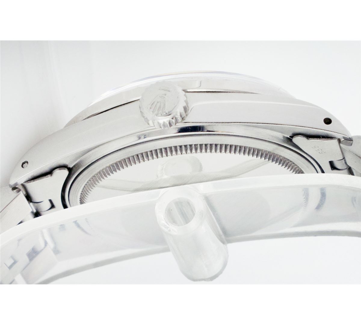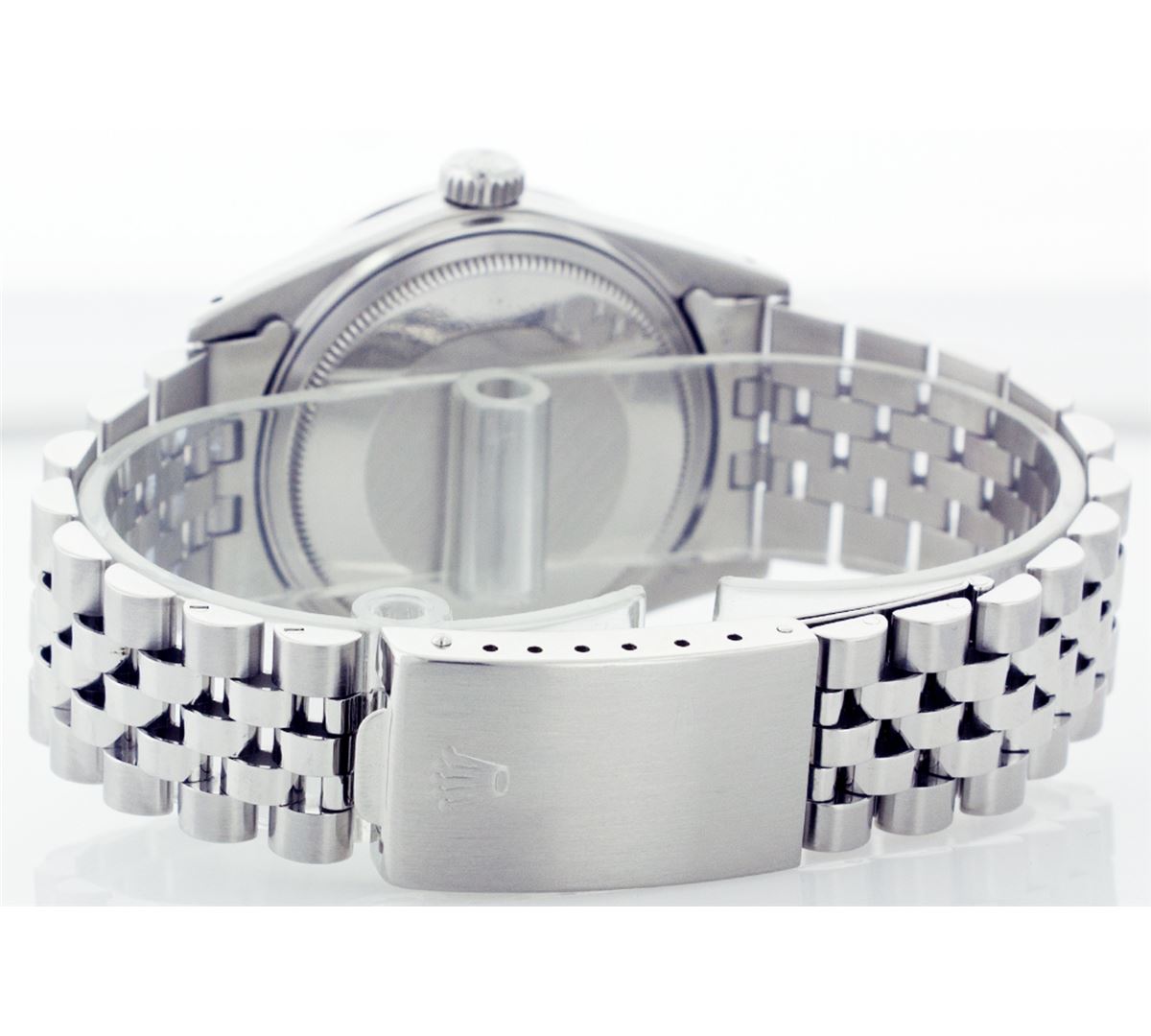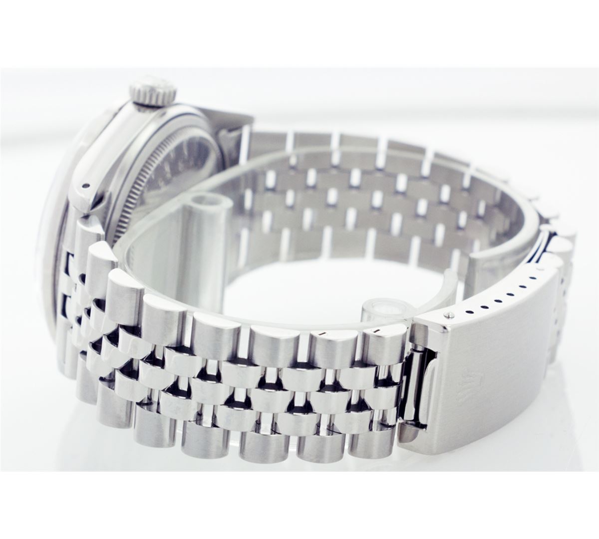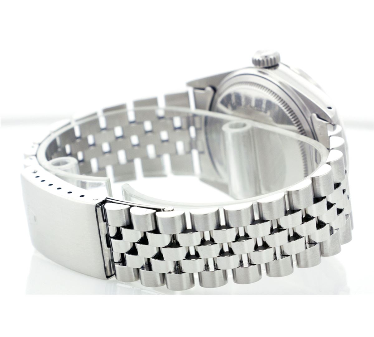 One Gents Rolex Datejust Polished Bright with Satin Finish, Serviced & Electronically Tested, Stainless Steel Case: 36mm, Stainless Steel Crown, Custom Bezel: 18K White Gold Sapphire Beadset Diamond Bezel, Diamond + Gem Count: 36 Diamonds + 4 Sapphires Total Weight 1.00 Carat, Clarity: SI-VS, Color: G to H. Custom Crystal: Synthetic Sapphire Cyclops Lens. Movement: Automatic Winding Movement Caliber 3035. Custom Dial: Slate Grey With Diamond Hour Markers, 10 Diamond Dial G To H In Color, Clarity: SI-VS. Date Window: 3 O'Clock Position Date Display, Quickset, Model: 16014 Condition: G-6 Extra Fine. Bracelet: Stainless Steel Jubilee. Bright Polish & Satin Finish. 6.5 Inch Length, Adjustable. Standard Clasp, With Rolex Logo.