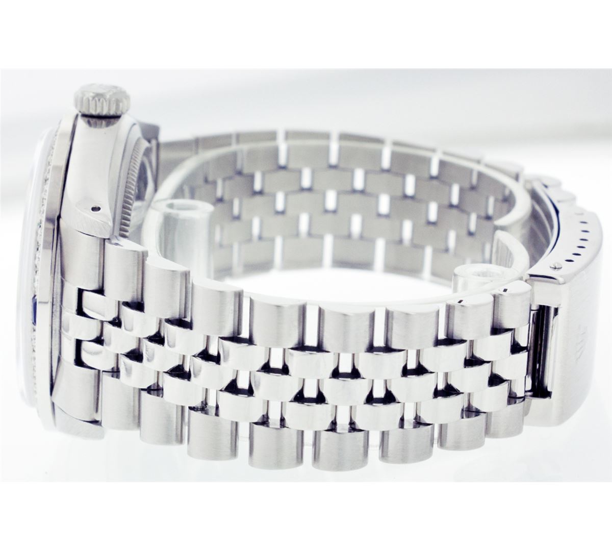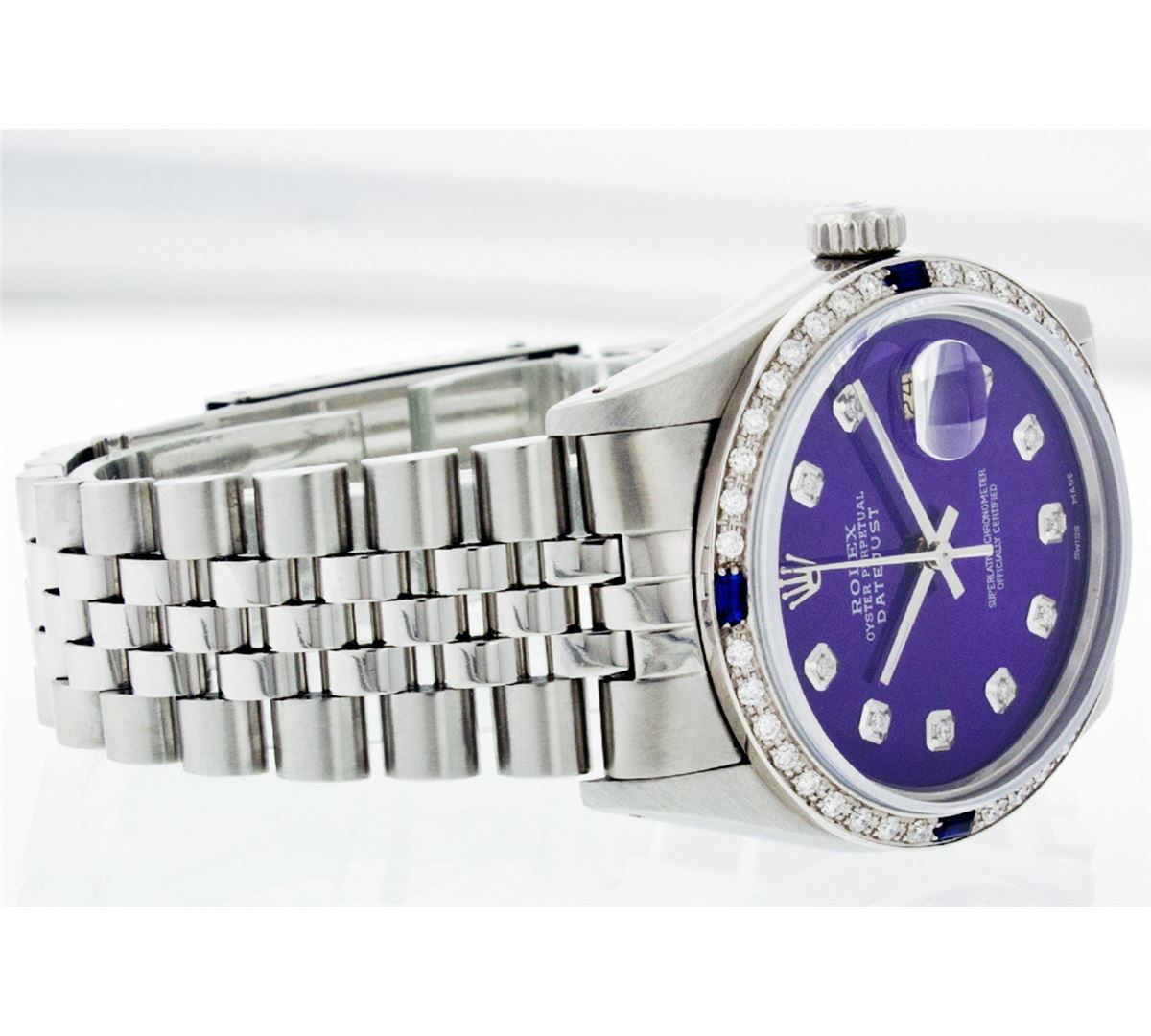 One Gents Rolex Datejust Polished Bright with Satin Finish, Serviced & Electronically Tested, Stainless Steel Case: 36mm, Stainless Steel Crown, Custom Bezel: 18K White Gold Sapphire Beadset Diamond Bezel, Diamond + Gem Count: 36 Diamonds + 4 Sapphires Total Weight 1.00 Carat, Clarity: SI-VS, Color: G to H. Custom Crystal: Synthetic Sapphire Cyclops Lens. Movement: Automatic Winding Movement Caliber 3035. Custom Dial: Purple With Diamond Hour Markers, 10 Diamond Dial G To H In Color. Date Window: 3 O'Clock Position Date Display, Quickset, Model: 16014 Condition: G-6 Extra Fine. Bracelet: Stainless Steel Jubilee. Bright Polish & Satin Finish. 6.5 Inch Length, Adjustable. Standard Clasp, With Rolex Logo.