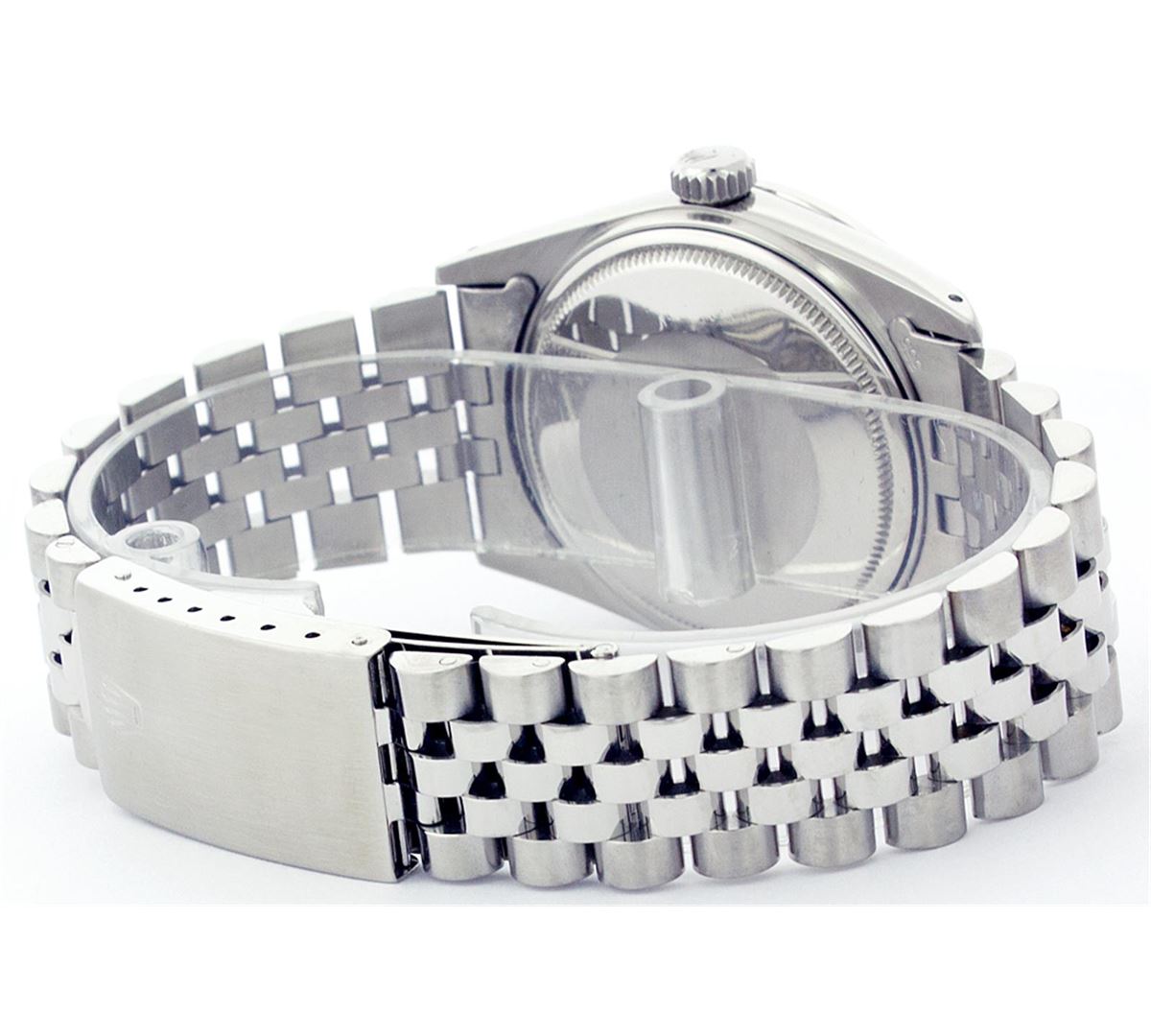 One Gents Rolex Datejust Polished, Serviced & Electronically Tested, Stainless Steel Case:36mm, Stainless Steel Crown, Custom Bezel: 18K White Gold Sapphire Beadset Diamond Bezel, Diamond + Gem Count: 36 Diamonds + 4 Sapphires Total Weight 1.00 Carat, Clarity: SI-VS, Color: G to H. Custom Crystal: Synthetic Sapphire Cyclops Lens. Movement: Automatic Winding Movement Caliber 3035. Custom Dial: Mother Of Pearl With Diamond Hour Markers, 8 Diamond + 2 Sapphire Baguettes In Dial G To H In Color, Clarity: SI-VS. Date Window: 3 O'Clock Position Date Display, Quickset, Model: 16014 Condition: G-6 Extra Fine. Bracelet: Stainless Steel Jubilee. Bright Polish & Satin Finish. 6.5 Inch Length, Adjustable. Standard Clasp, With Rolex Logo.