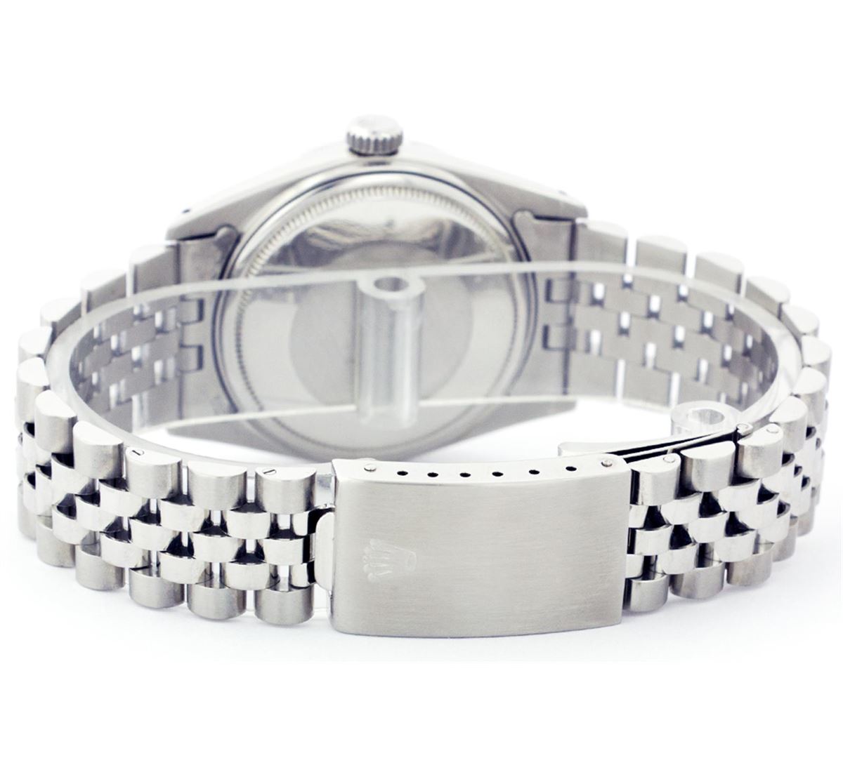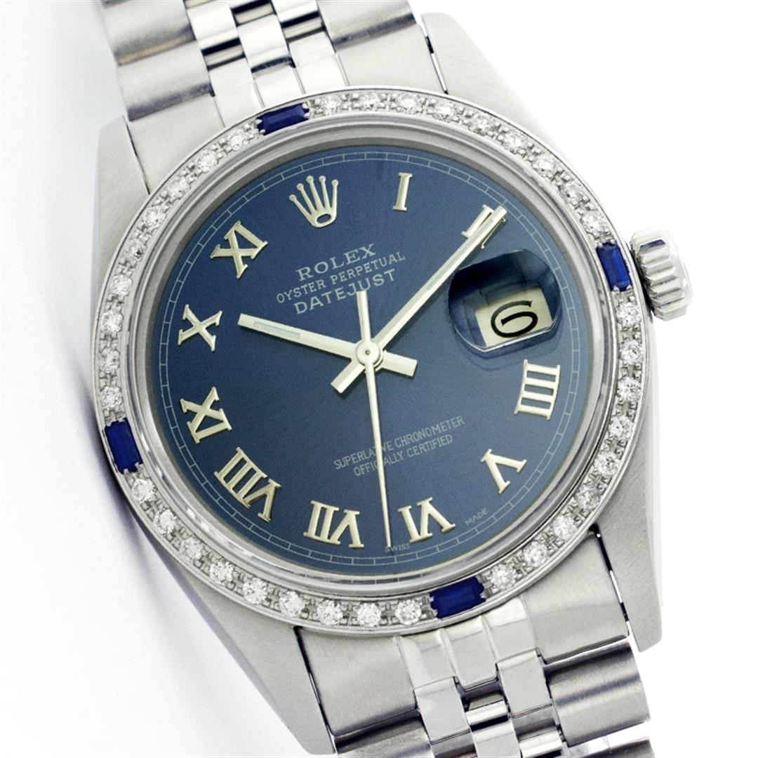 One Gents Rolex Datejust Polished, Serviced & Electronically Tested, Stainless Steel Case:36mm, Stainless Steel Crown, Custom Bezel: 18K White Gold Sapphire Beadset Diamond Bezel, Diamond + Gem Count: 36 Diamonds + 4 Sapphires Total Weight 1.00 Carat, Clarity: SI-VS, Color: G to H. Custom Crystal: Synthetic Sapphire Cyclops Lens. Movement: Automatic Winding Movement Caliber 3035. Custom Dial: Blue With Roman Hour Markers. Date Window: 3 O'Clock Position Date Display, Quickset, Model: 16014 Condition: G-6 Extra Fine. Bracelet: Stainless Steel Jubilee. Bright Polish & Satin Finish. 6.5 Inch Length, Adjustable. Standard Clasp, With Rolex Logo.