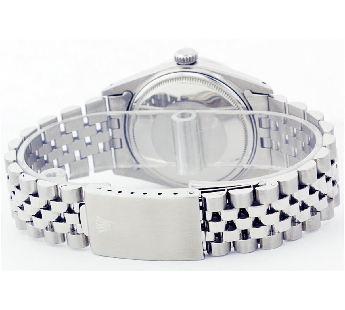 One Mens Rolex Datejust Polished, Serviced & Electronically Tested, Stainless Steel Case:36mm, Stainless Steel Crown, Custom Bezel: 18K White Gold Sapphire Beadset Diamond Bezel, Diamond + Gem Count: 36 Diamonds + 4 Sapphires Total Weight 1.00 Carat, Clarity: SI-VS, Color: G to H. Custom Crystal: Synthetic Sapphire Cyclops Lens. Movement: Automatic Winding Movement Caliber 3035. Custom Dial: Tahitian Mother Of Pearl With String Diamond Dial, Diamond Count: 43 Diamonds In Dial, Clarity: SI-VS, Color: G to H. Date Window: 3 O'Clock Position Date Display, Quickset, Model: 16014 Condition: G-6 Extra Fine. Bracelet: Stainless Steel Jubilee. Bright Polish & Satin Finish. 6.5 Inch Length, Adjustable. Standard Clasp, With Rolex Logo.